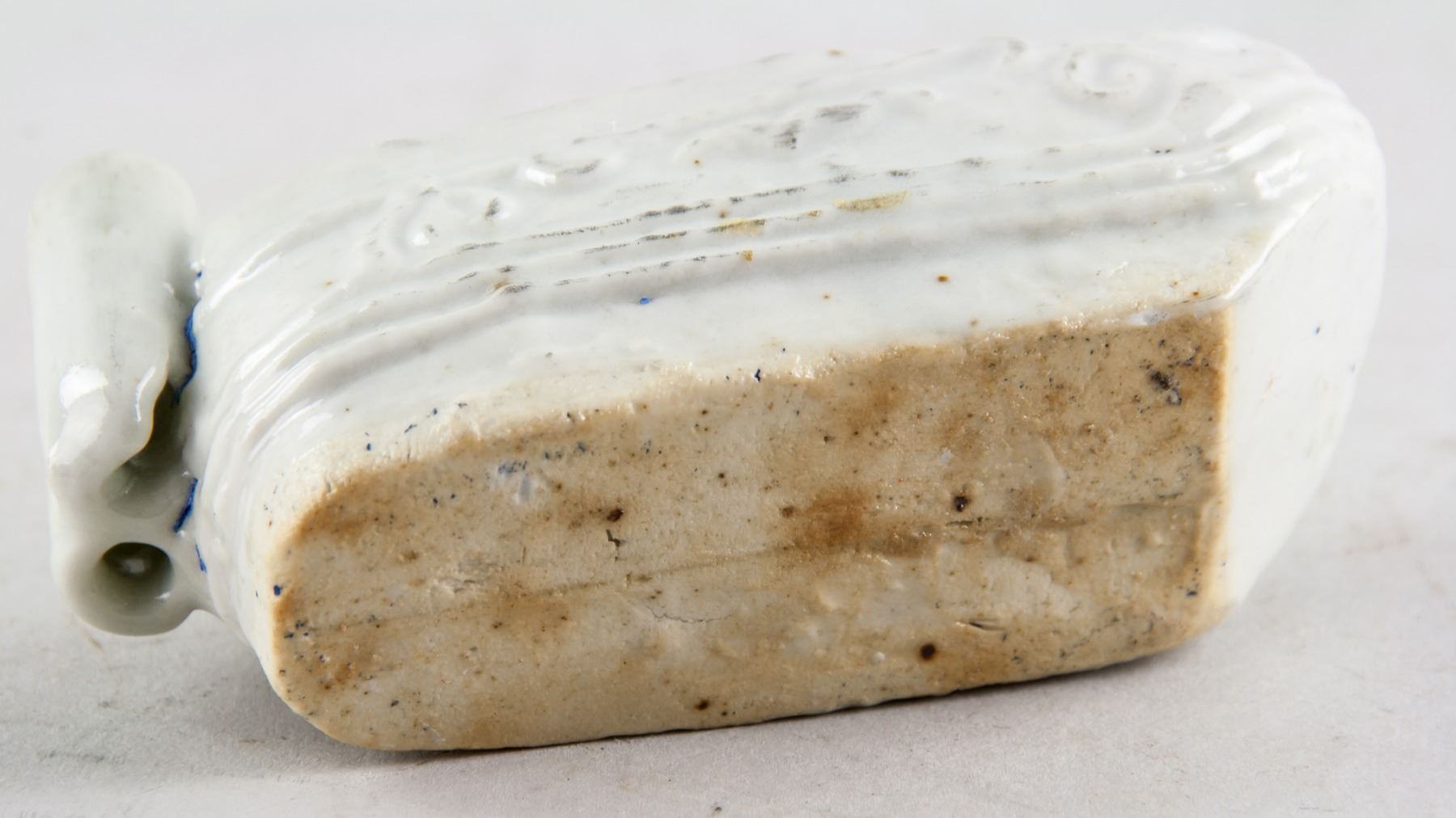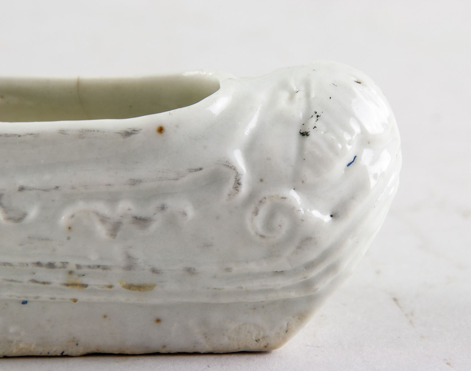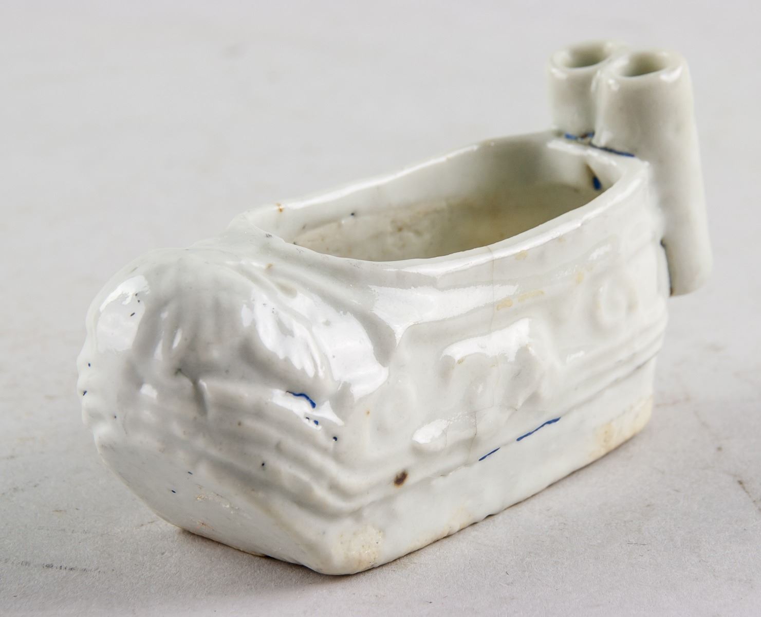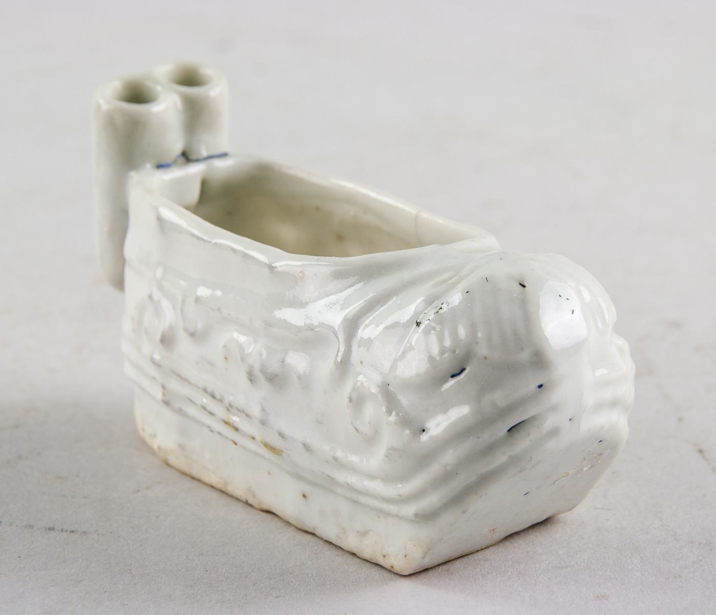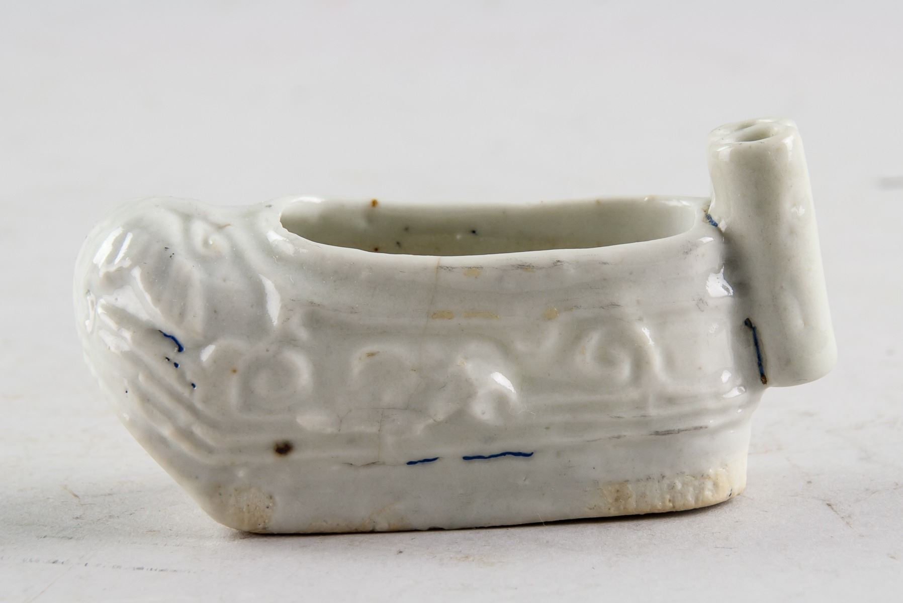 Chinese white porcelain water pot, of shoe form, with brush holders on back, 4.5 x 9 x 3.5 cm, 70 grams