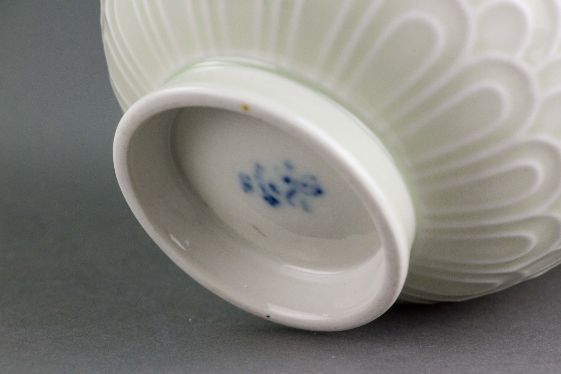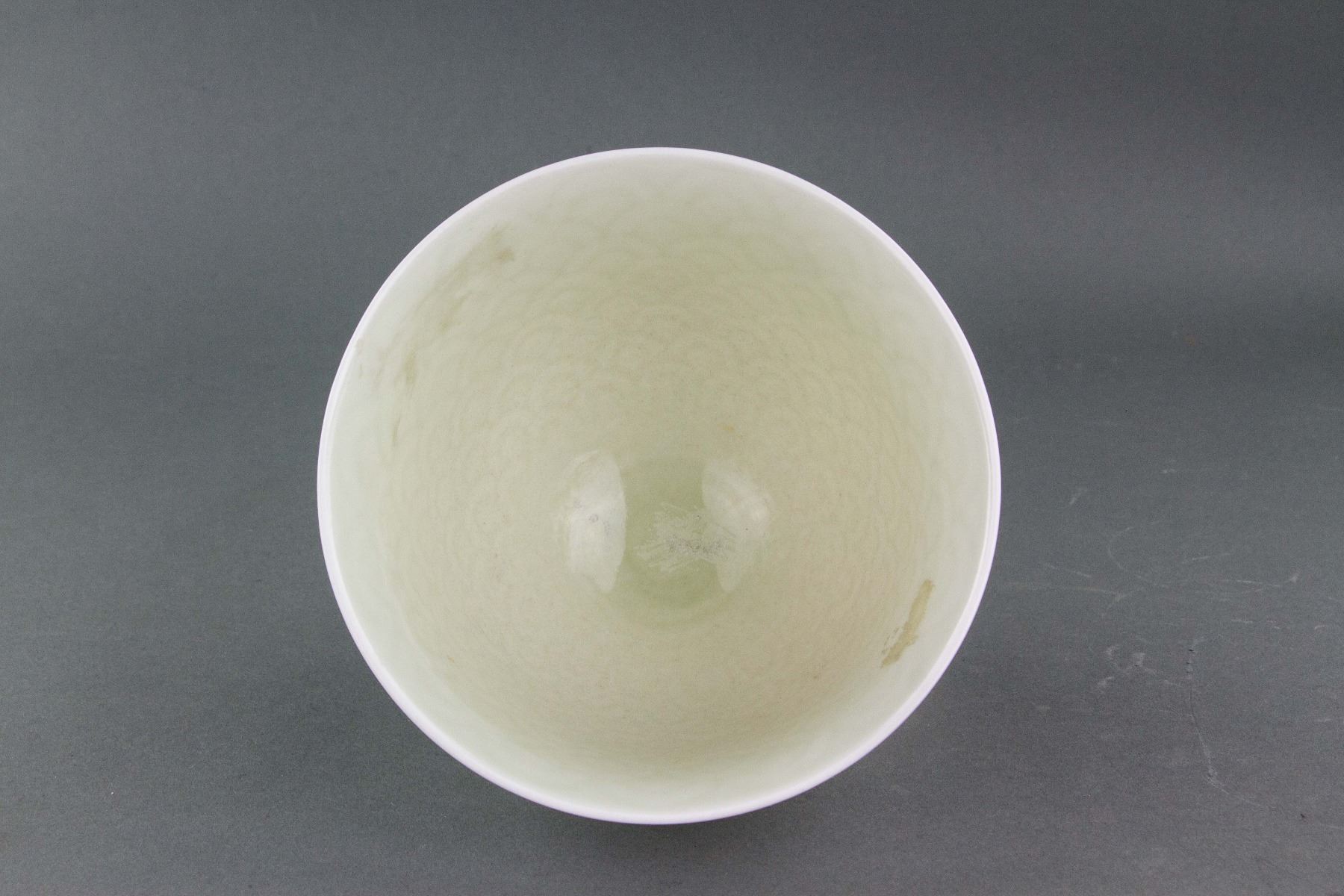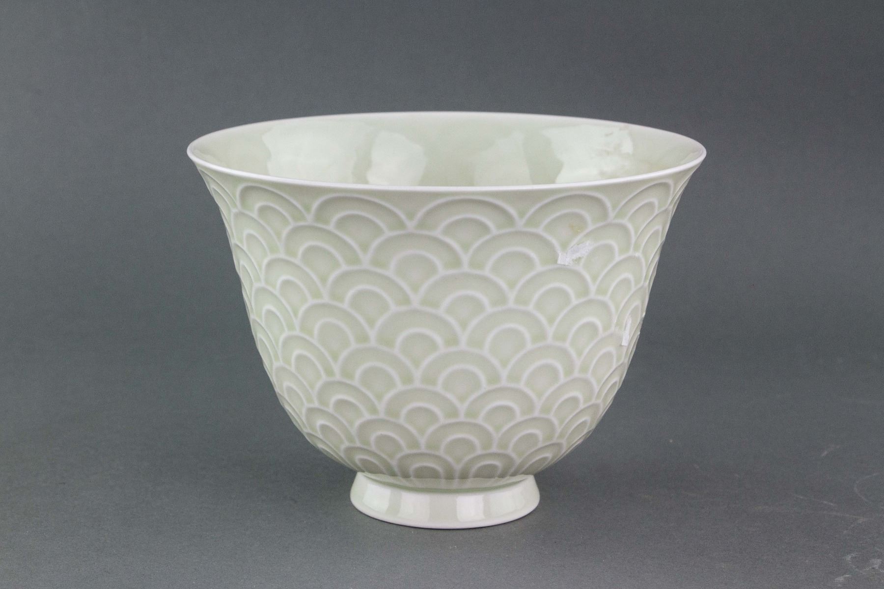 Chinese white porcelain cup; of rounded edge, tapering to bottom; supported on short foot rim; carved with wavy pattern; marker's mark on base; 11.5 cm x 17 cm, 306 grams