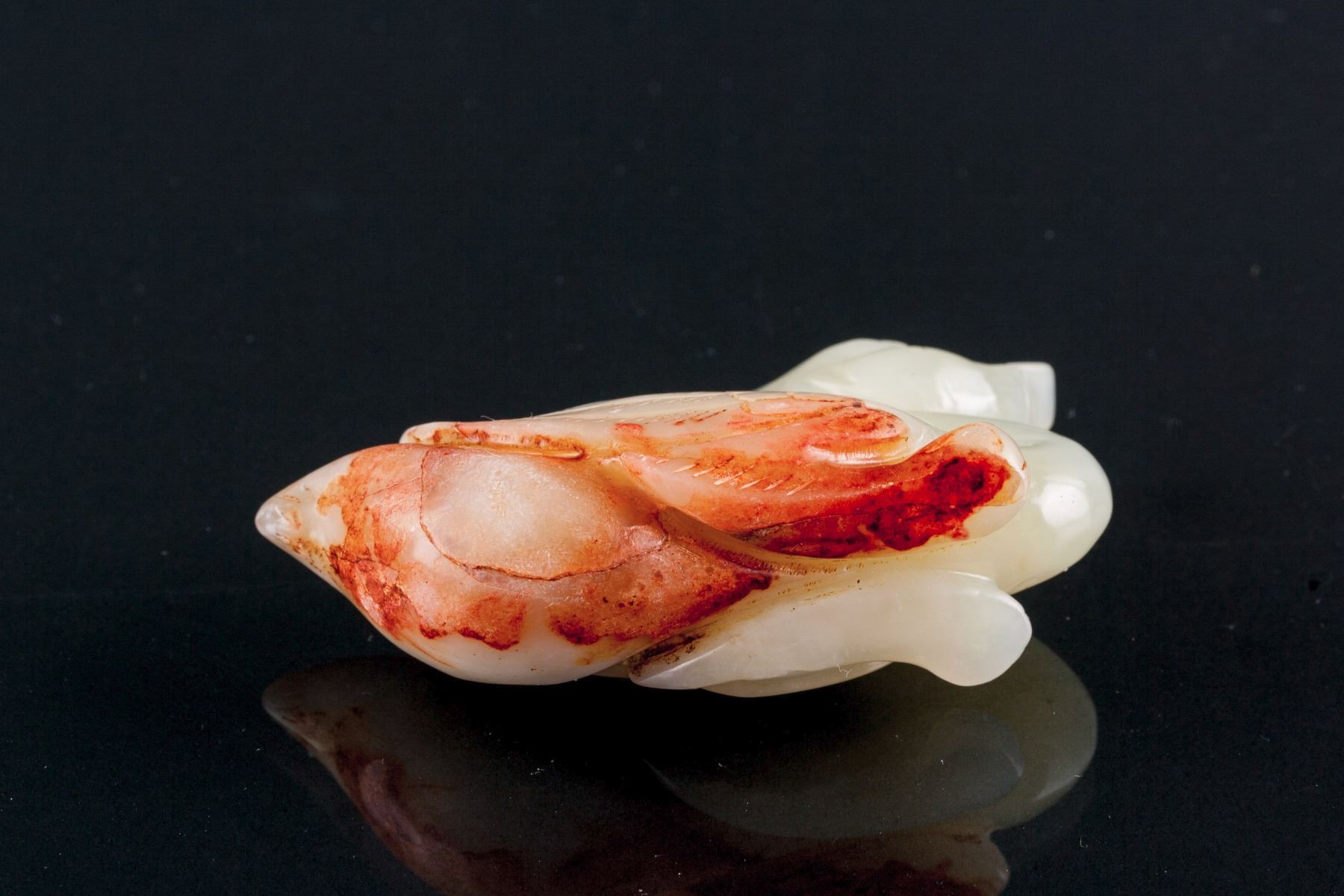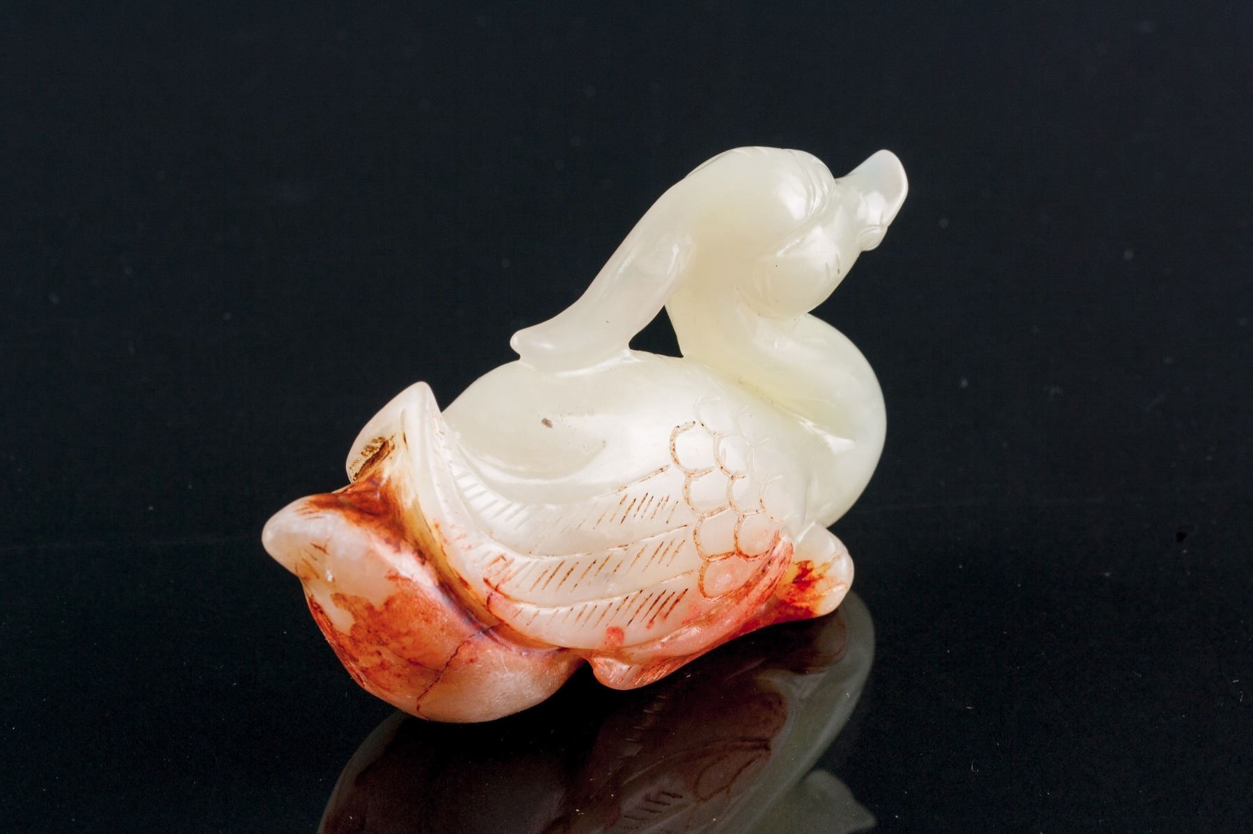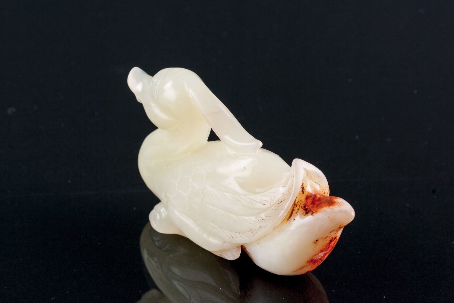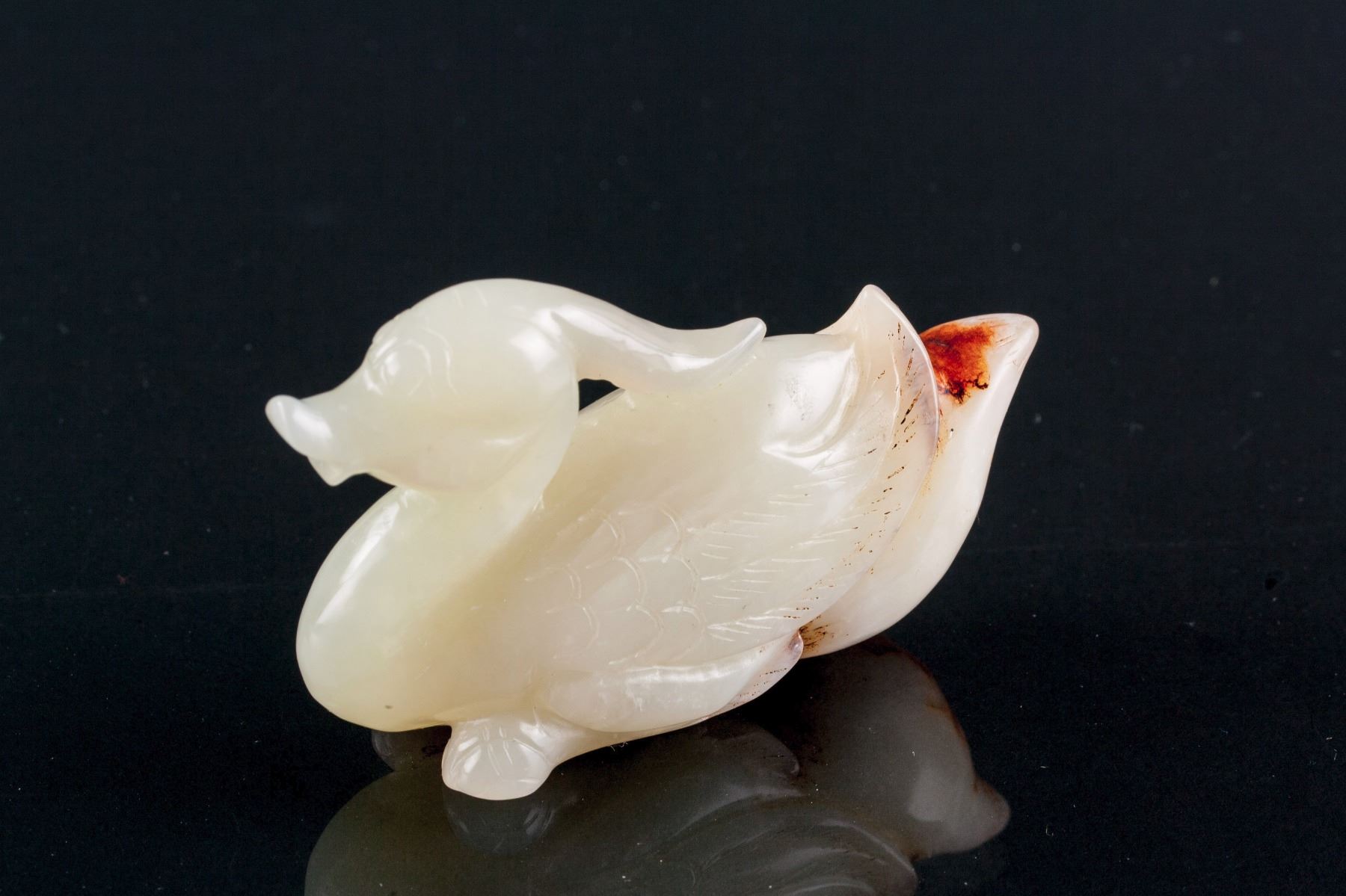 Chinese white and russet hardstone carved statue; carved in a duck form; of white tone with russet tinge; 9 cm x 3 cm, 92 grams