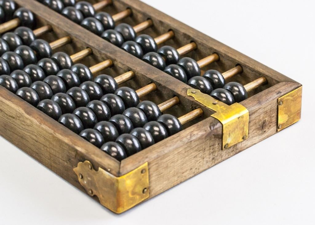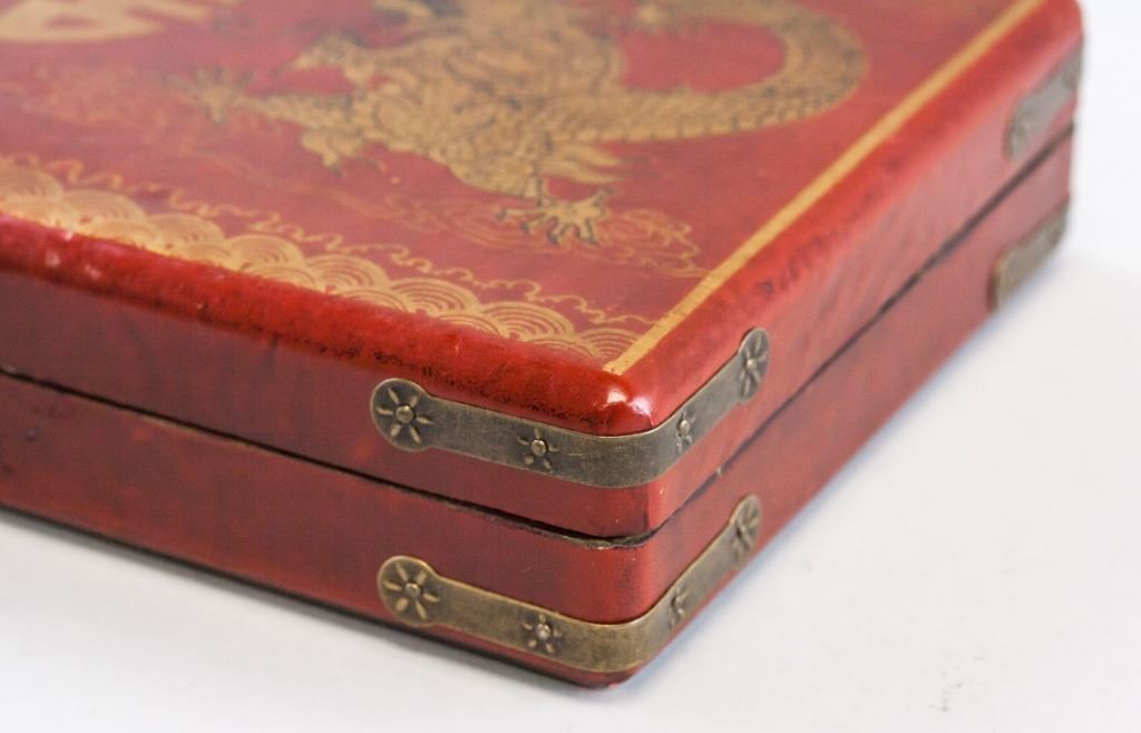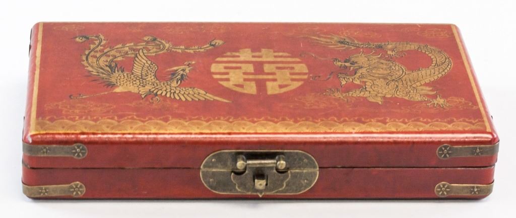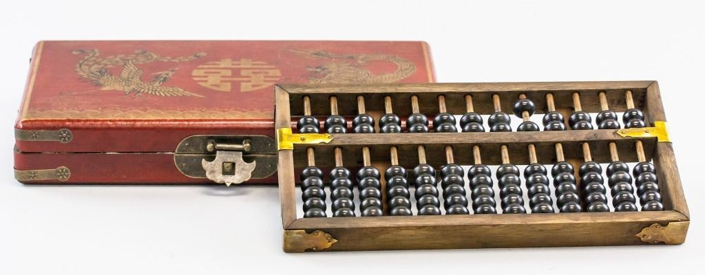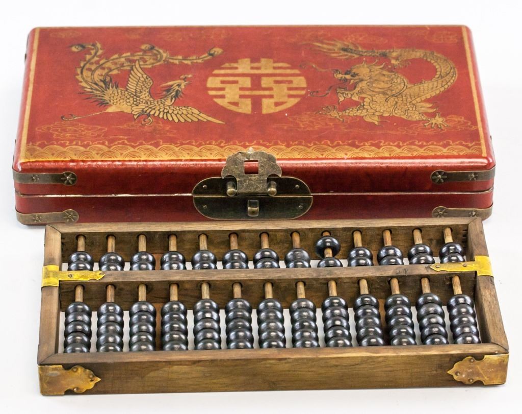 Chinese wood abacus. With brown frame and black beads. Accompanied with red box with metal clasp. Inscribed with "Xi" (Chinese character for joy) on lid, surrounded by a phoenix and a dragon. 4 x 26 cm, 824g