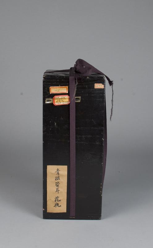 Black wood box, with recessed bottom, with several old labels with possibly inventory numbers and a label that states this is for a celadon Ming Dynasty vase 1369 to 1674AD. 13.75"H x5.38"Square.Very nice box in good condition.