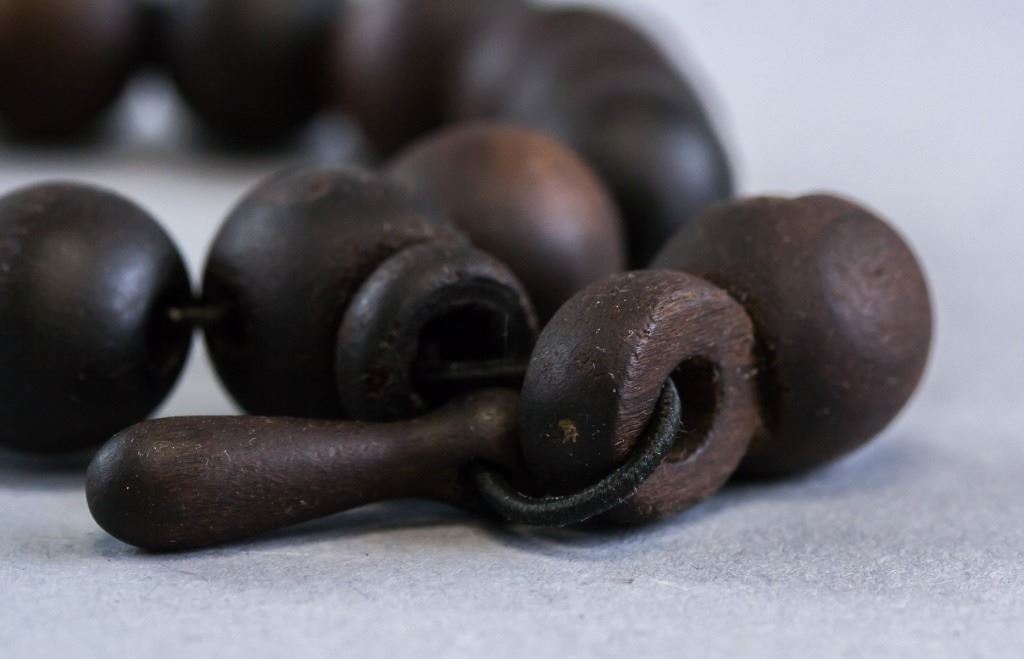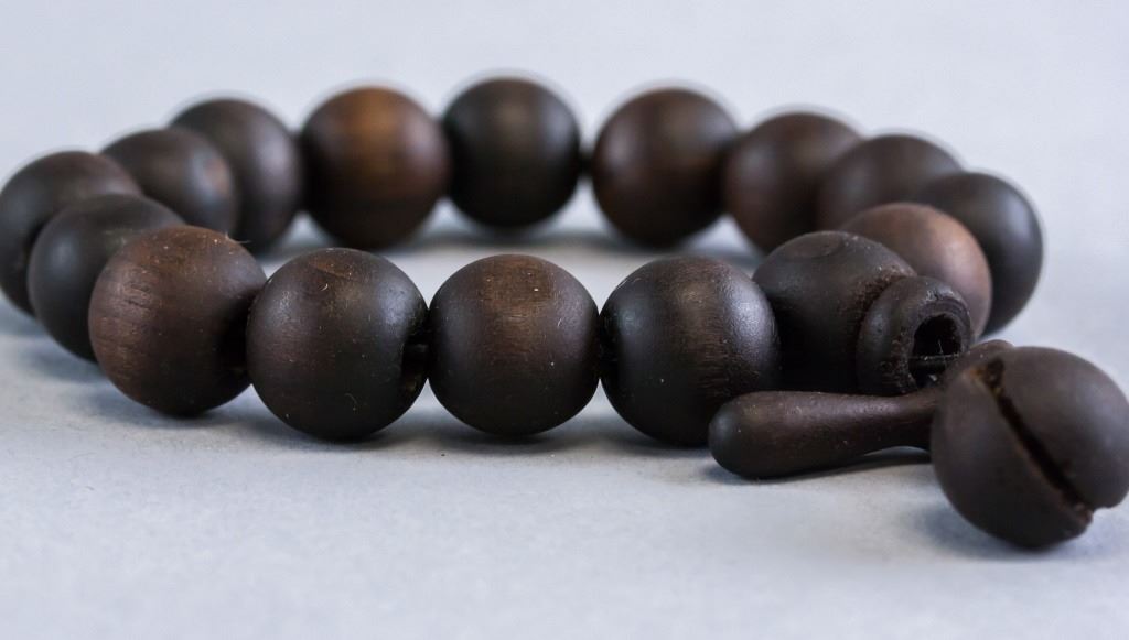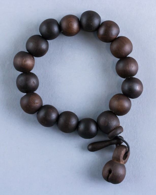 Chinese wood bracelet. Of dark brown tone. With smooth and round wooden beads. 15g .