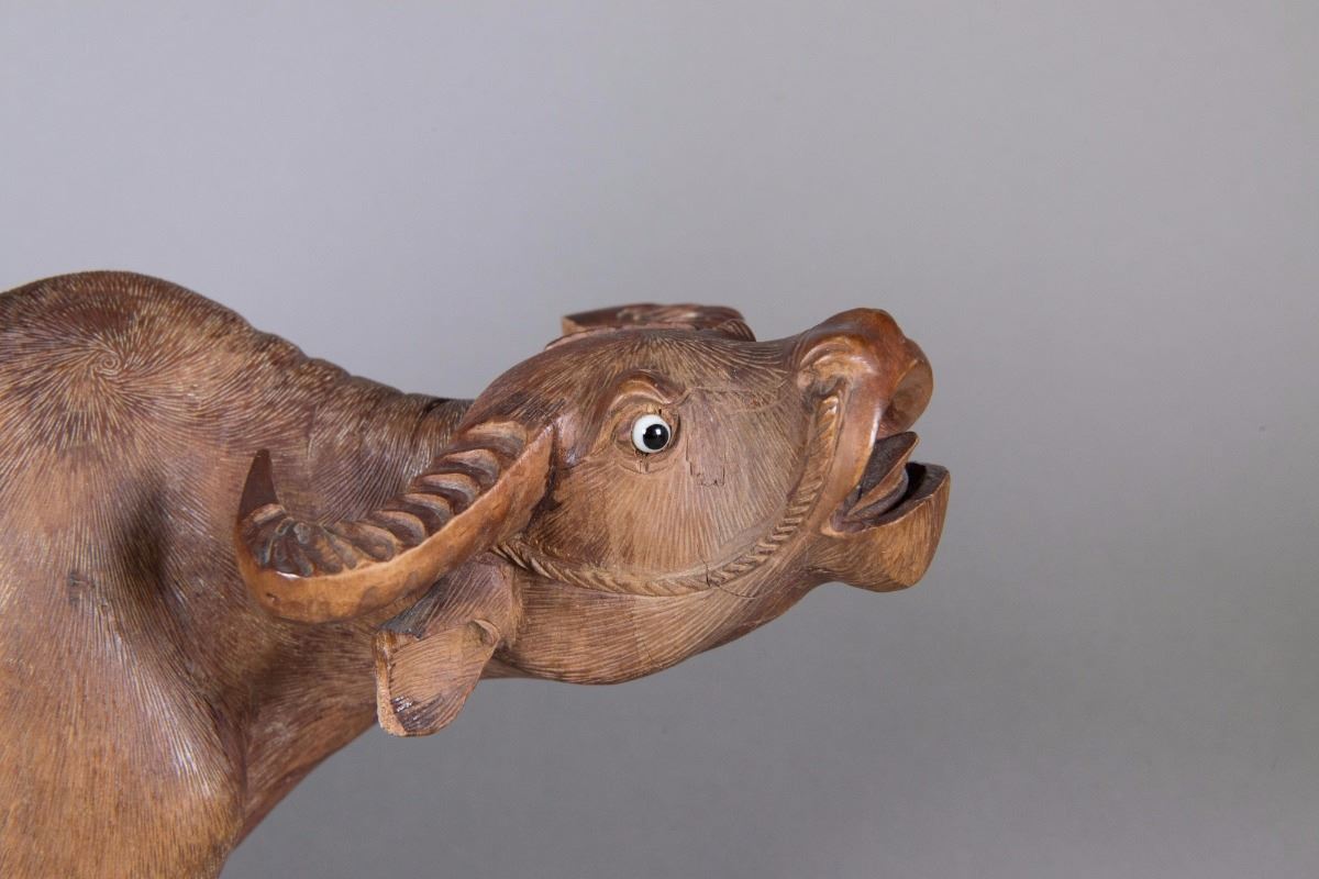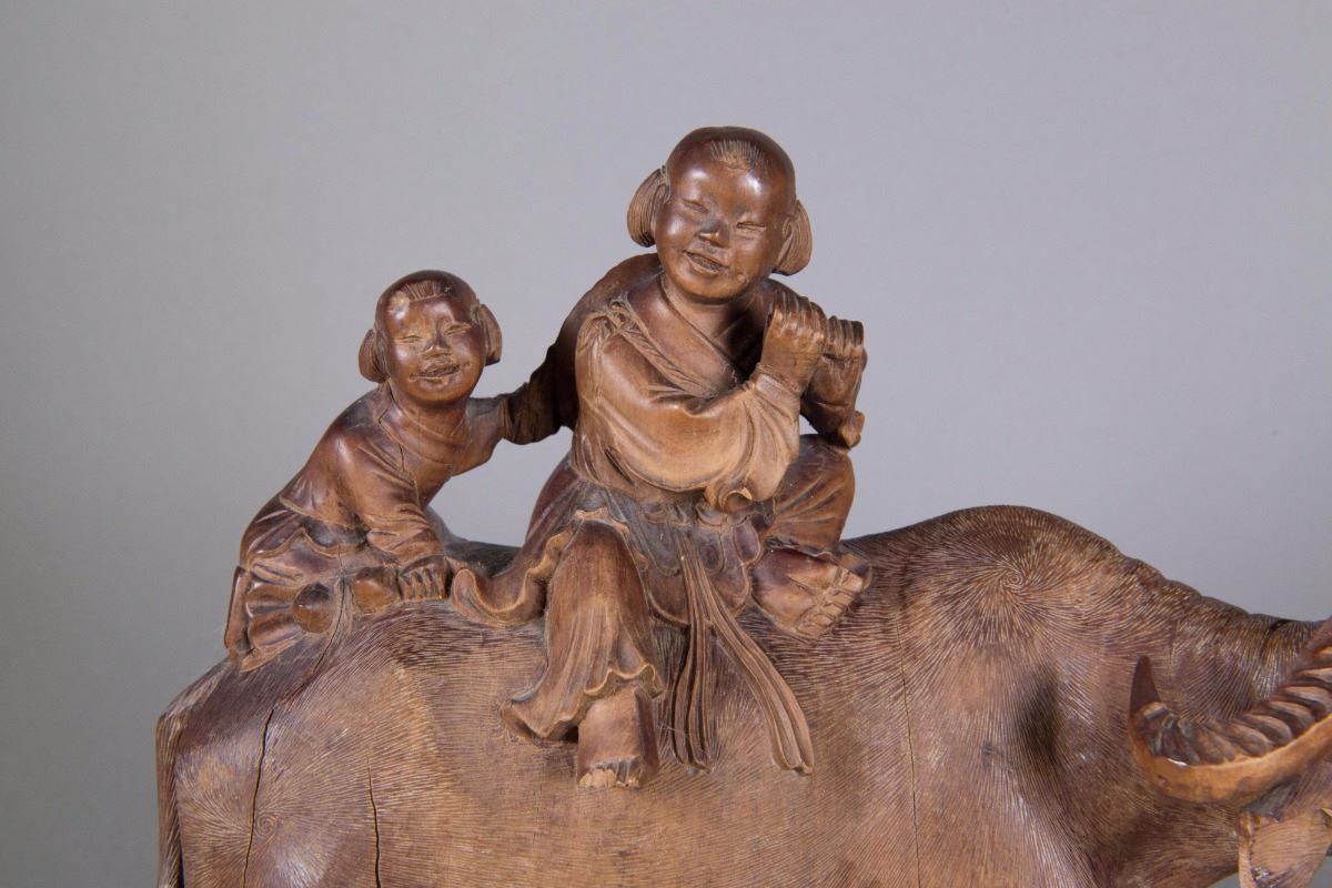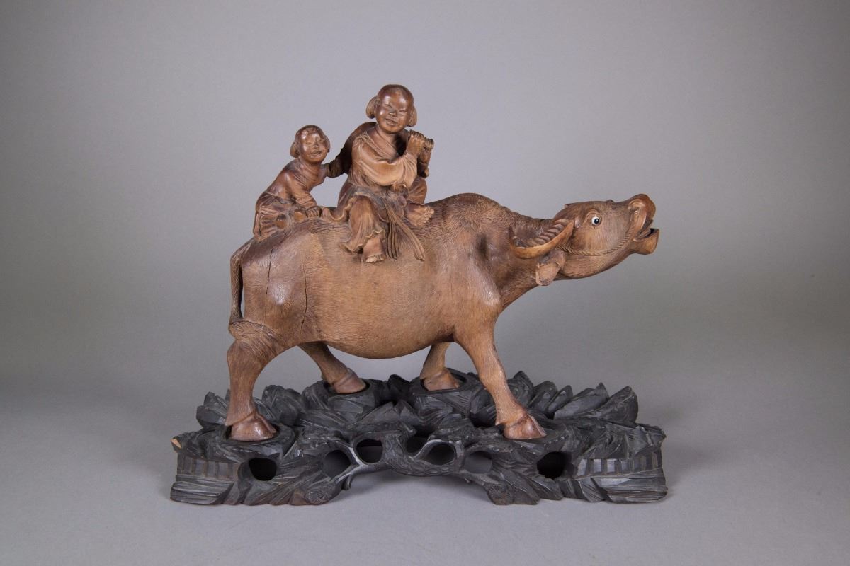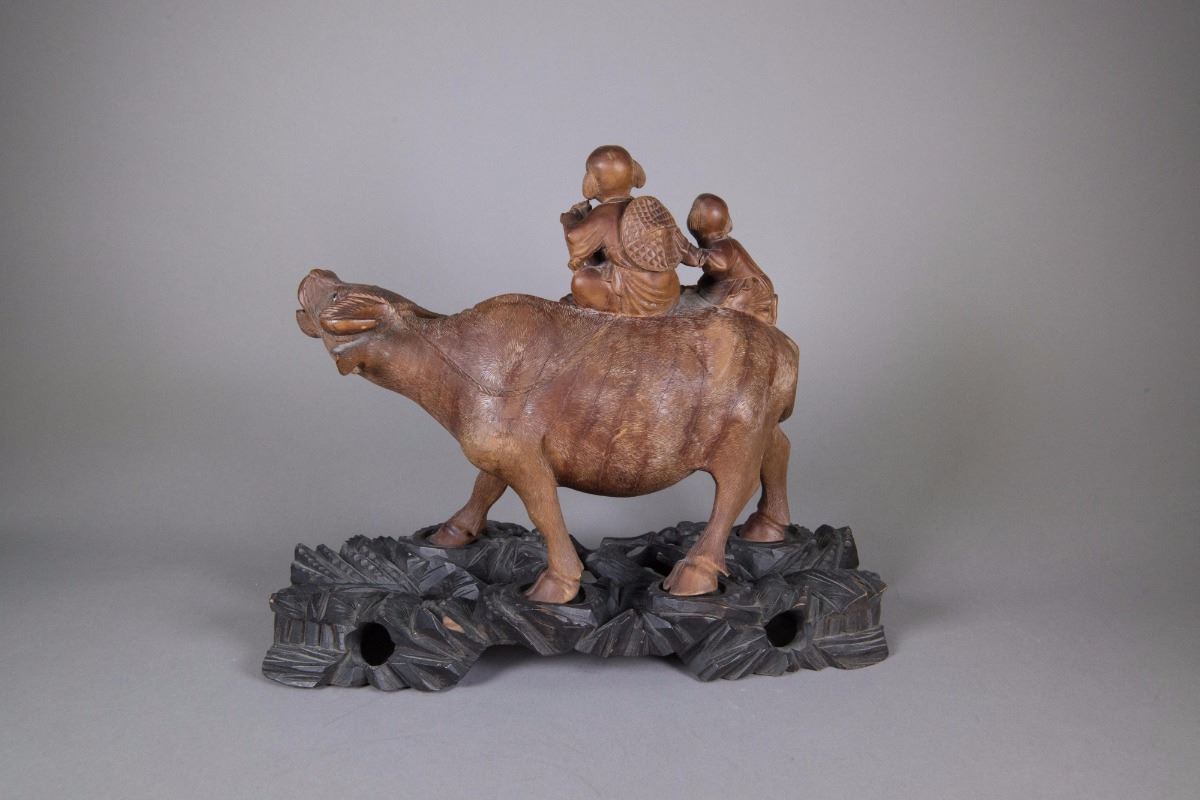 Chinese wood carved figure; featuring two boys riding a cow; custom carved stand included; H: 27 cm, W: 35 cm, 2555 grams w/ stand