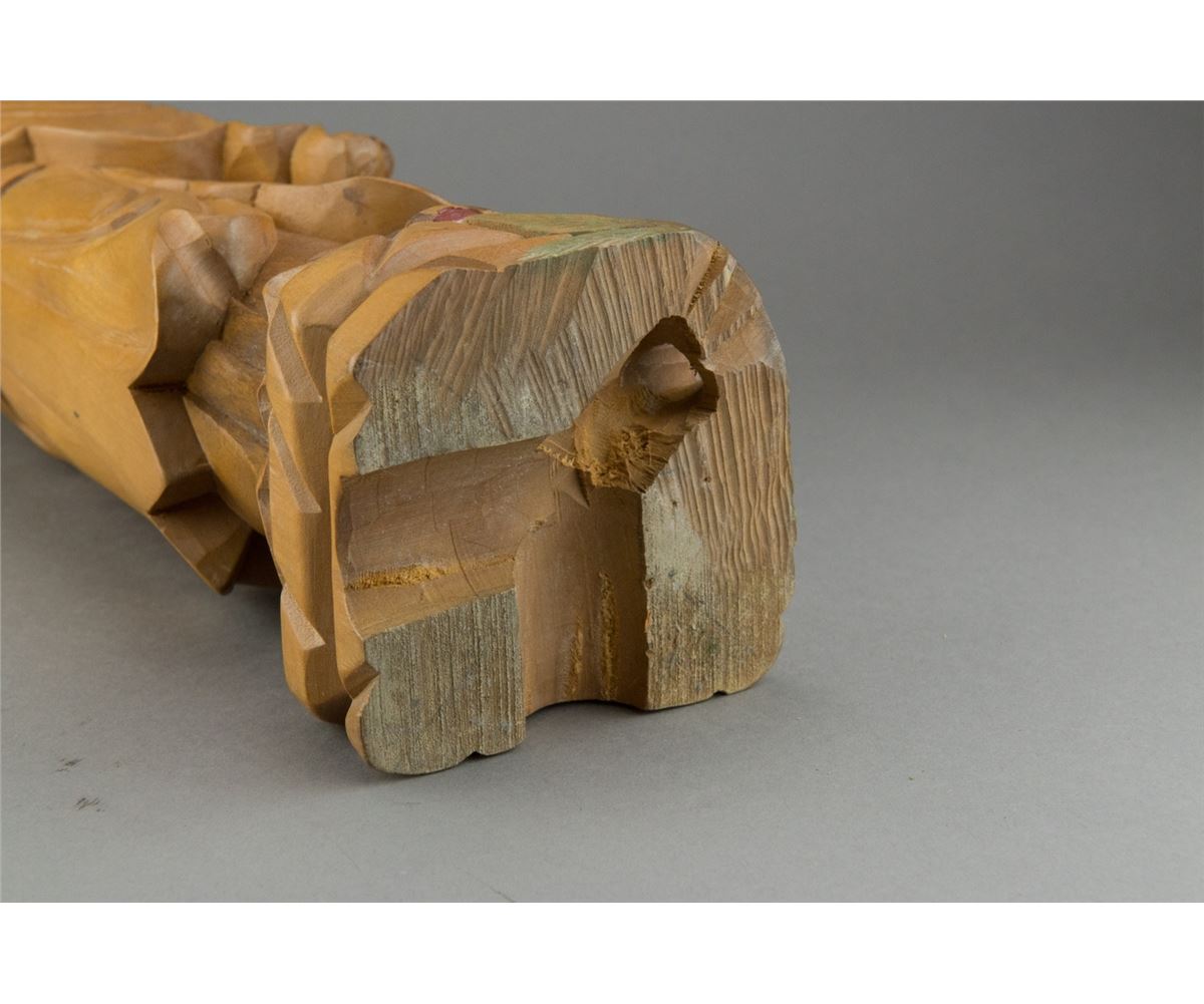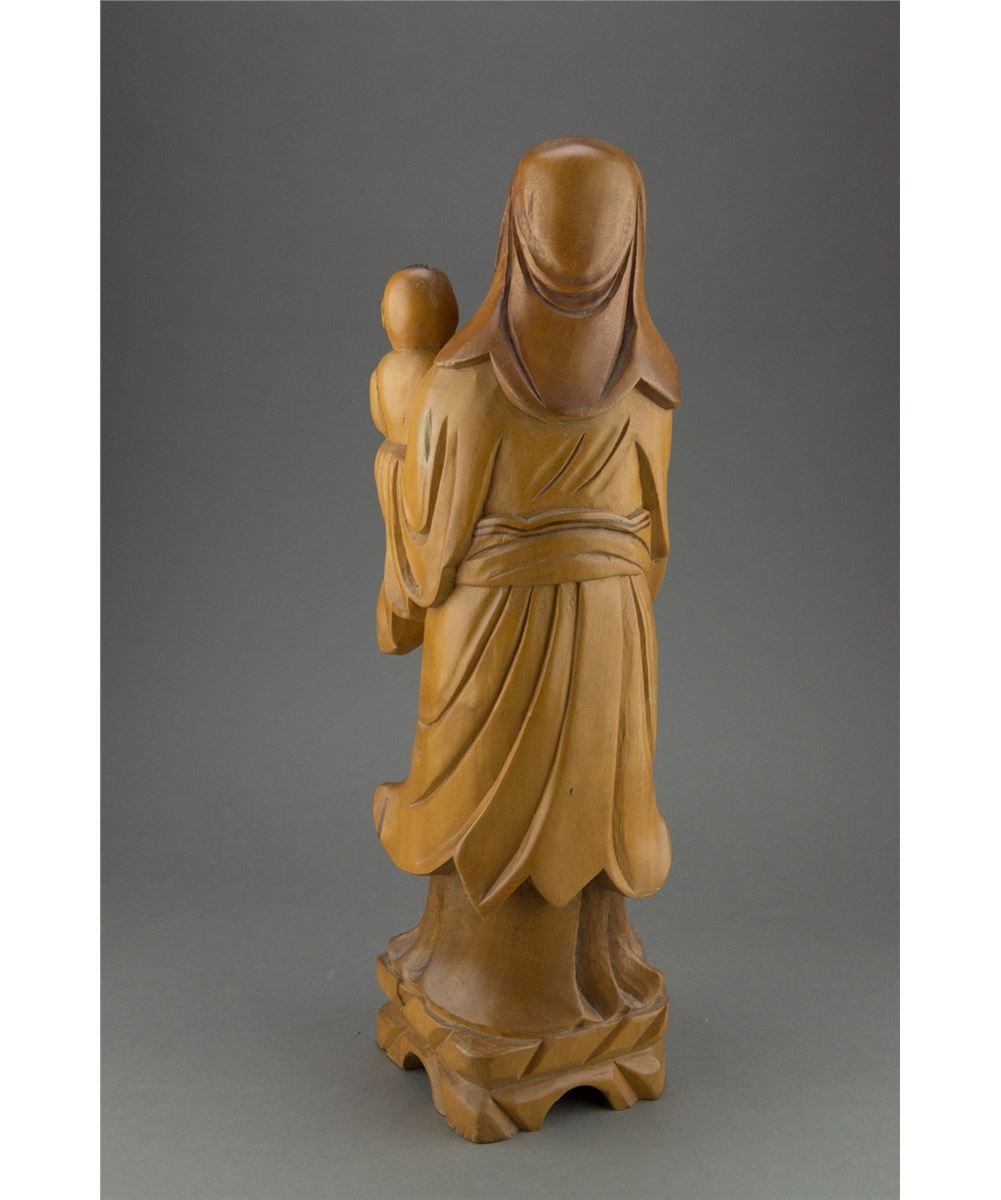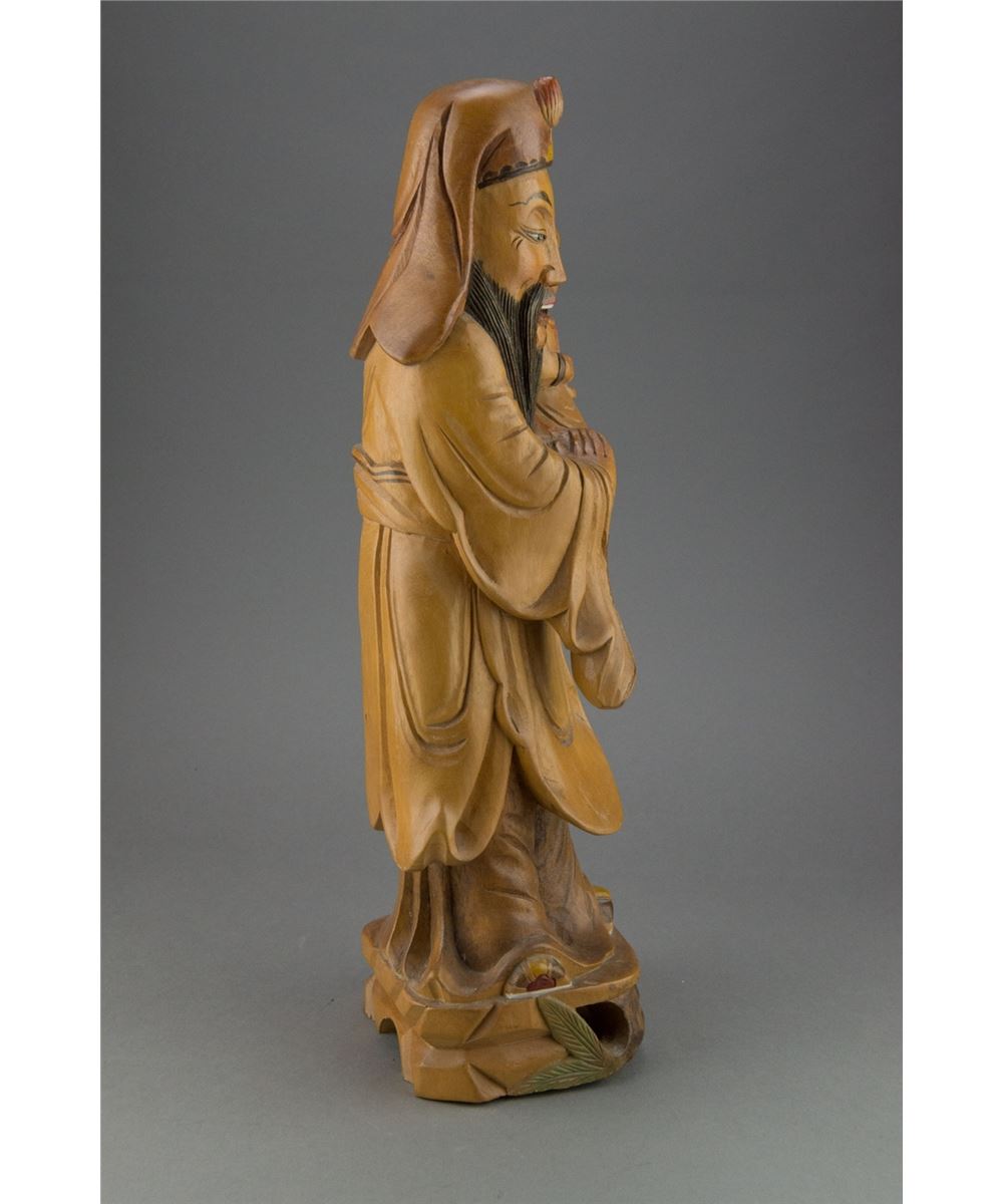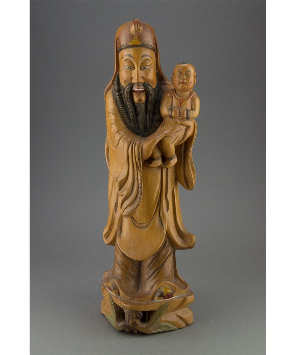 Large Chinese wood carved figure, featuring bearded man with child. H: 39 cm, W; 12 cm, 1642 grams.