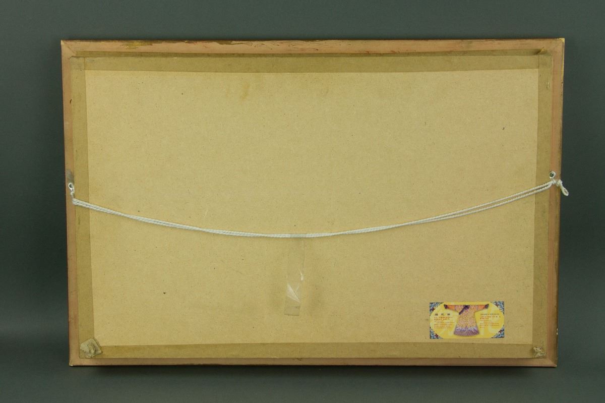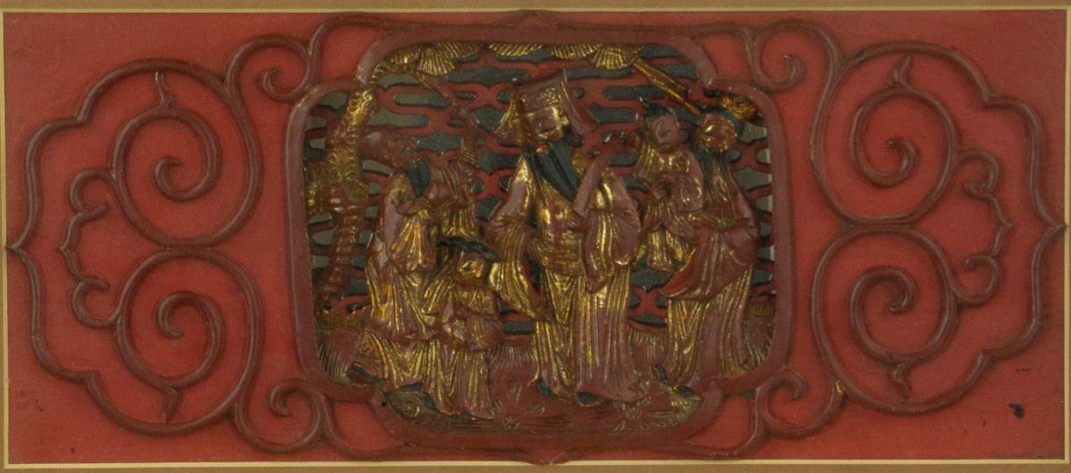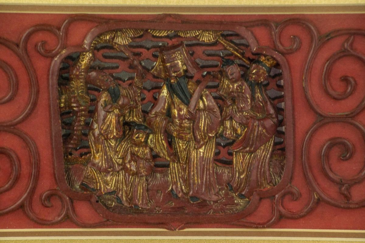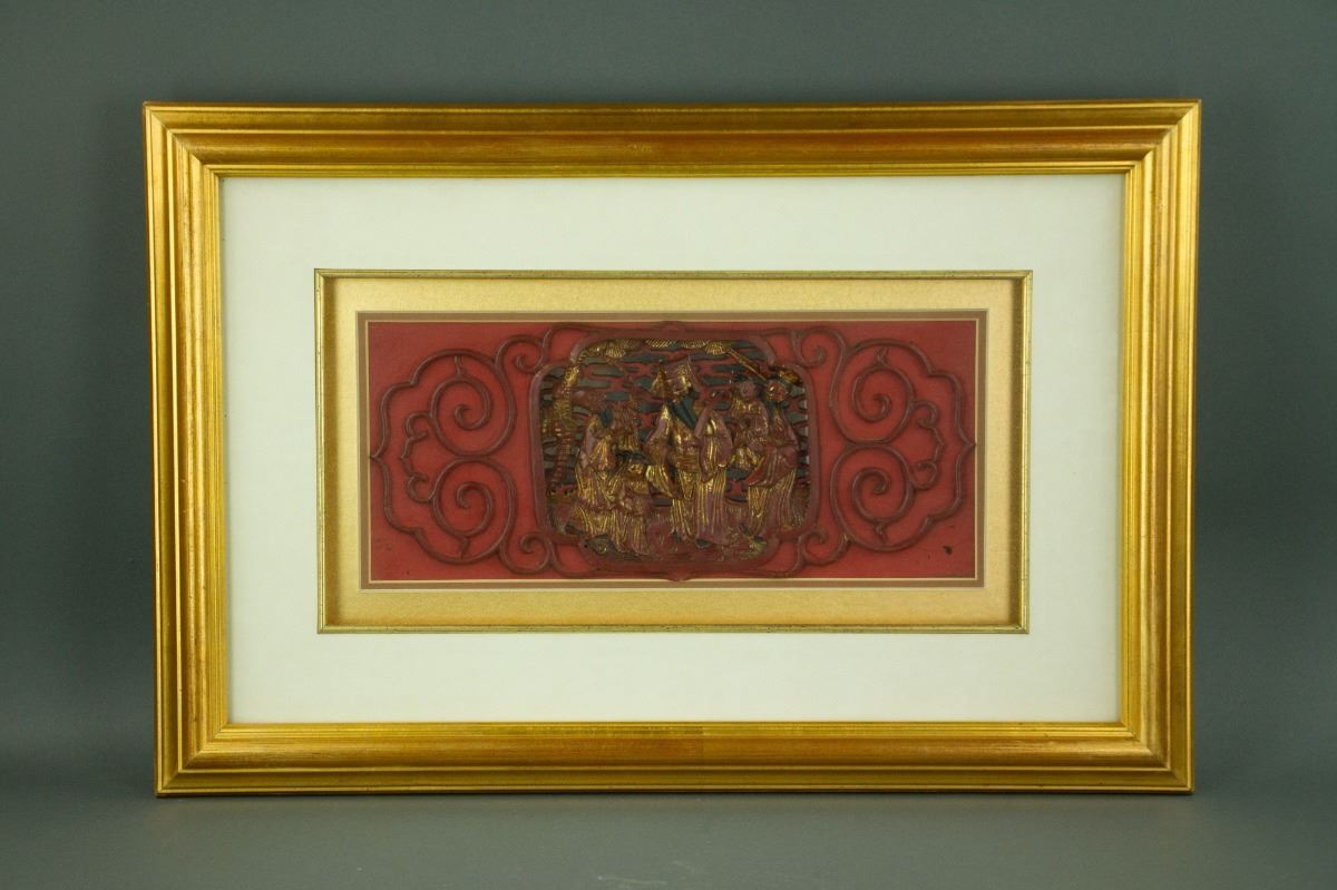 Chinese gilt wood panel; openwork carved with three immortals Fu, Lu and Shou; overall covered in red lacquer; mounted on board with frame; 42 cm × 59 cm