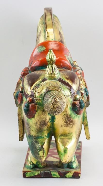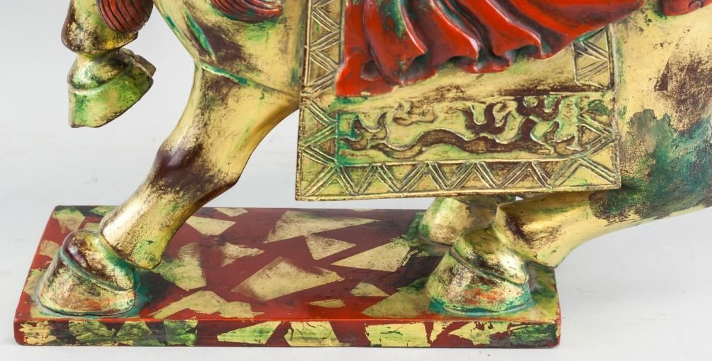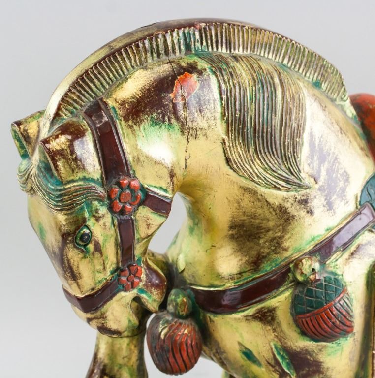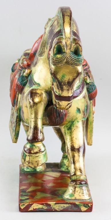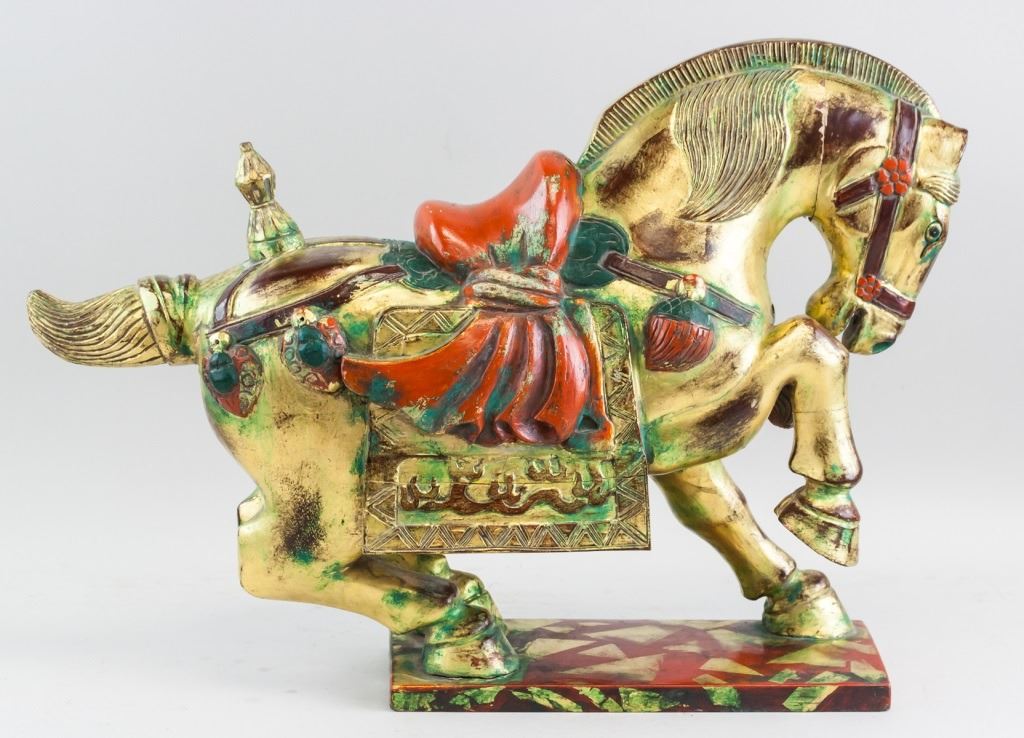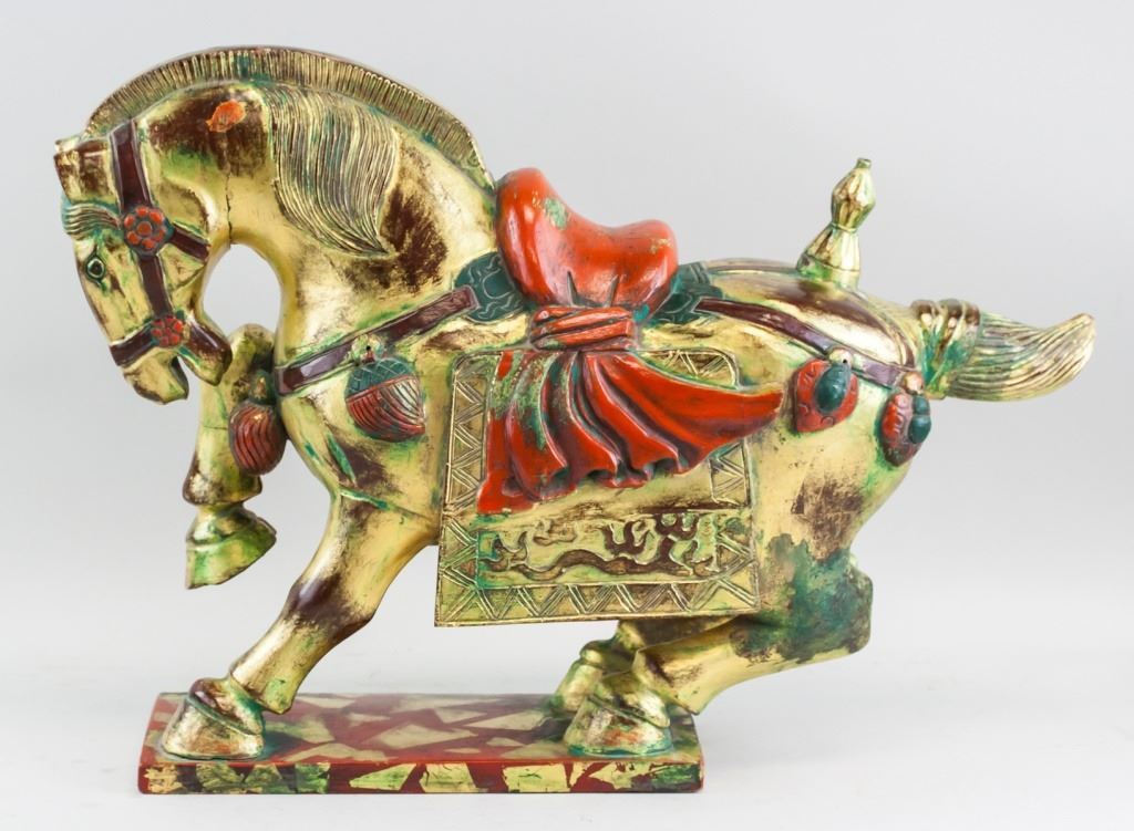 Chinese wood carved horse. With gilt. Featuring a horse with one hoof raised. Resting on flat rectangular base. With red bridle and saddle. 40 x 56 cm, 4,551 grams.