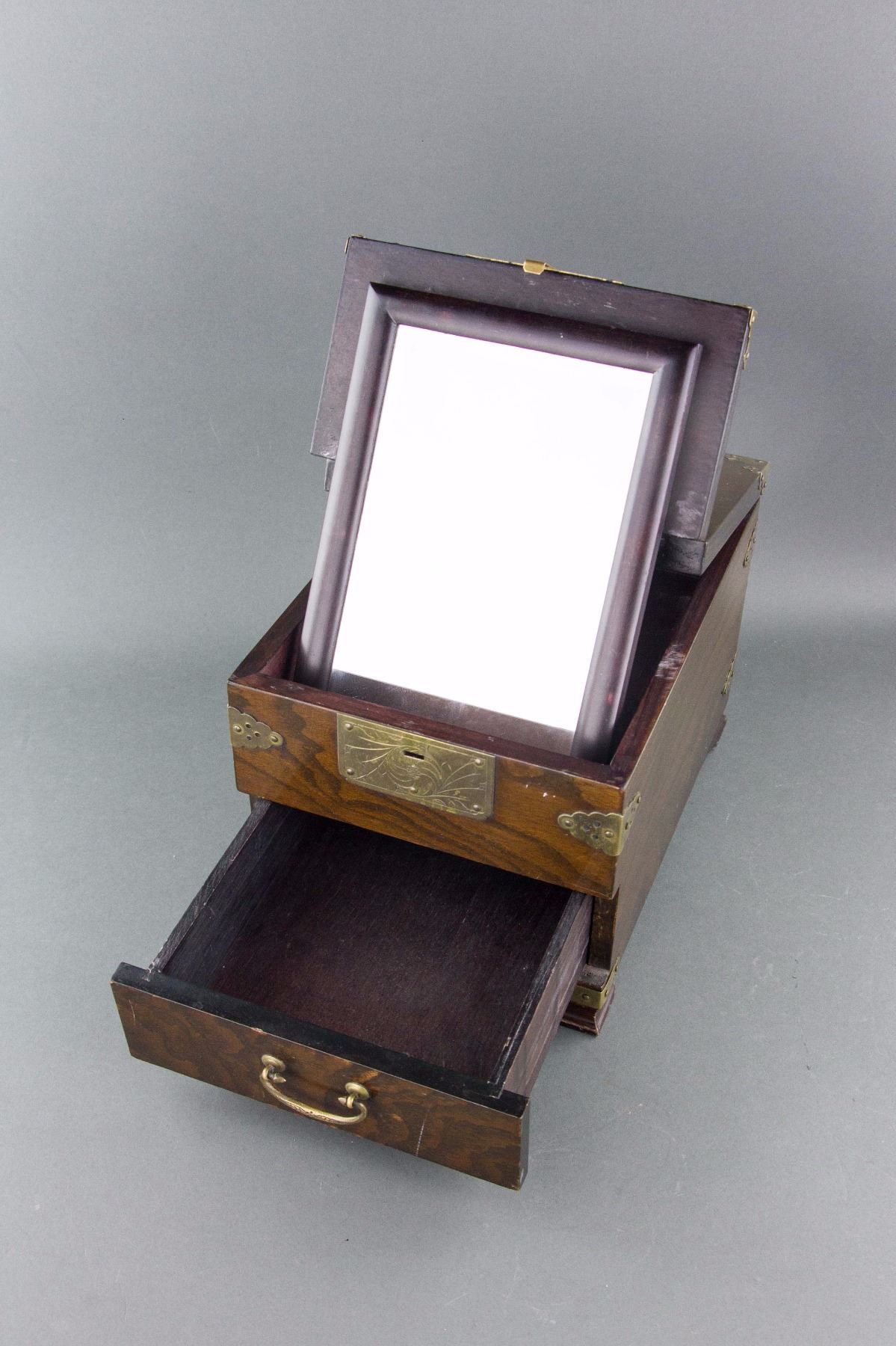 Chinese wood jewellery box; of rectangle form; with drawers and mirror; enhanced by metal hardware; 28 cm x 21 cm, 3202 grams