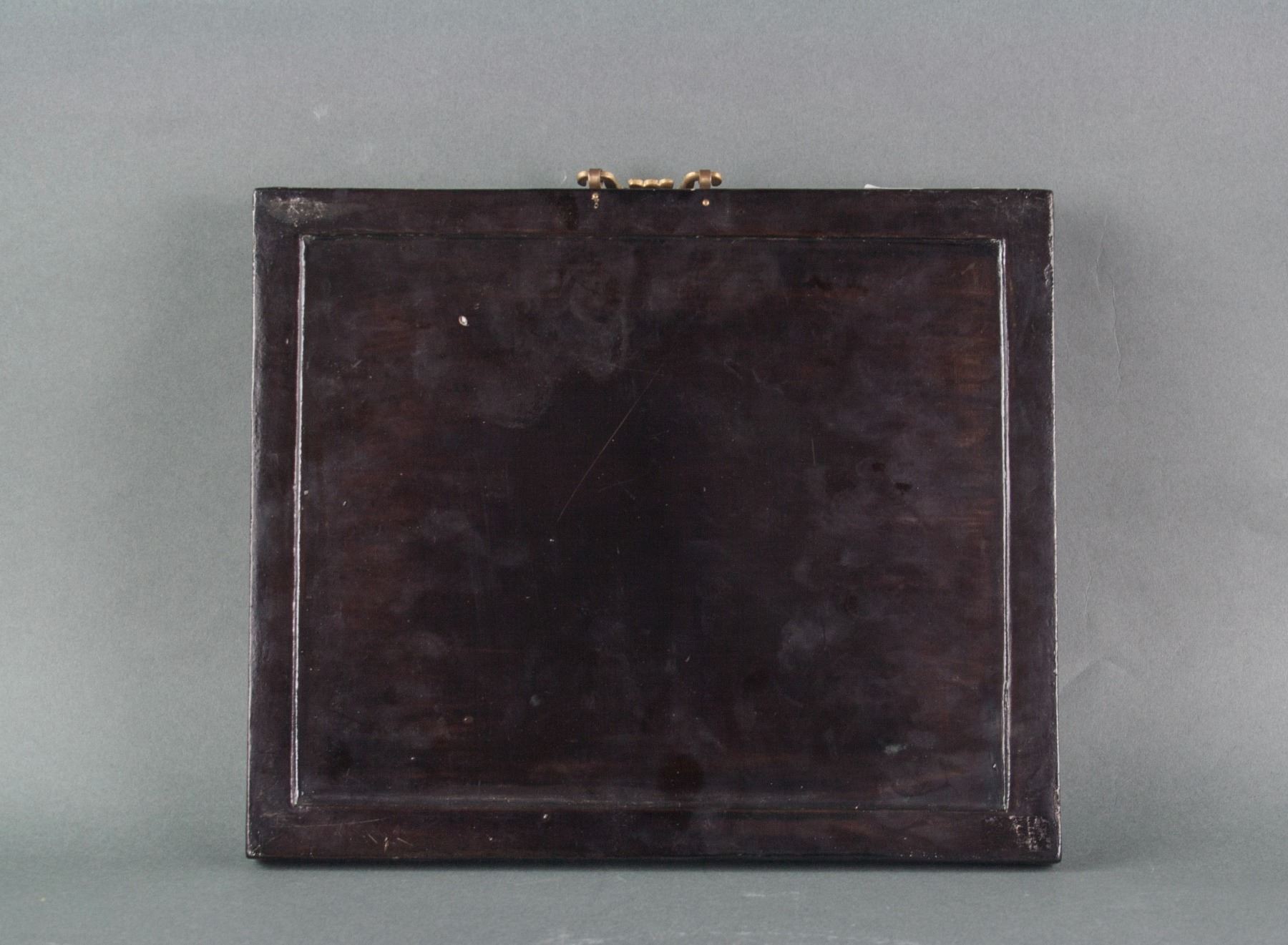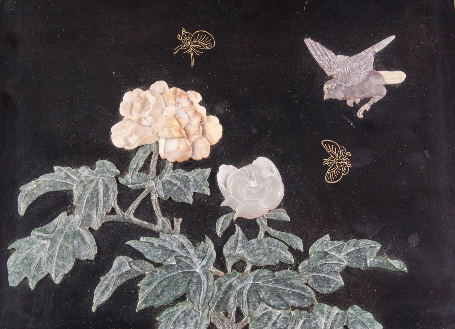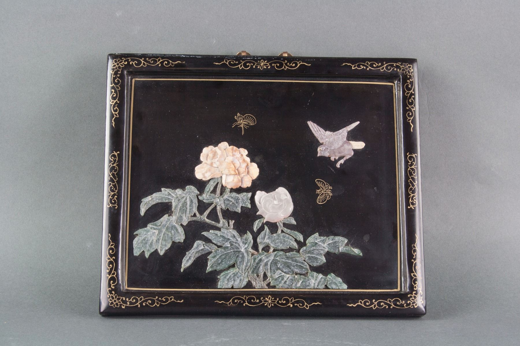 Chinese wood lacquer panel; of rectangle shape; set with stone carved flowers and bird; with metal hook; 21 cm x 25 cm, 759 grams