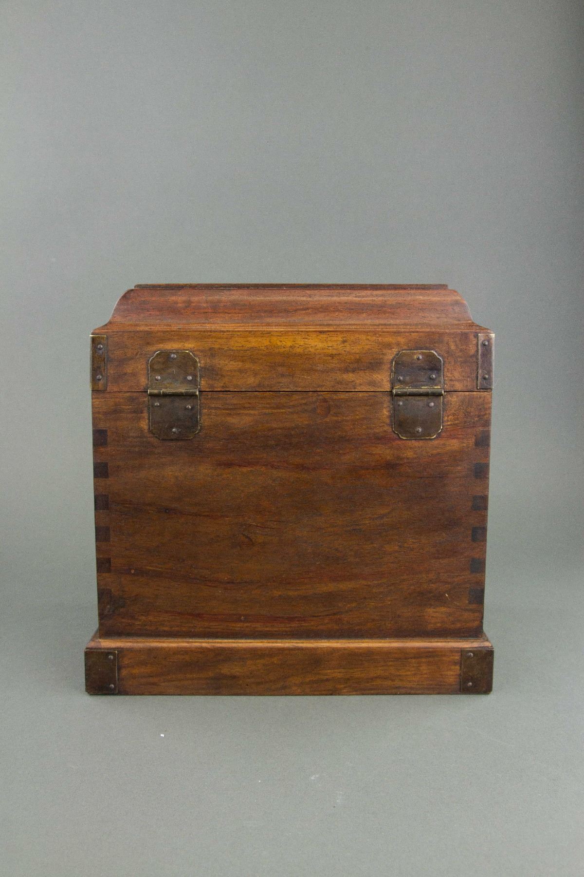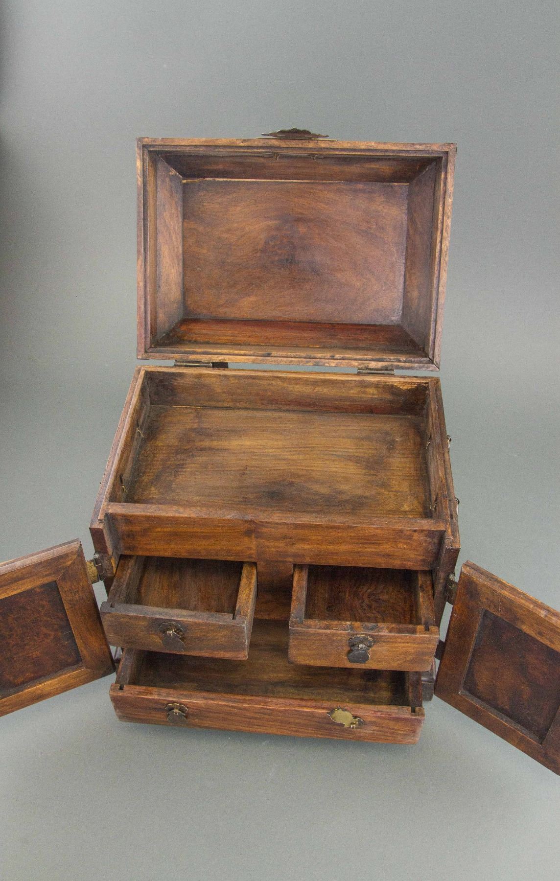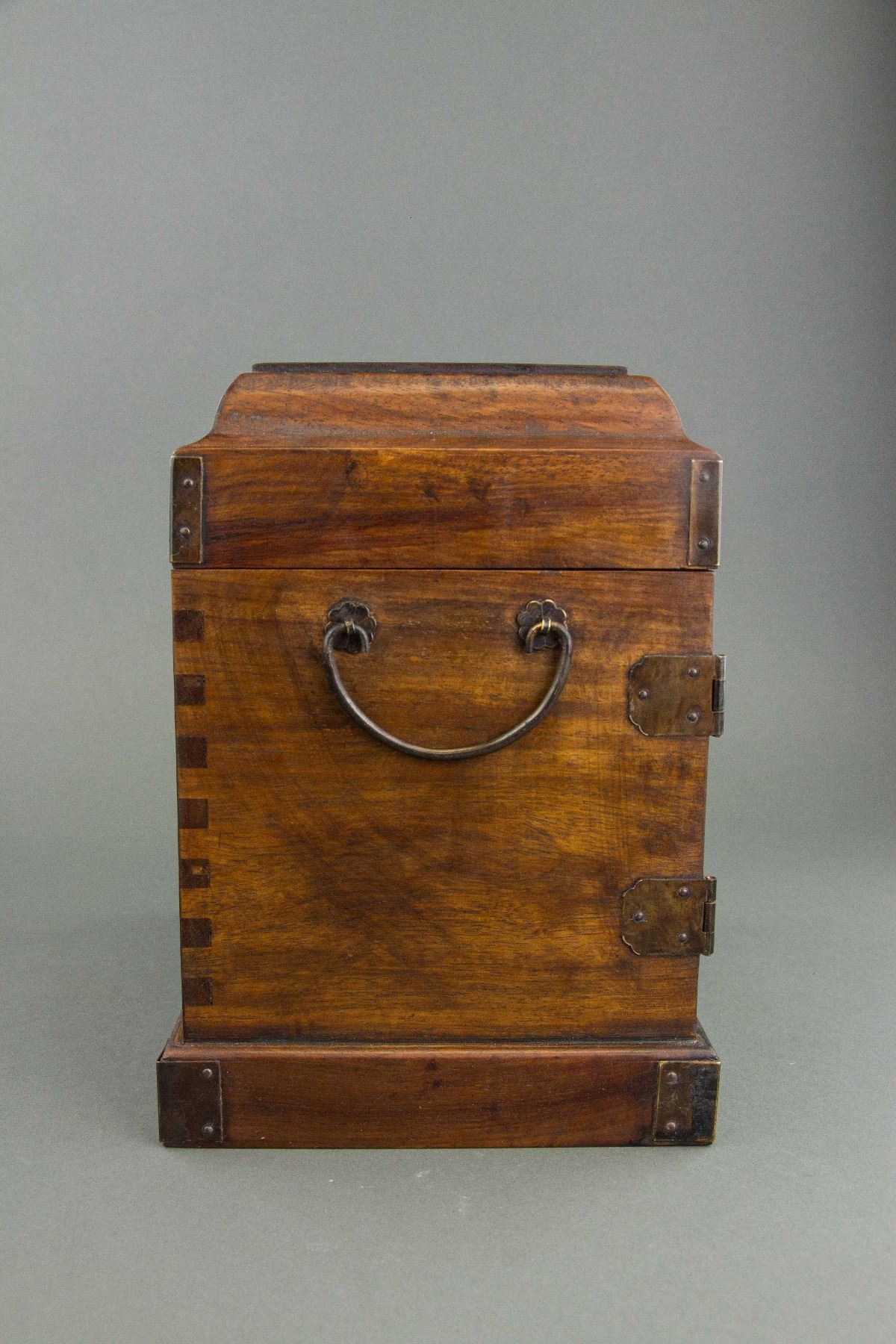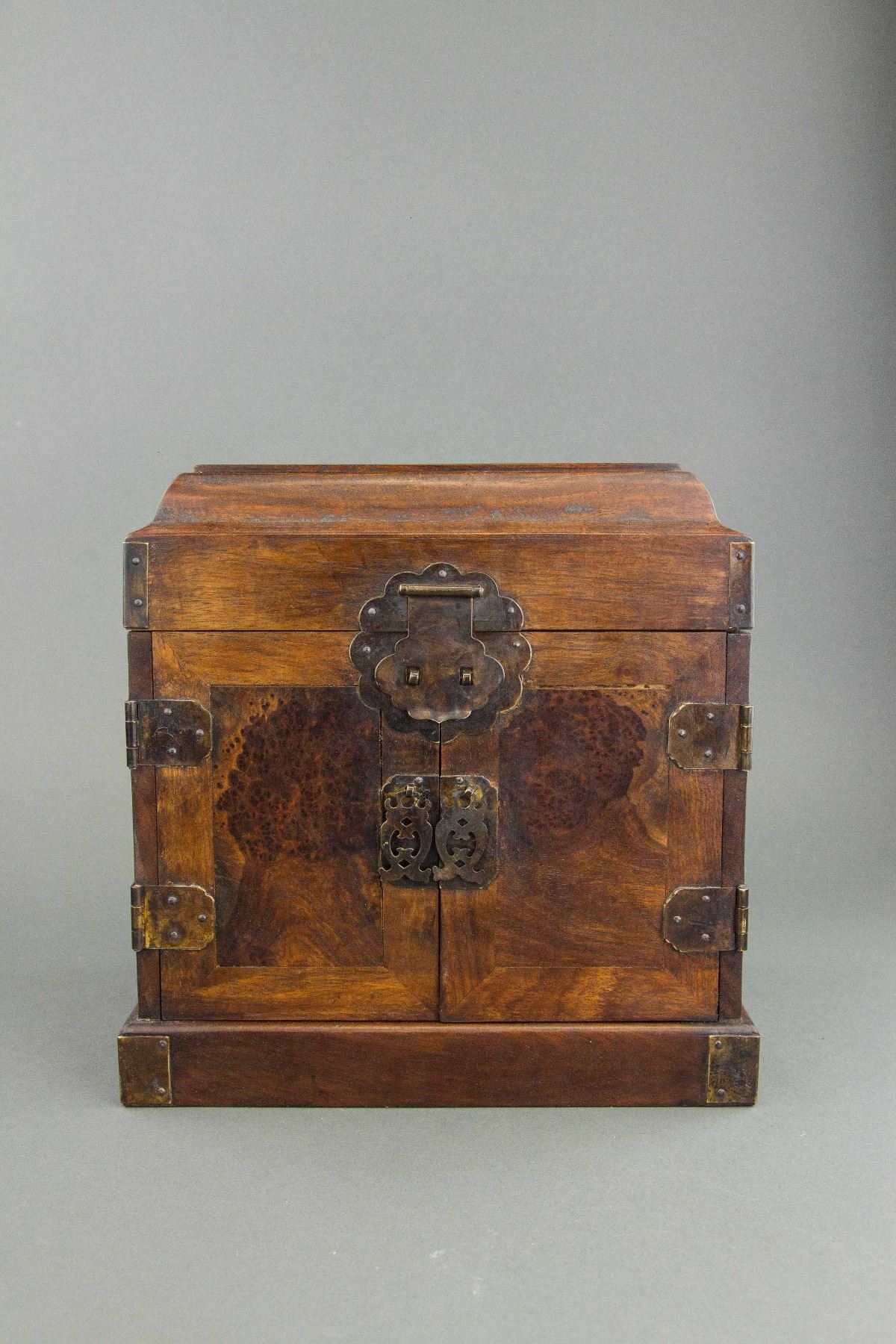 Chinese wood treasure box; of rectangle form body with enlarged base and two ring handles; with hidden 3 drawers inside with 2 doors; connected with brass hardware; H: 26 cm, W: 25 cm, L: 18 cm, 2472 grams