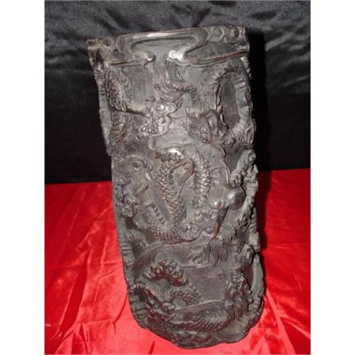 DESCRIPTION: Wood Brush Pot of Nine- Dragon Chasing the Sun