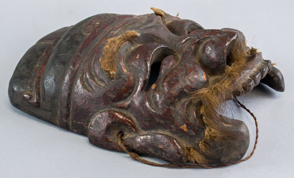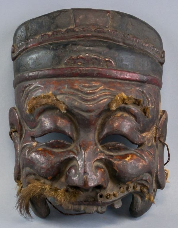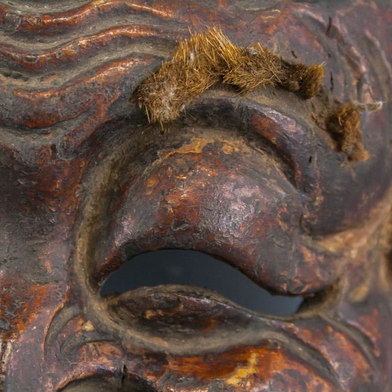 Chinese wooden Nuo mask. With faded colors. Some hair remaining for mustache and eyebrows. 22 x 16 cm, 294 grams.