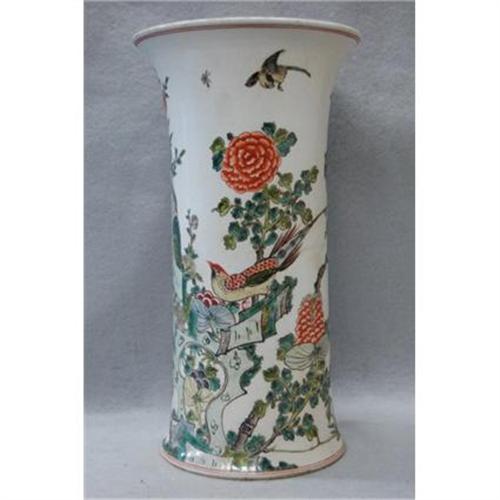 Chinese Wu-Cai Porcelain Beaker Vase.It painted with birds and flowers as decoration. 20th century.14" high.Good condition.