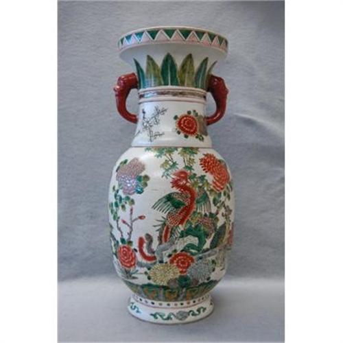 Chinese Wu-Cai Porcelain Vase with elephant handle. decorated with phoenix and floral. good condition ( minor hairline ). 16.5" high.