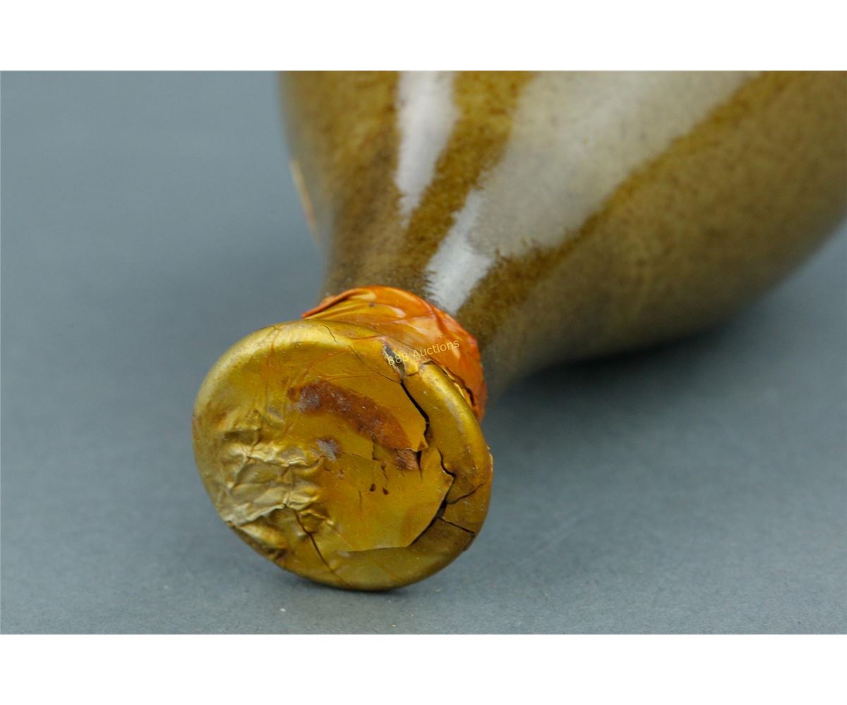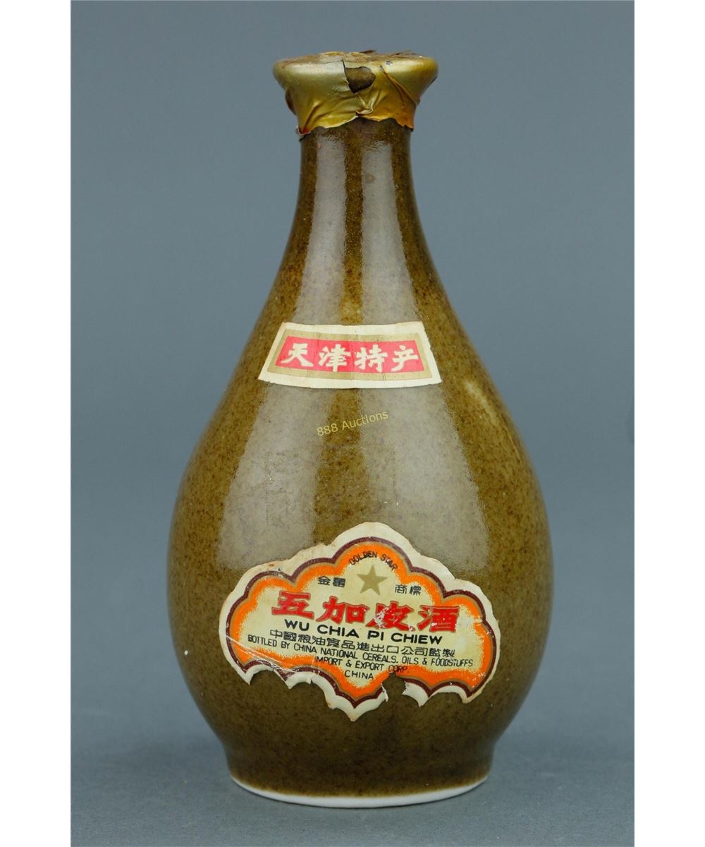Chinese Wu Chia Pi gracilistylus medicinal wine; sealed on top; of brown glazed; with Tianjin Techan label and Bottled by China National Cereals Oils & Foodstuffs Import & Export Corp. China label; H: 12.5 cm, W: 7 cm, 231 grams. Buyer is responsible for export.