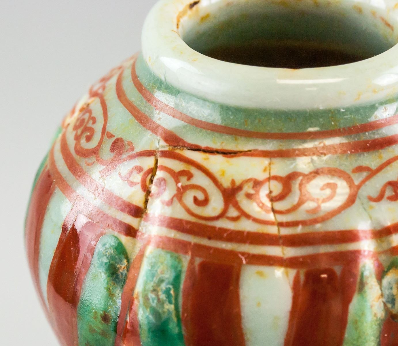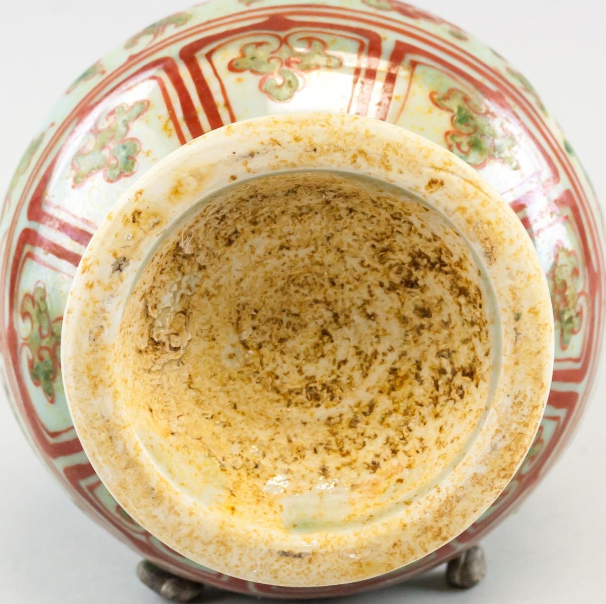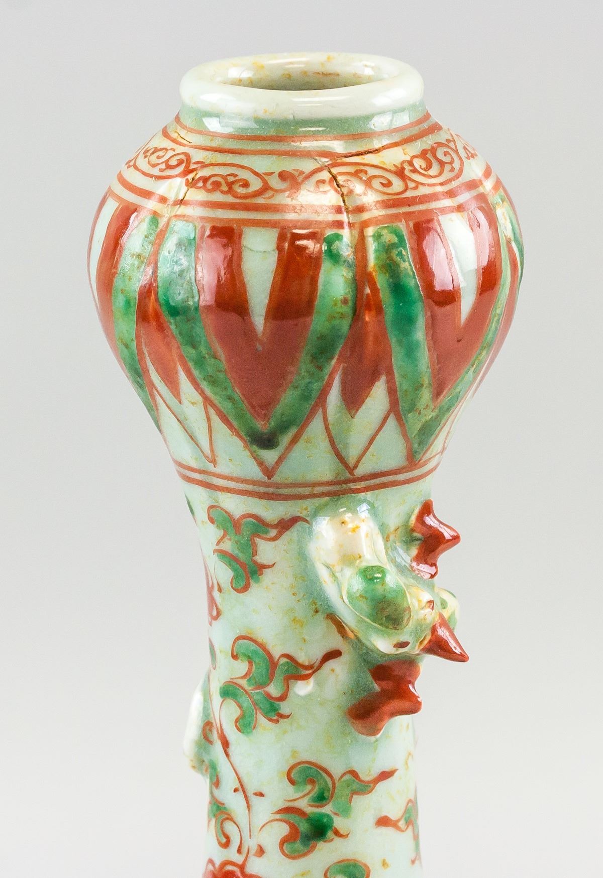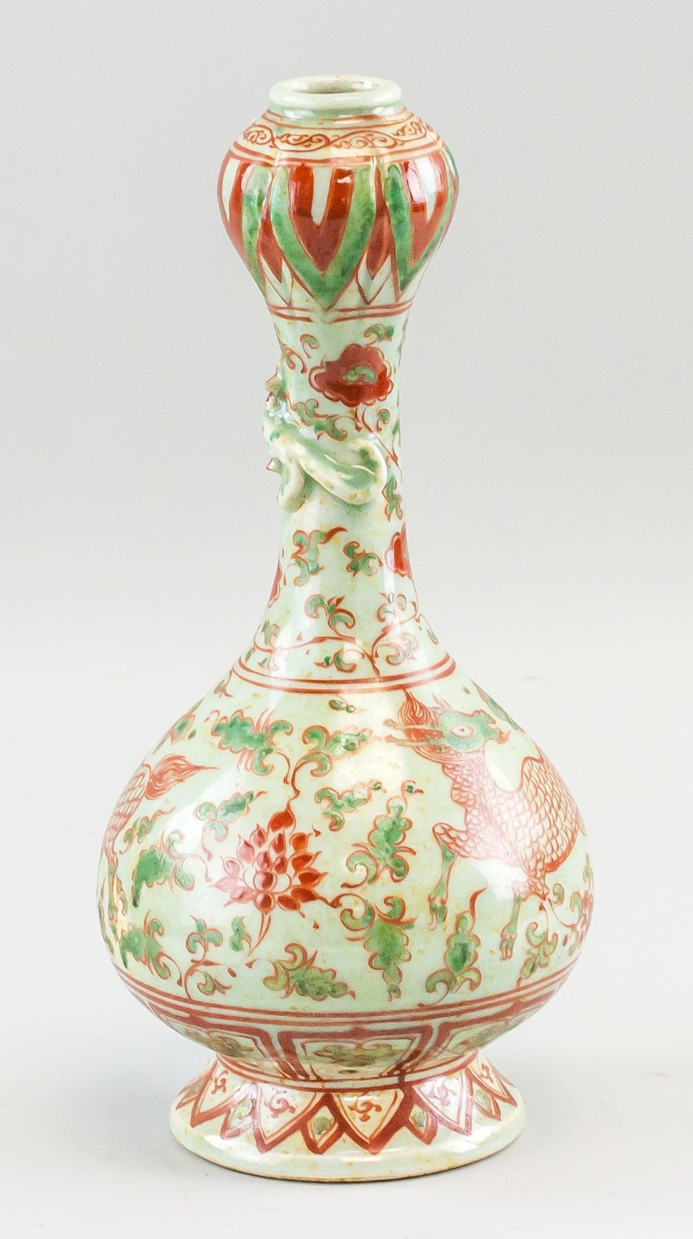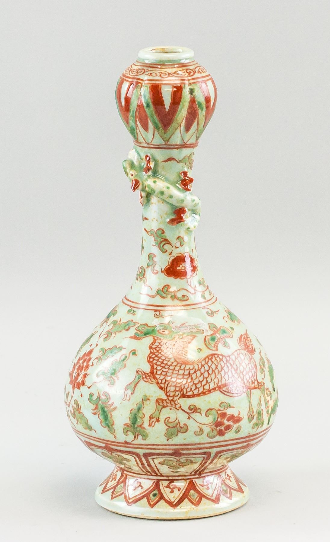 Chinese Wucai porcelain vase. Of pear body with garlic mouth. Painted with Kirin and flowers. Carved with dragon around mouth. With crack on mouth rim. 16 x 33 cm, 1258 grams