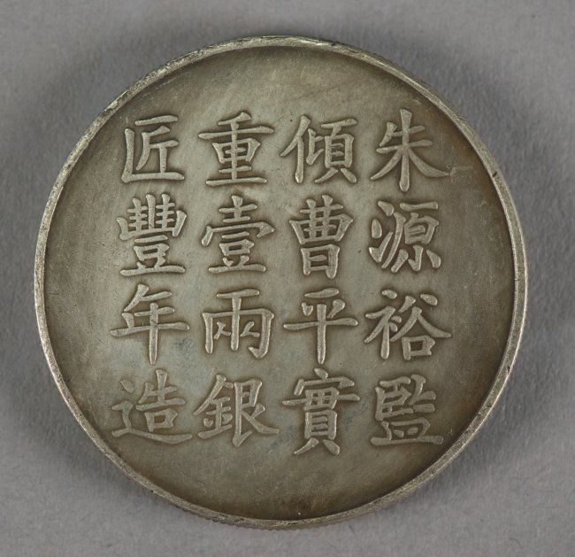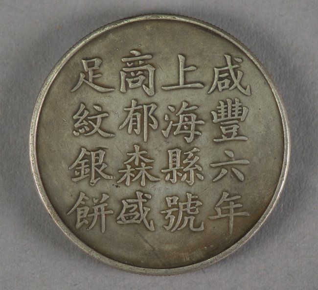 Chinese Xianfeng Shanghai Made Silver Coin; D: 4.2 cm, Thickness: 0.37 cm, 34 grams, silver not tested for purity; Provenance: private Canadian coin collector