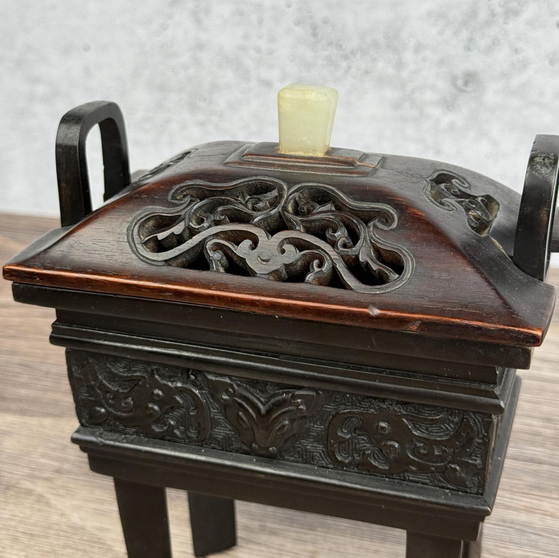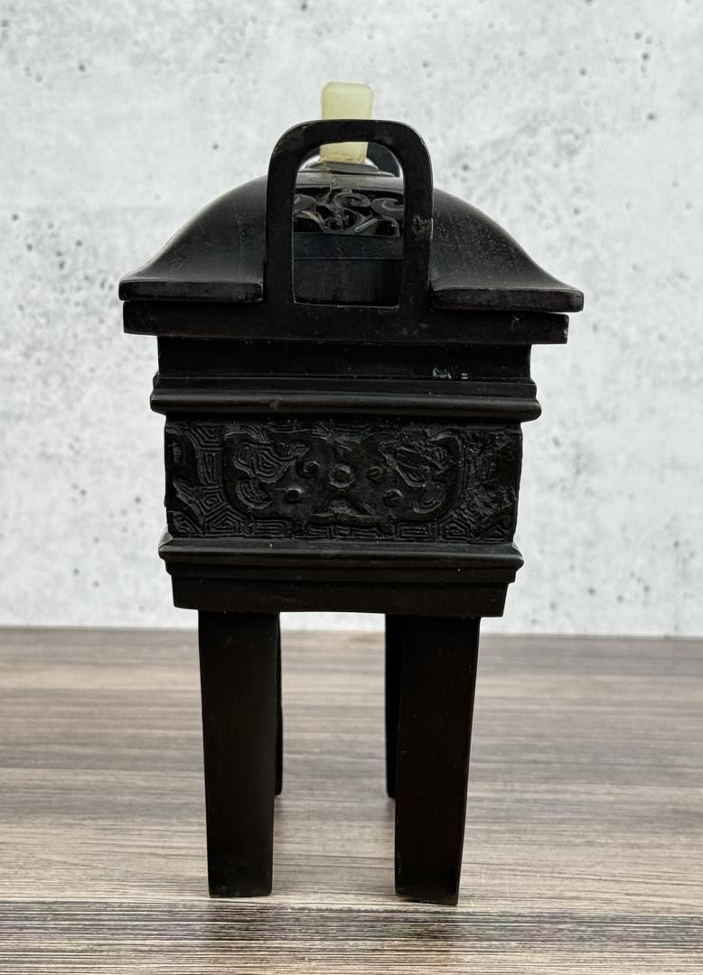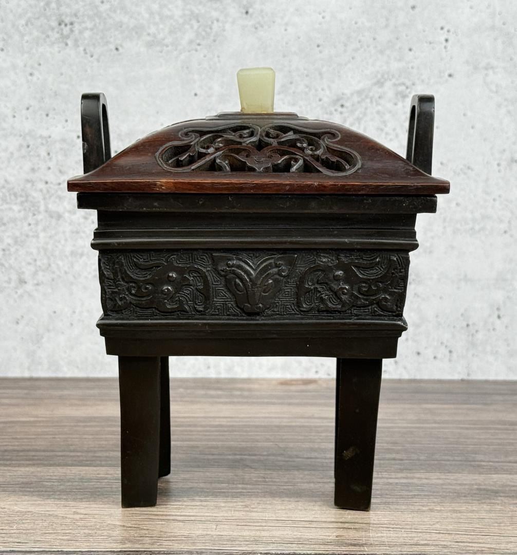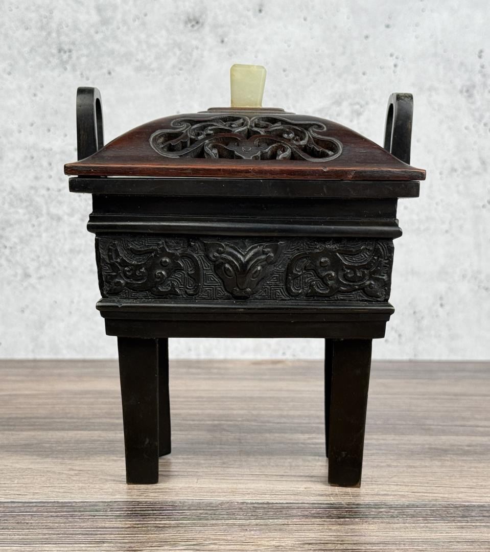 Bronze Censer is 6 7/8" long by 3 3/4" wide 5 3/4" tall. Jade knob. Reign Mark is Xuande Ming Dynasty, Censer is Late Qing to Early Republic Period. Fang Ding Style.