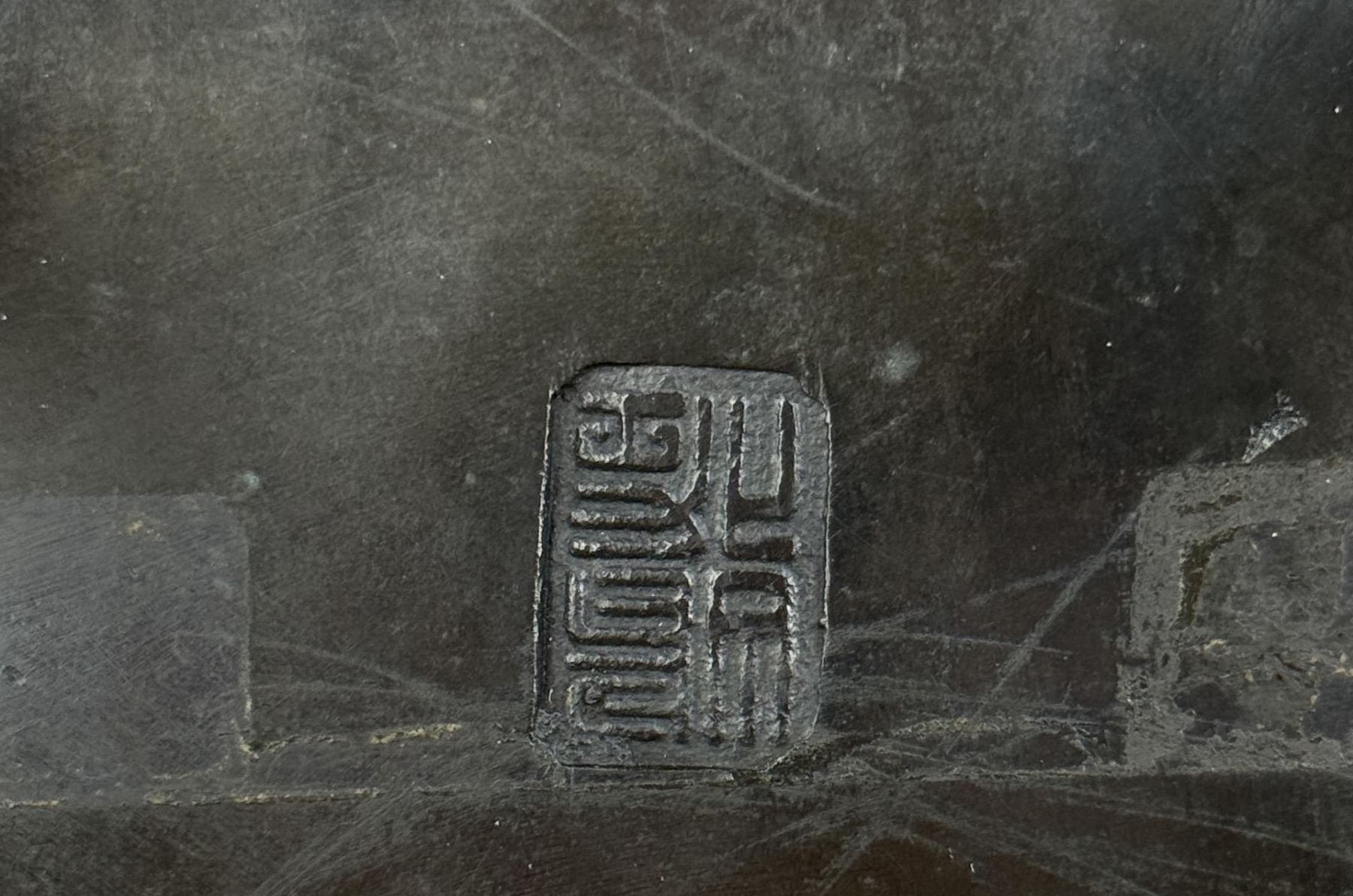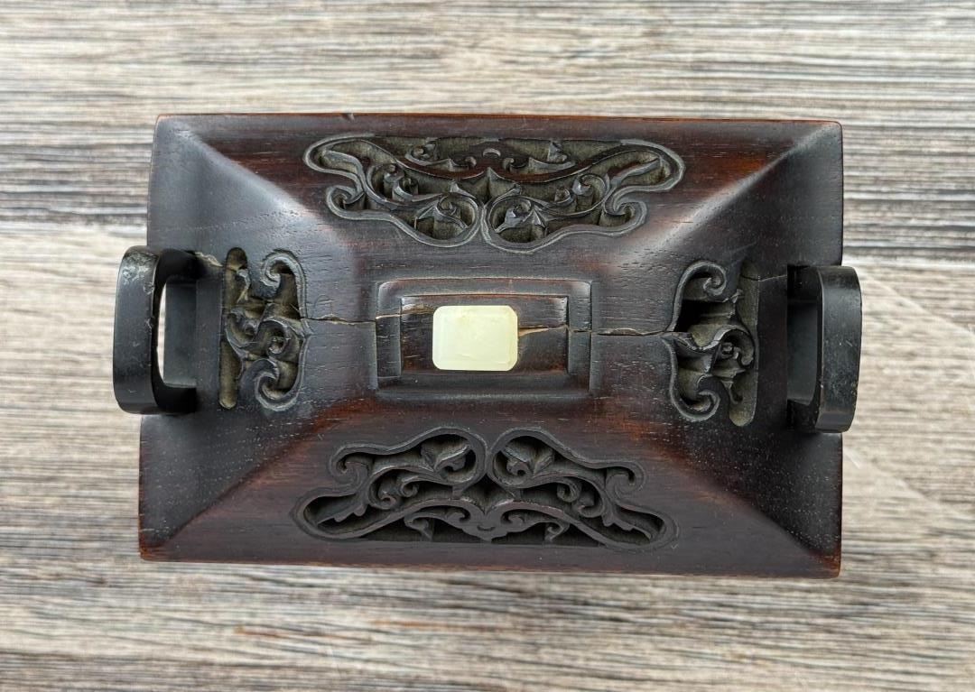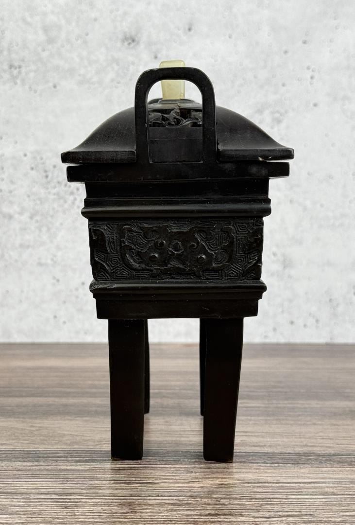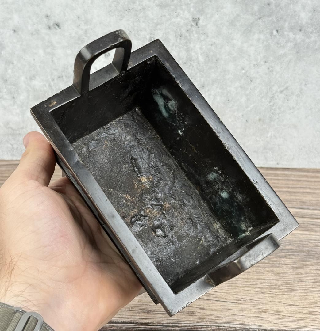 Bronze Censer is 6 7/8" long by 3 3/4" wide 5 3/4" tall. Jade knob. Reign Mark is Xuande Ming Dynasty, Censer is Late Qing to Early Republic Period. Fang Ding Style.