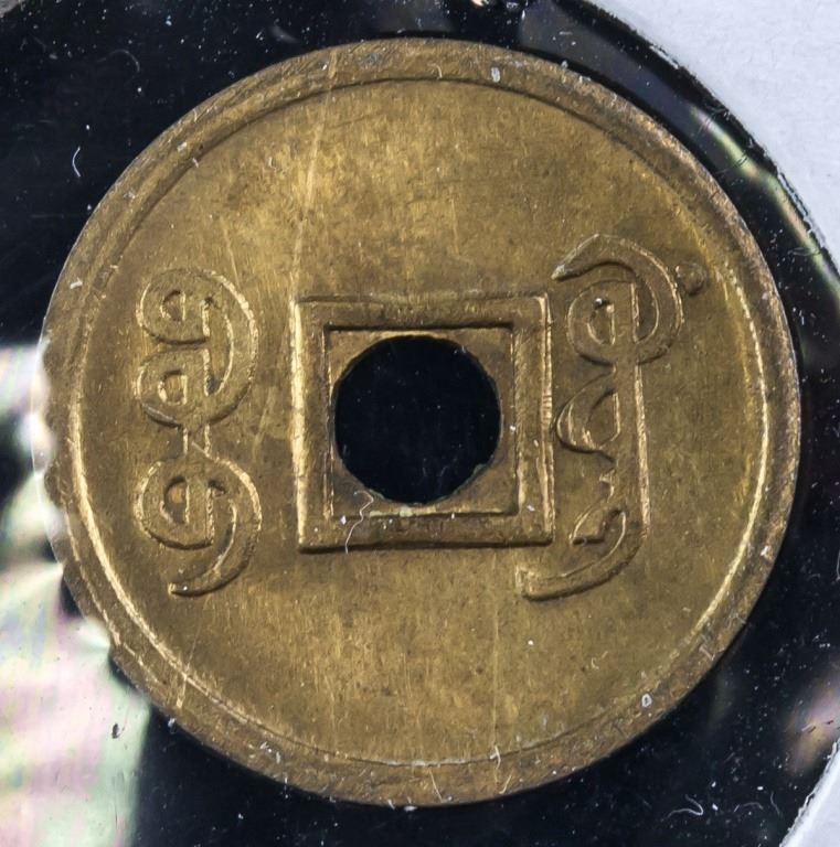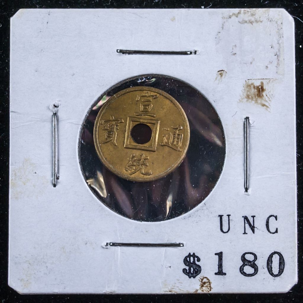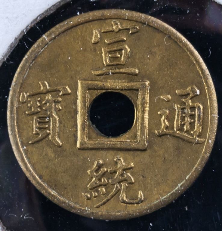 Chinese coin. Obverse: Four Chinese ideograms read top to bottom, right to left. Lettering: XUAN TONG TONG BAO. Reverse: Two Manchu words (read vertically) separated by the hole. Diameter: 1.5 cm. 3 grams (with case).