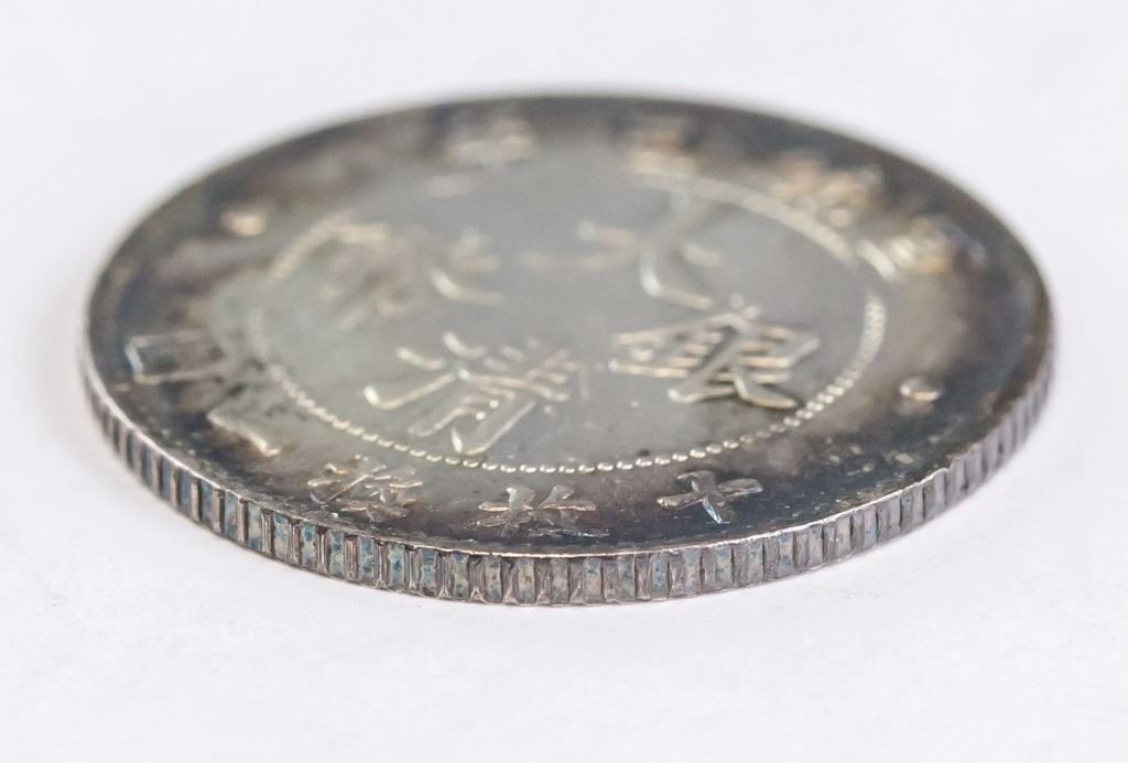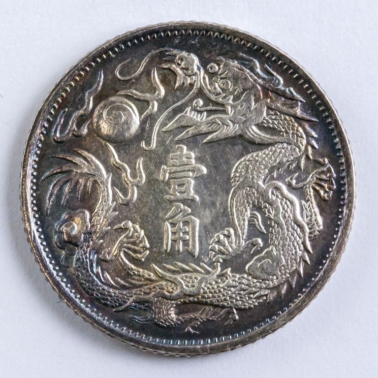 Chinese coin. Obverse: XUAN TONG SAN NIAN / DA QING YIN BI / SHI MEI HUAN YI YUAN. Reverse: Dragon with pearl to the upper left. YI JIAO. Diameter: 2 cm. 3 grams.