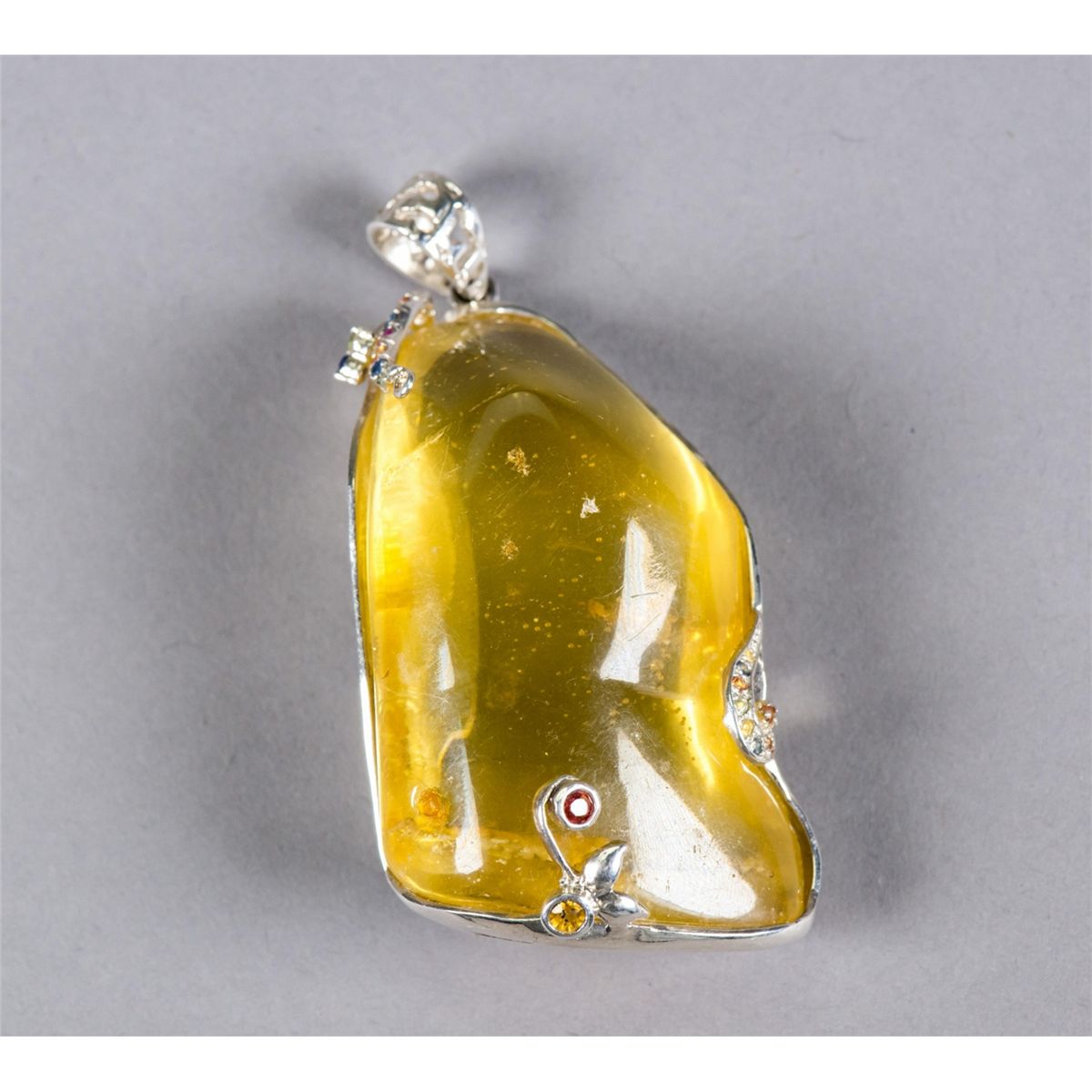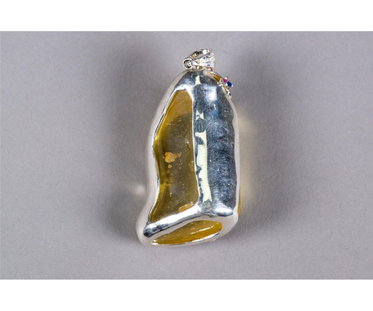 Chinese yellow amber pendant; featuring insect inclusion; of translucent yellow tone; H: 7 cm, W: 3.5 cm, 33 grams