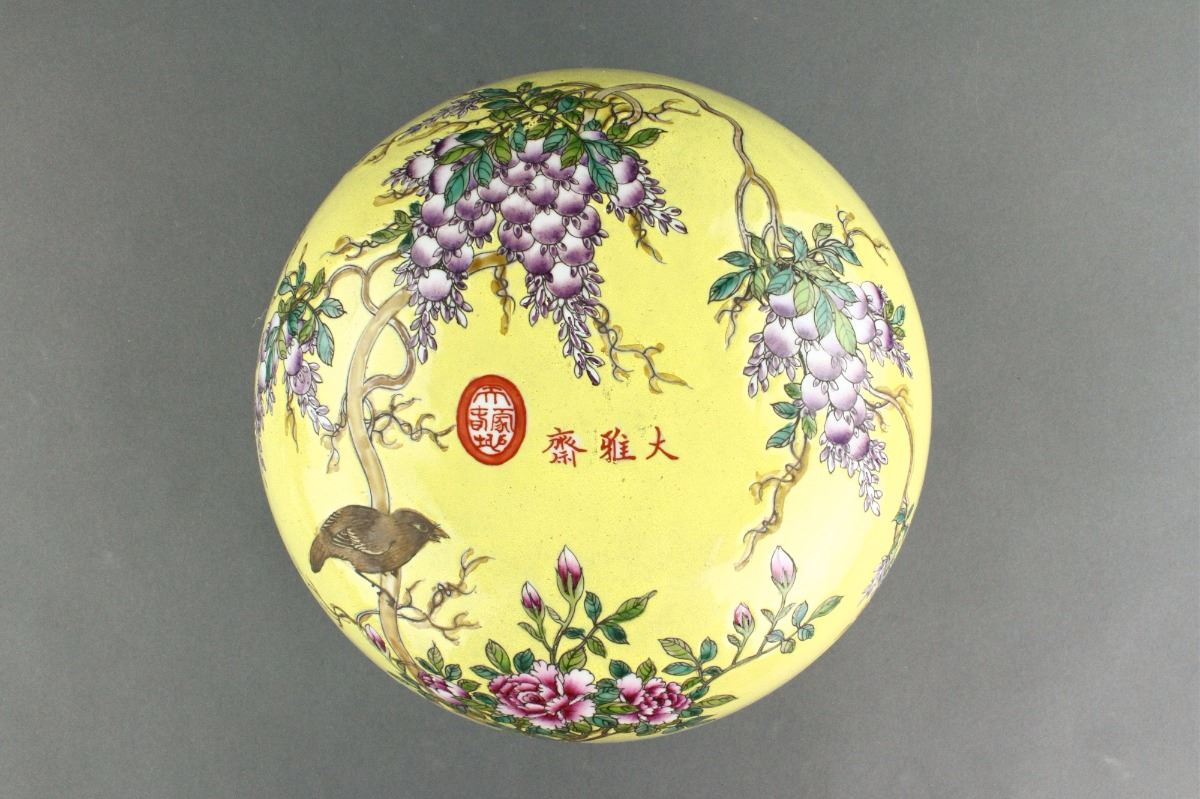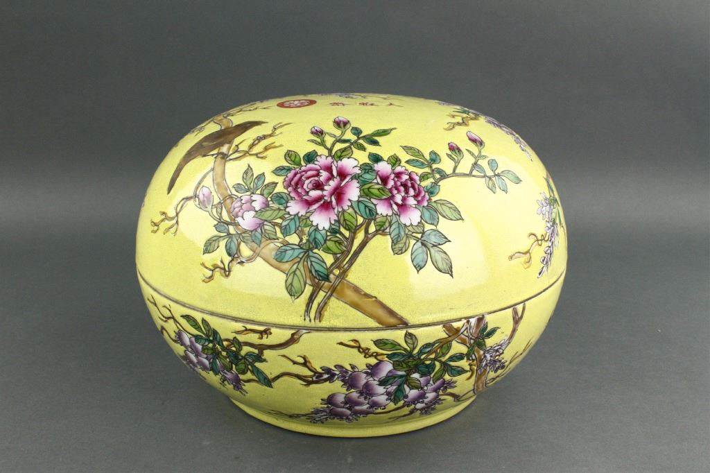 Chinese porcelain box with domed cover; featuring flower and birds on yellow round; Dayazhai mark and seal on cover; four-character Yongqing Changchun mark on base; H: 20 cm, D: 30 cm, 3331 grams