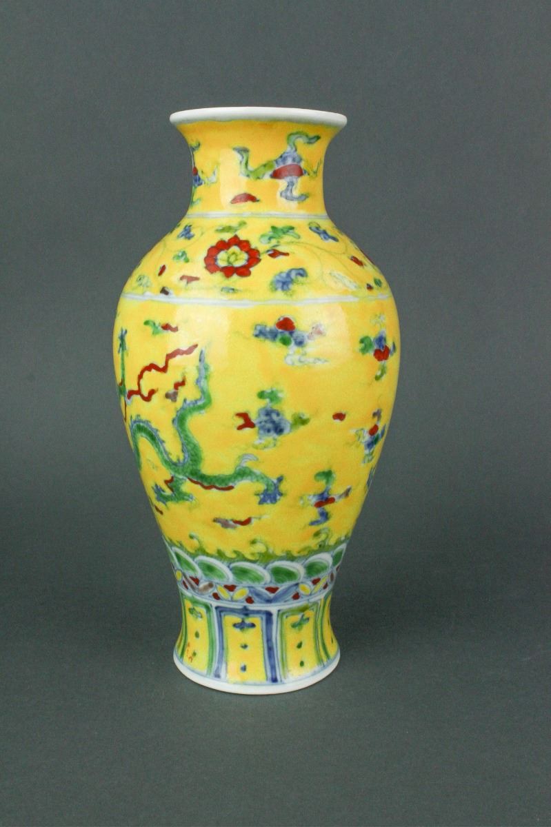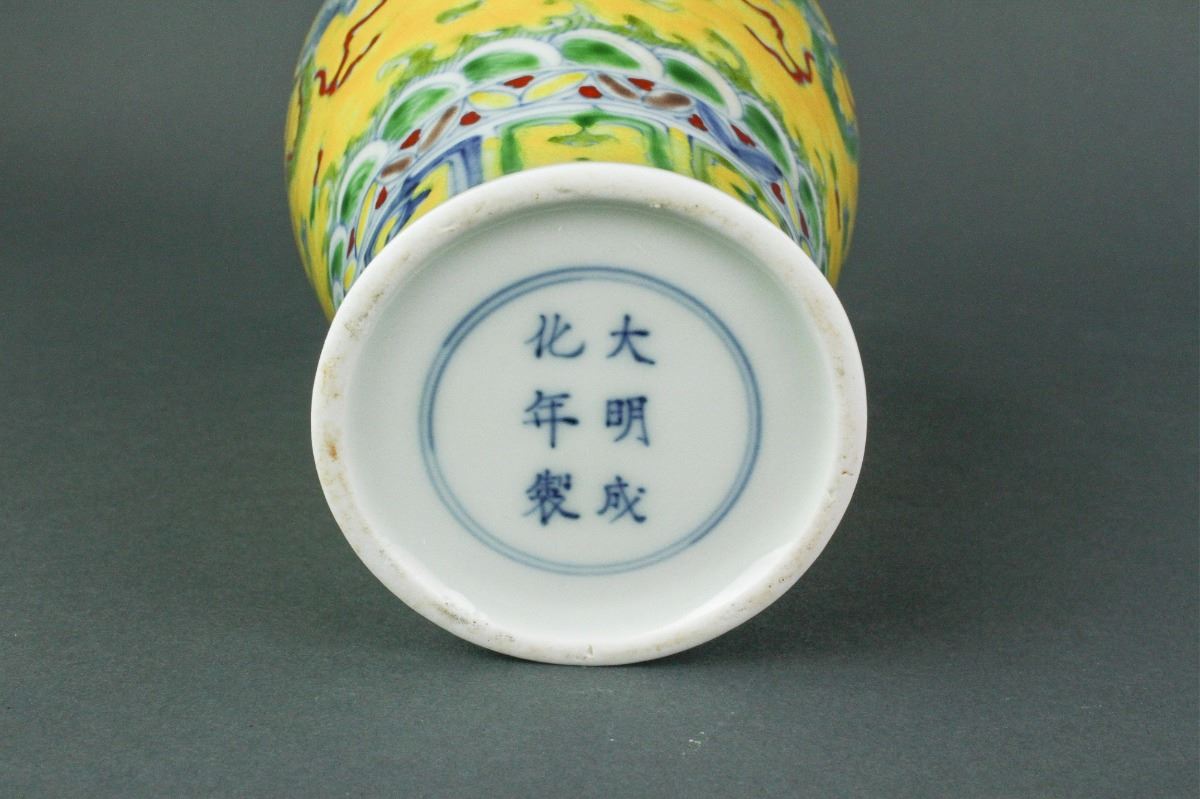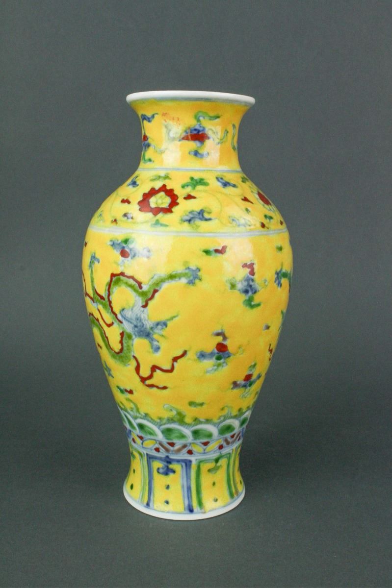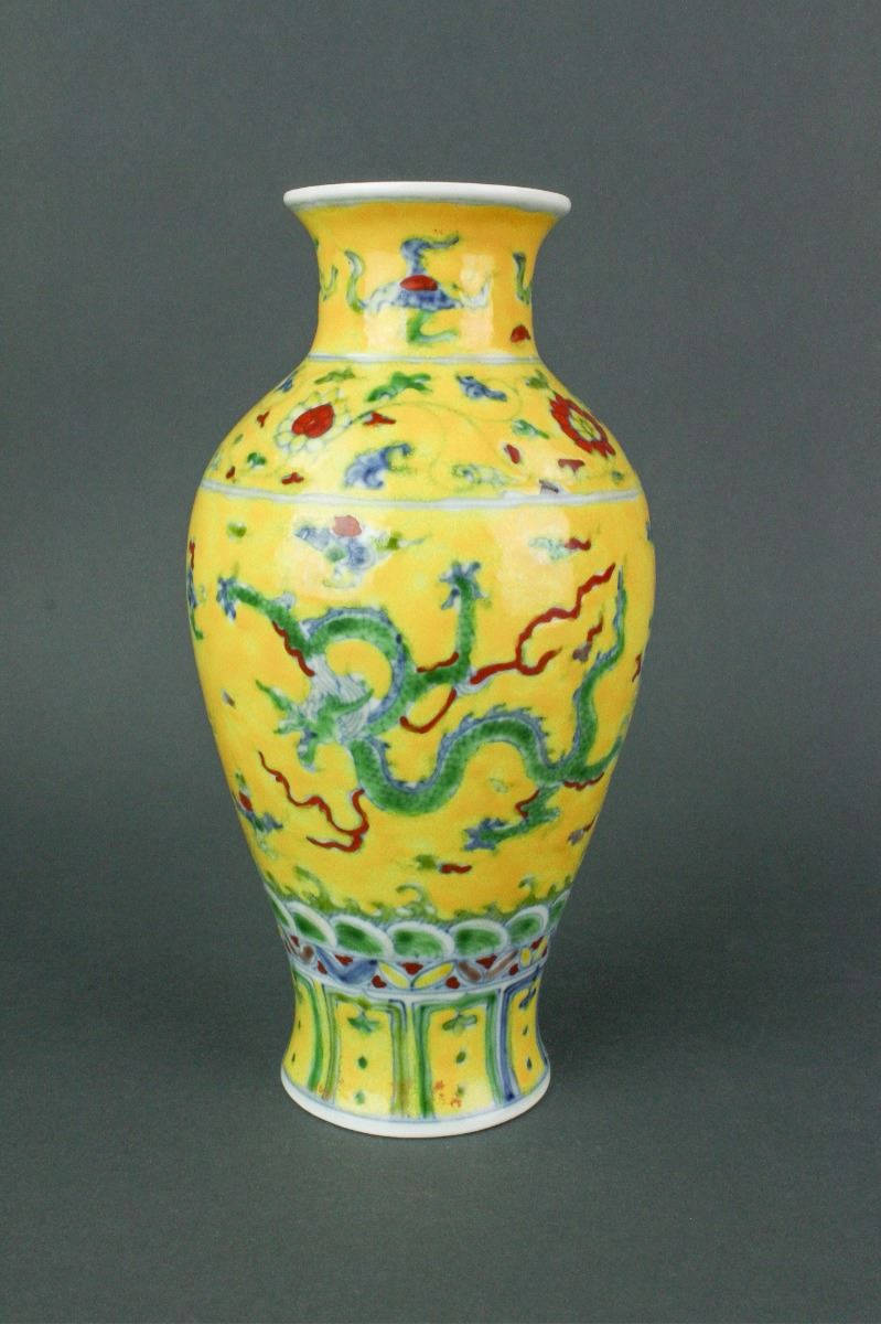 Chinese imperial Doucai porcelain vase; of baluster form; featuring dragon chasing flaming pearl on yellow ground; six-character Ming Chenghua mark on base; H: 21 cm, D: 10 cm, 253 grams