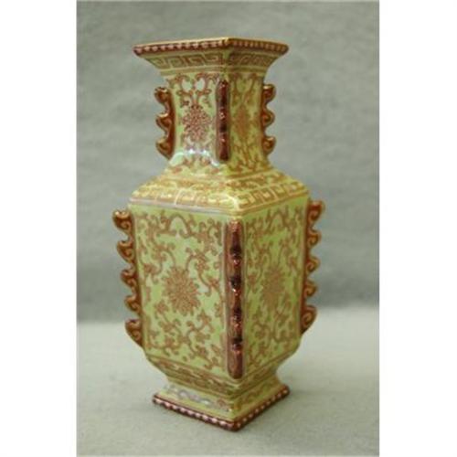 Chinese Yellow Glaze Porcelain Square Vase. decorated with floral. 5.5" high, good condition.