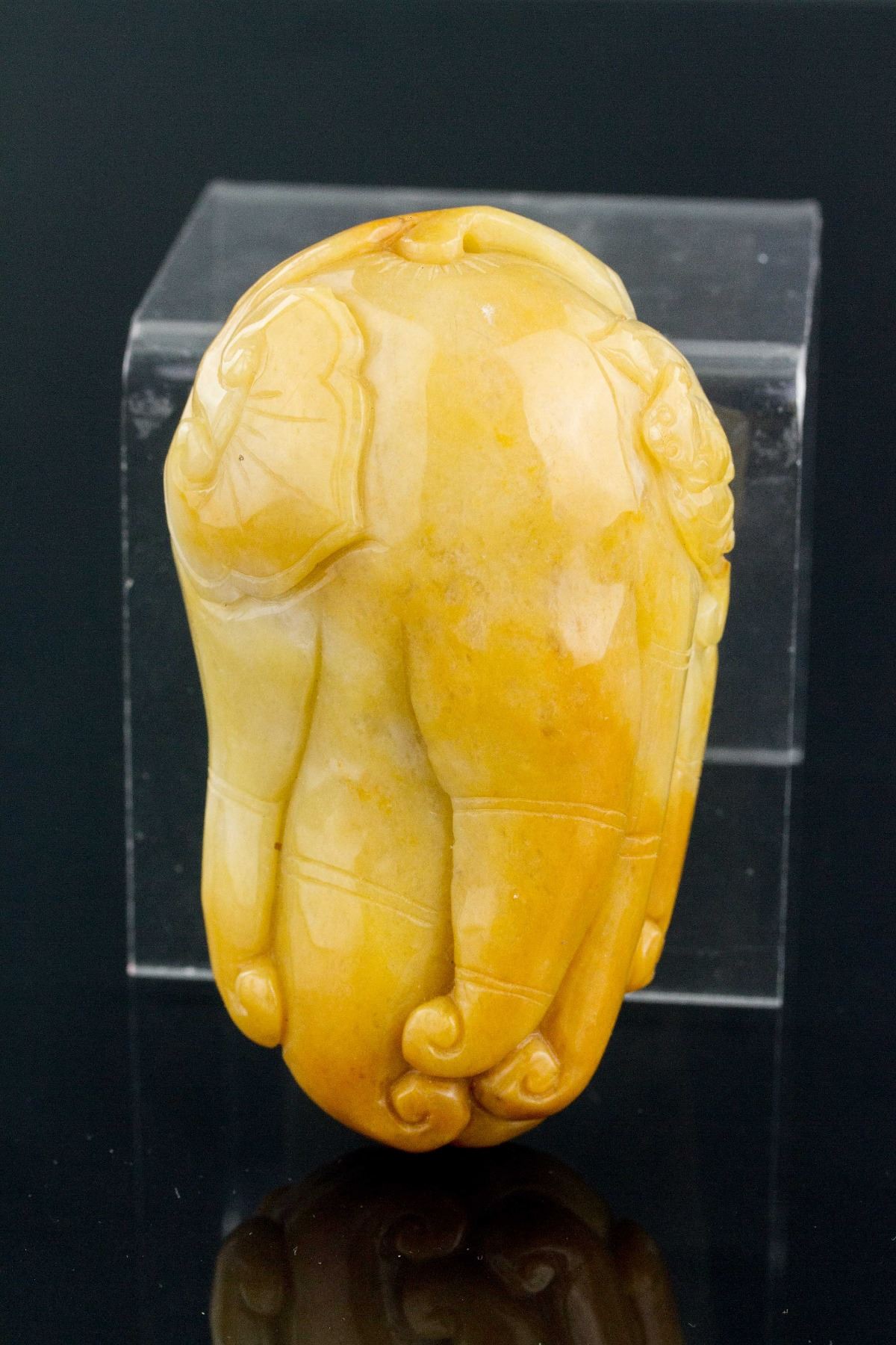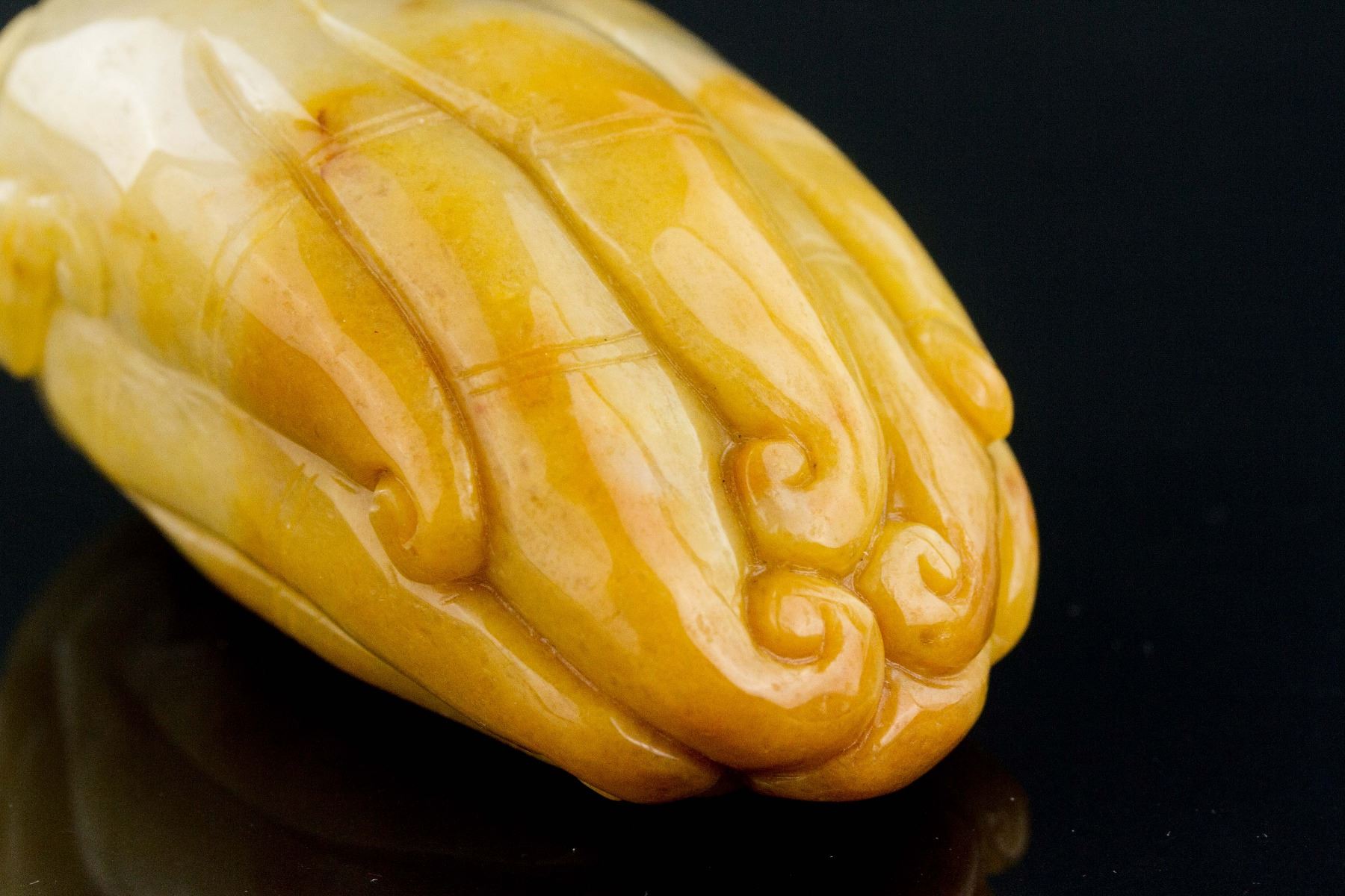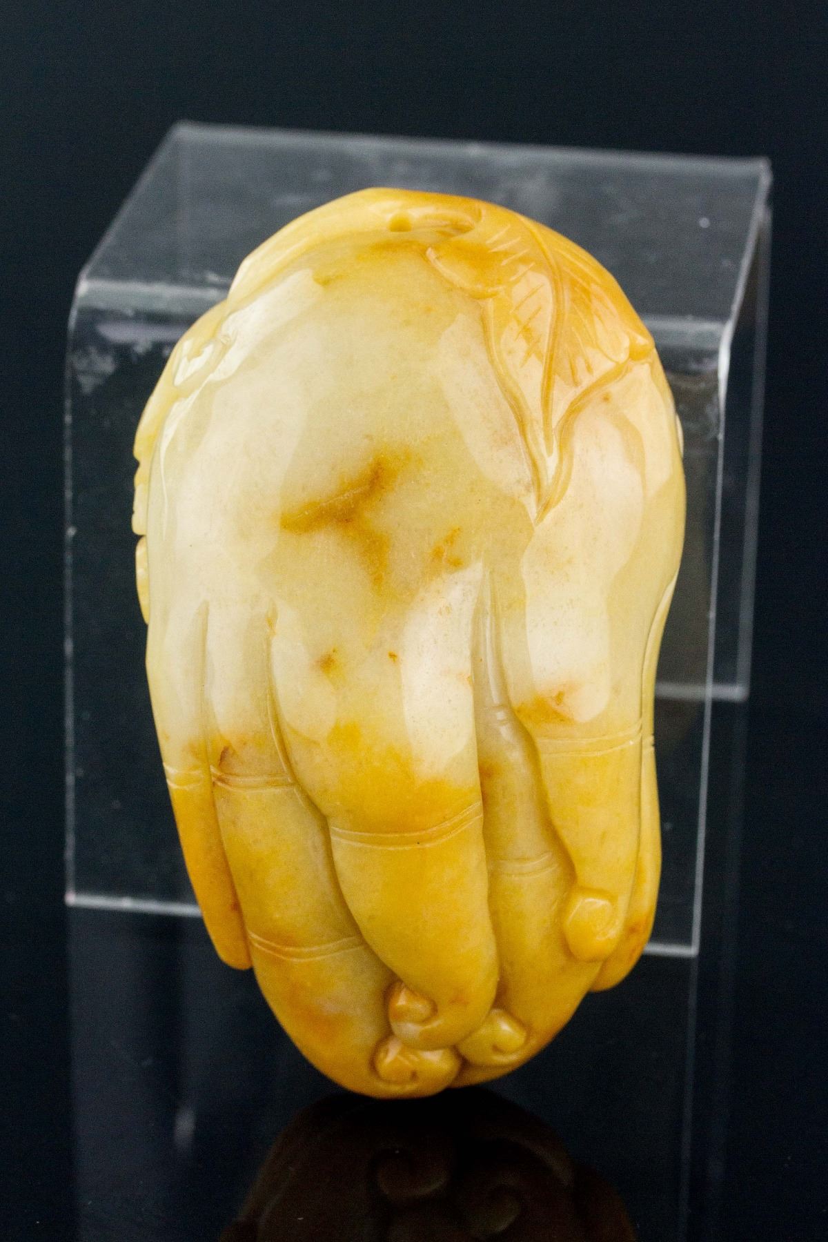Chinese yellow hardstone carved toggle; carved in a Buddha's hand form with ruyi form leaf; of orange yellow tone; 11 cm x 4 cm, 357 grams