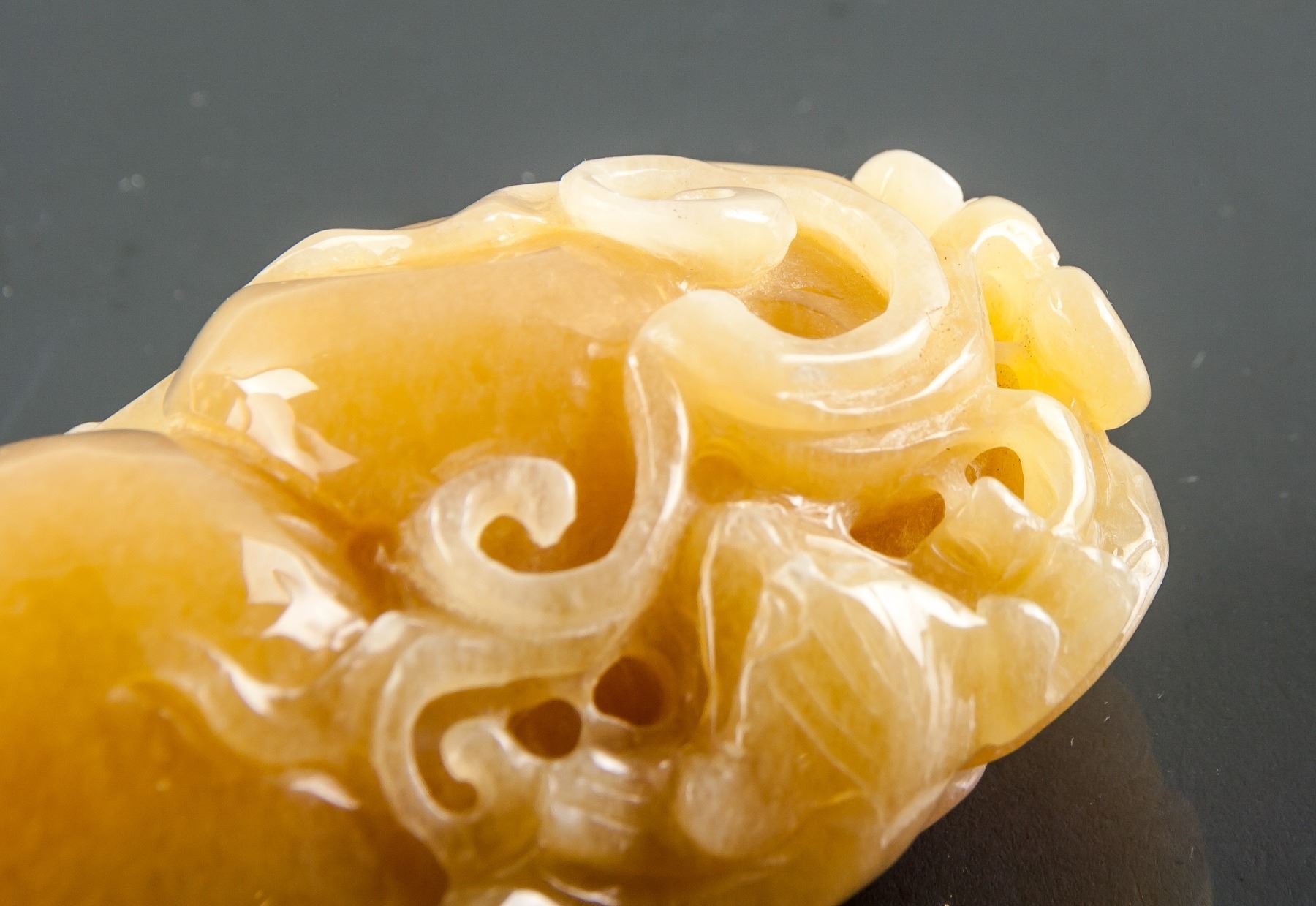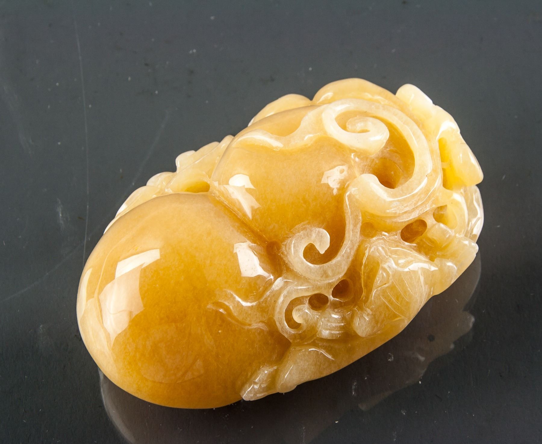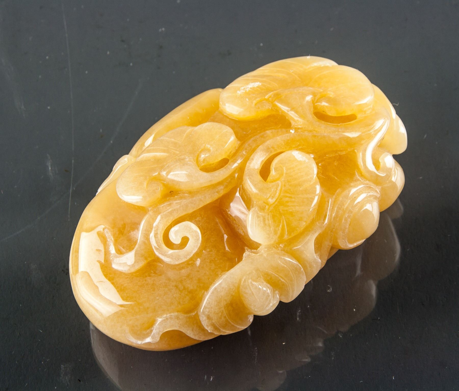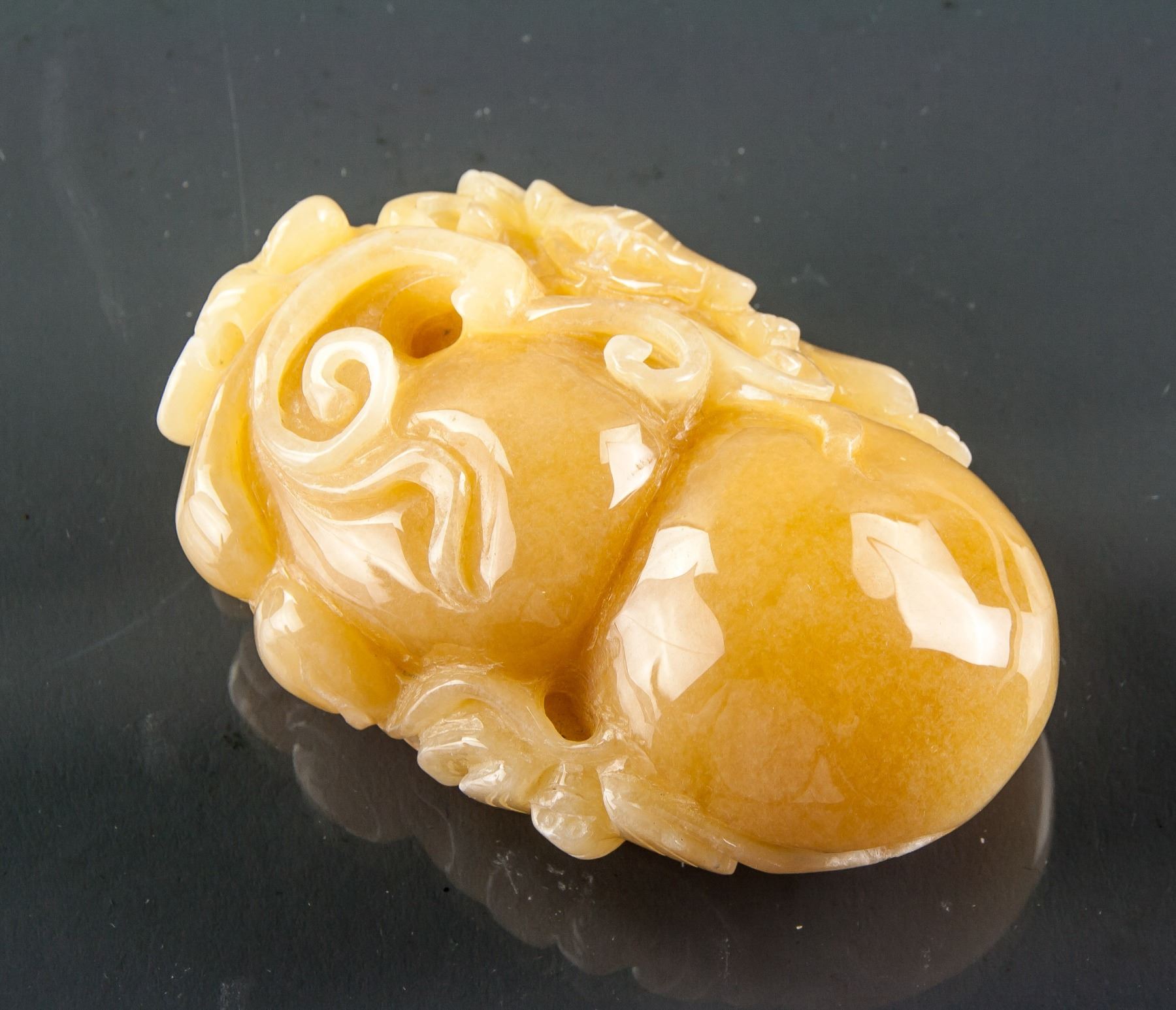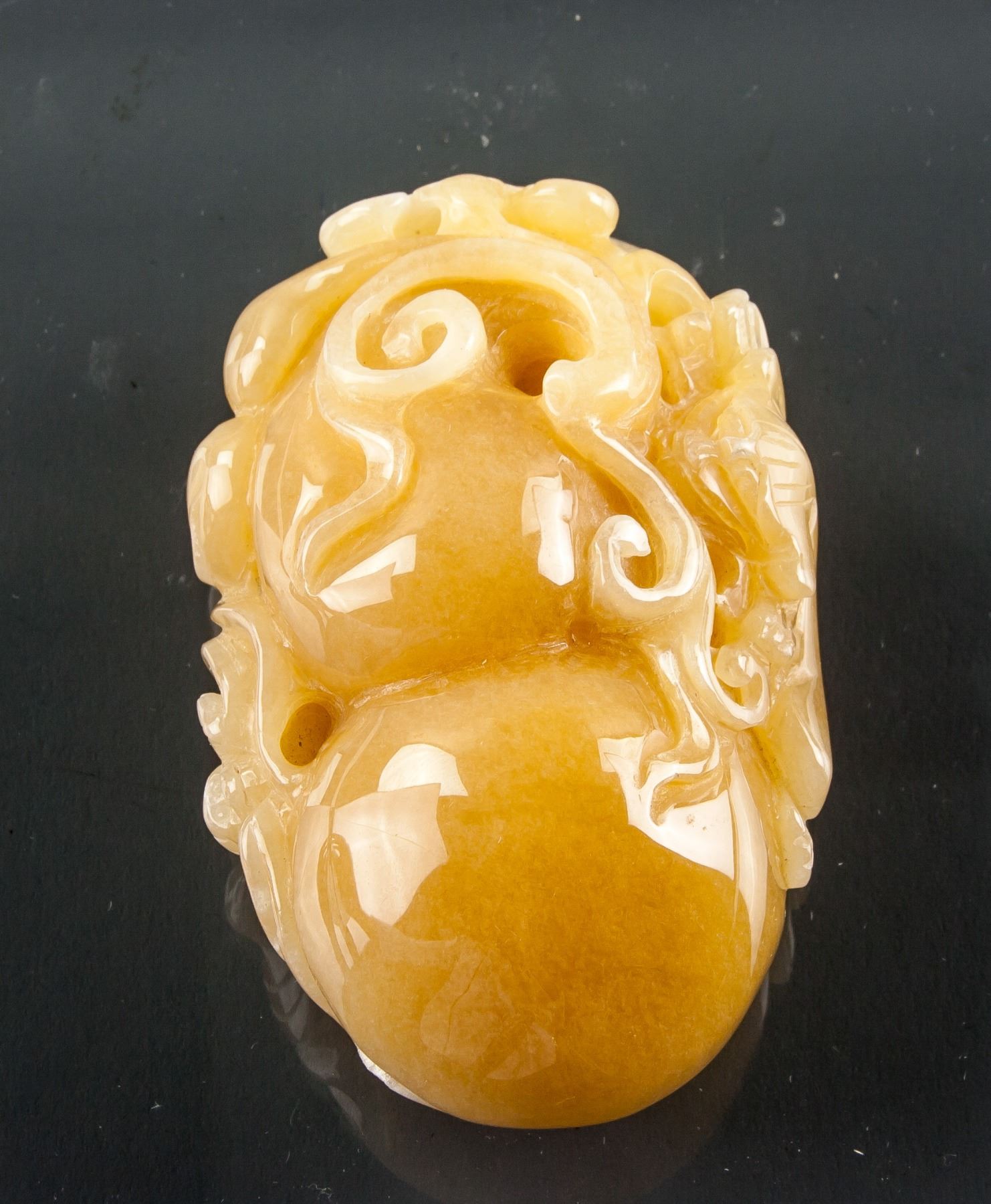 Chinese yellow hardstone carved pendant; featuring calabash and a bat; of honey yellow tone; pierced for suspension; W: 5.5 cm, L: 8.5 cm, 225 grams