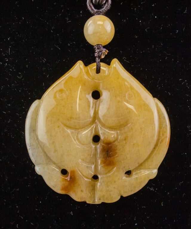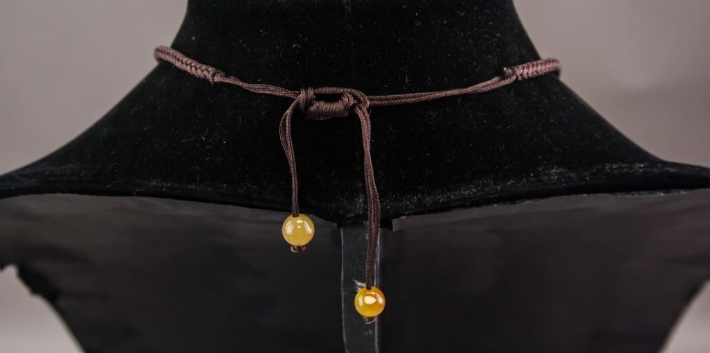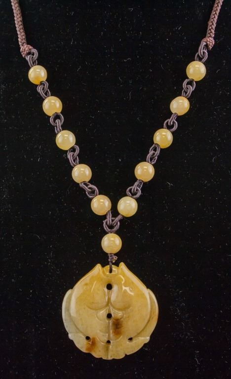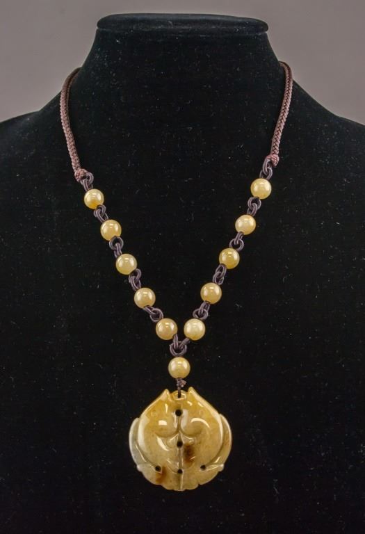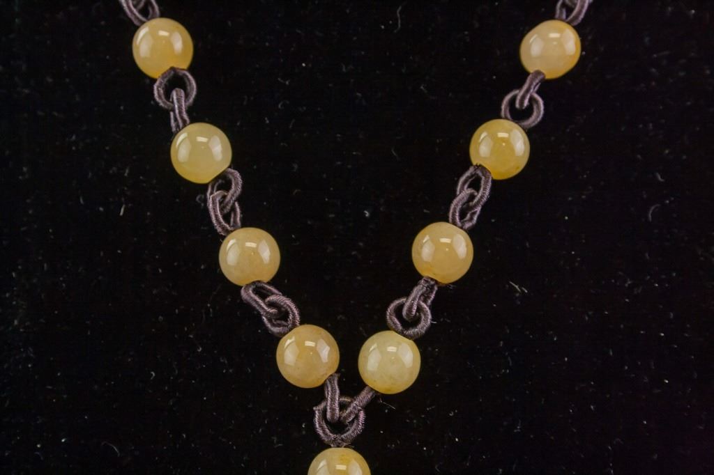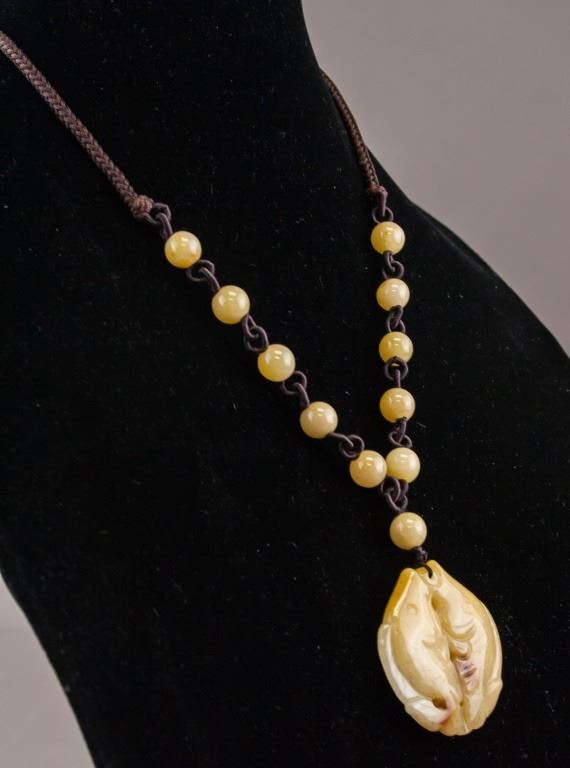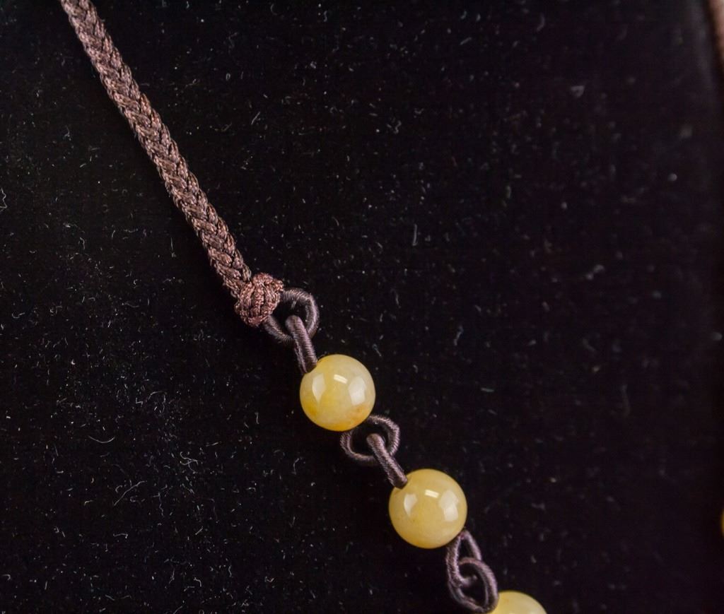 Chinese jade necklace. With double fish pendant, and small round beads. Of yellow tone. Diameter: 4.5 cm, 46 grams.