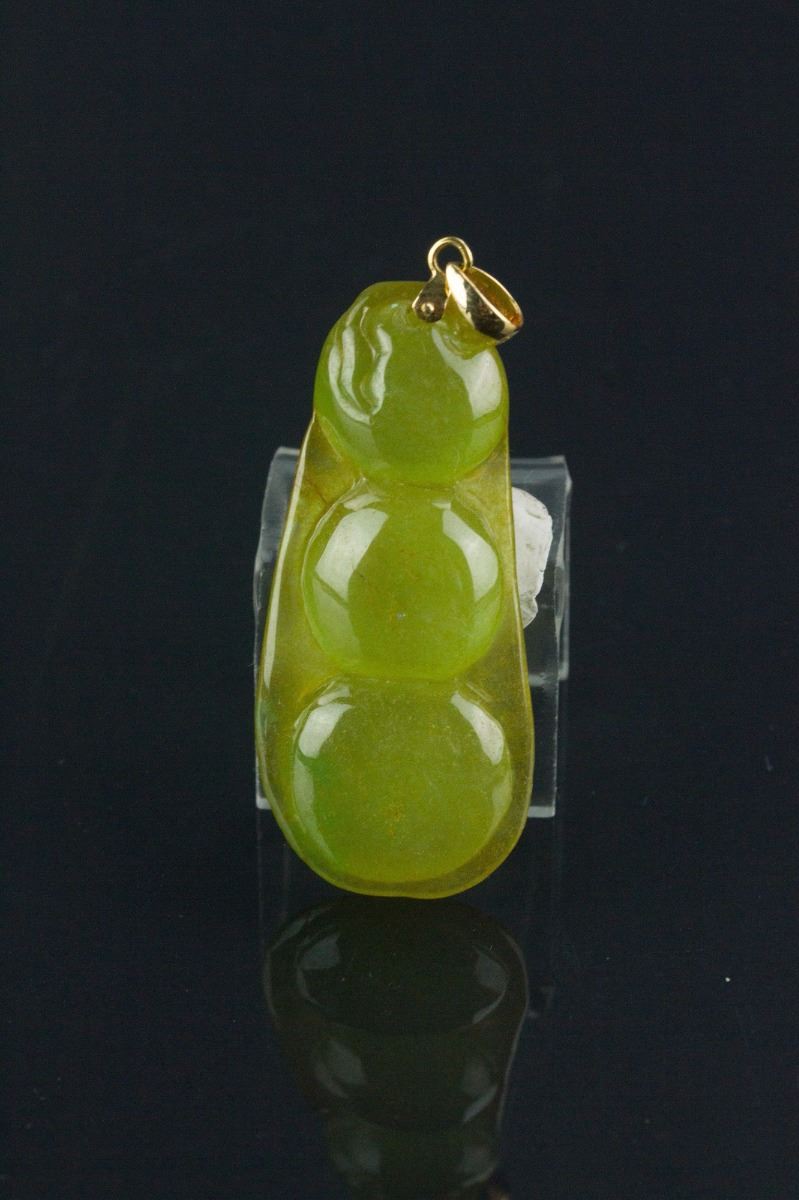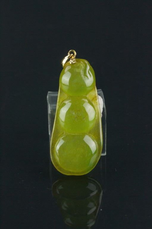 Chinese jadeite pendant; carved in shape of three beans; pierced and suspended on a 18K marked bail; Thickness: 1 cm, W: 2.5 cm, L: 5 cm, 17 grams, Density ~3.32