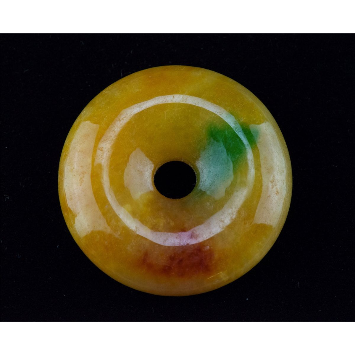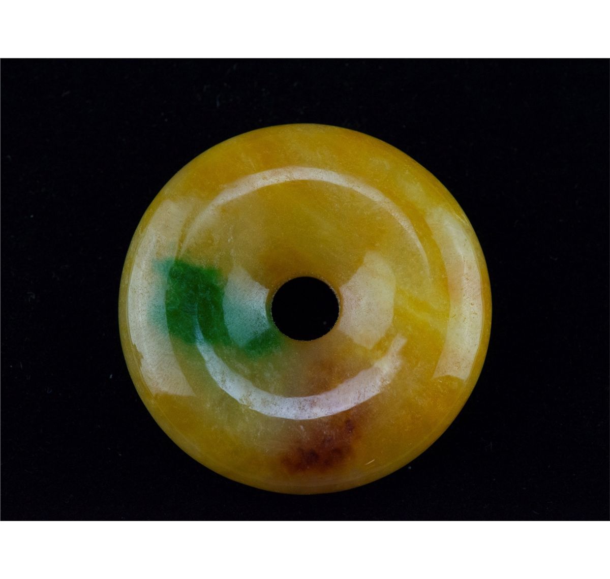 Chinese yellow jade carved round pendant, disc form with brown and green suffusions. D: 4.5 cm, 47 grams.