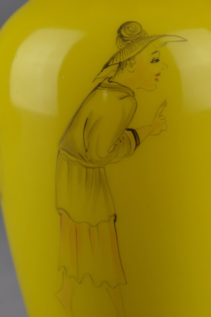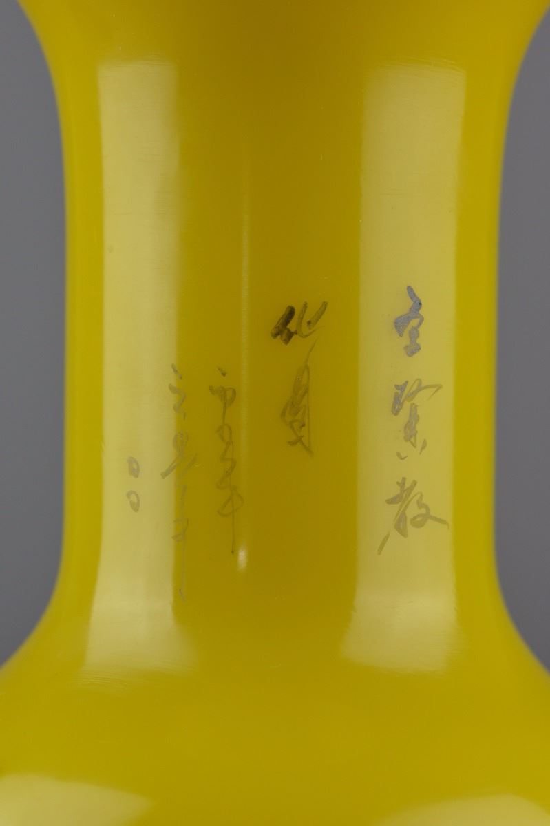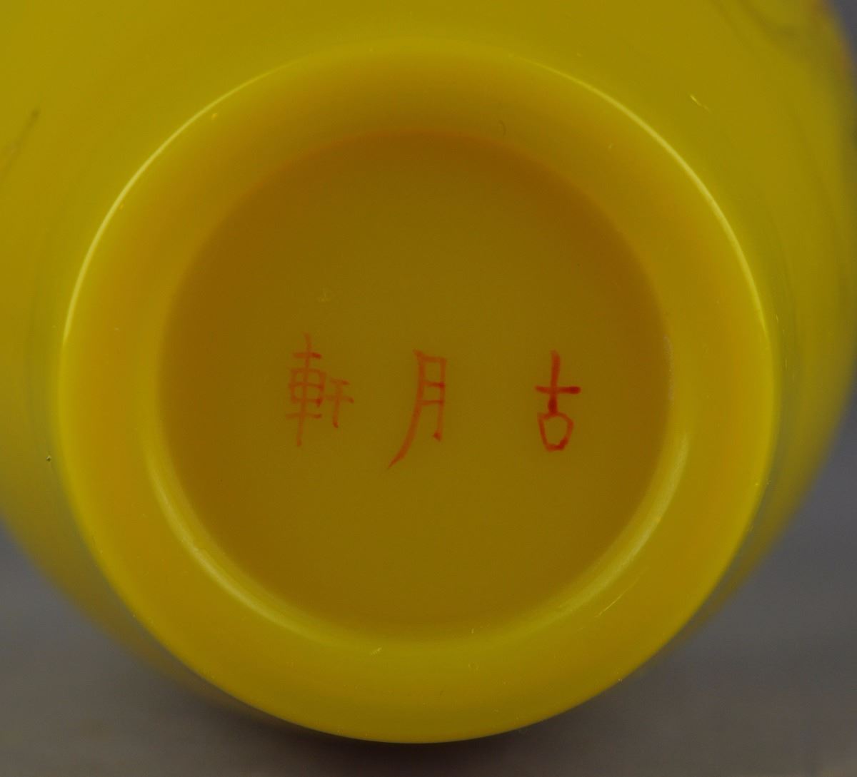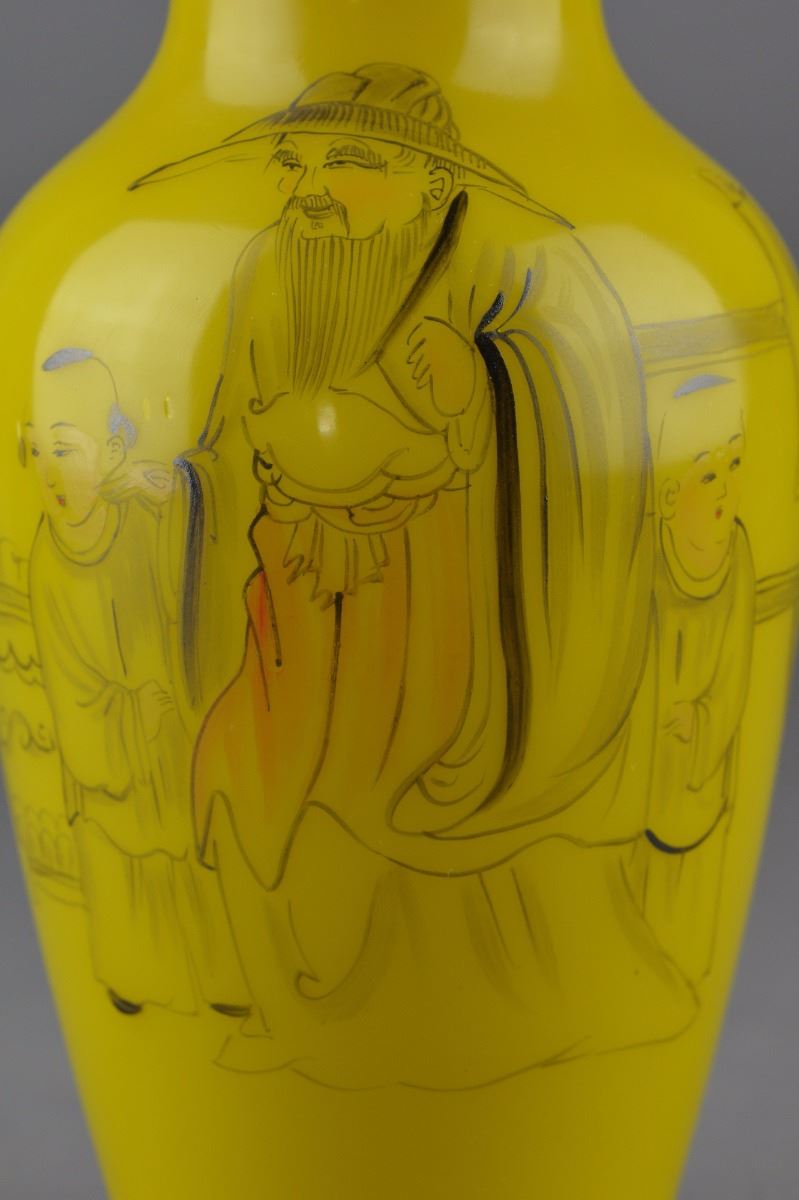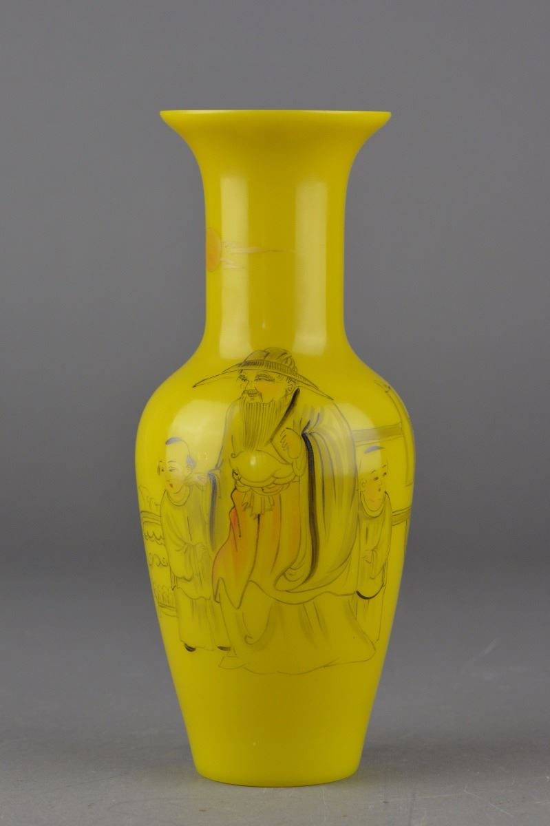 Chinese yellow Peking glass vase; ovoid body featuring figural Immortal scene of boy and old man; three-character Mark on base; H: 22 cm, D: 9.5 cm