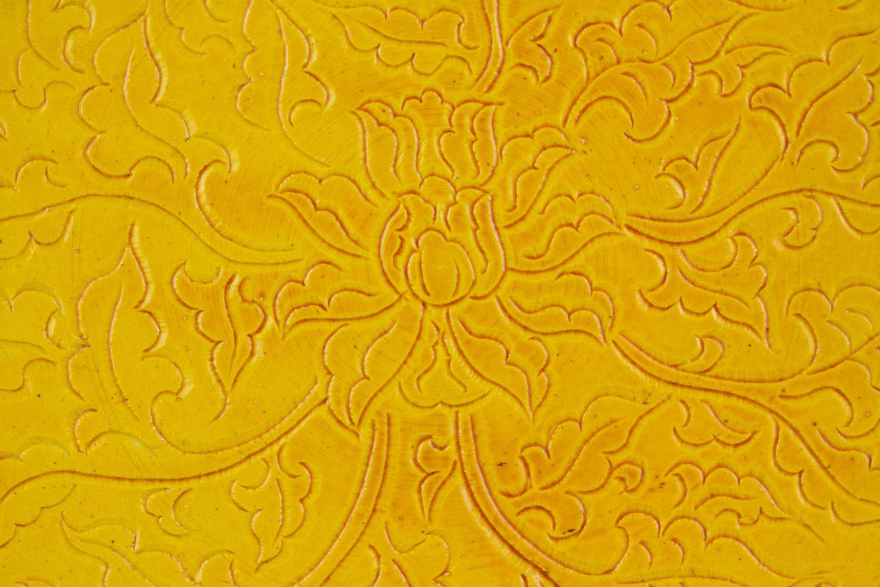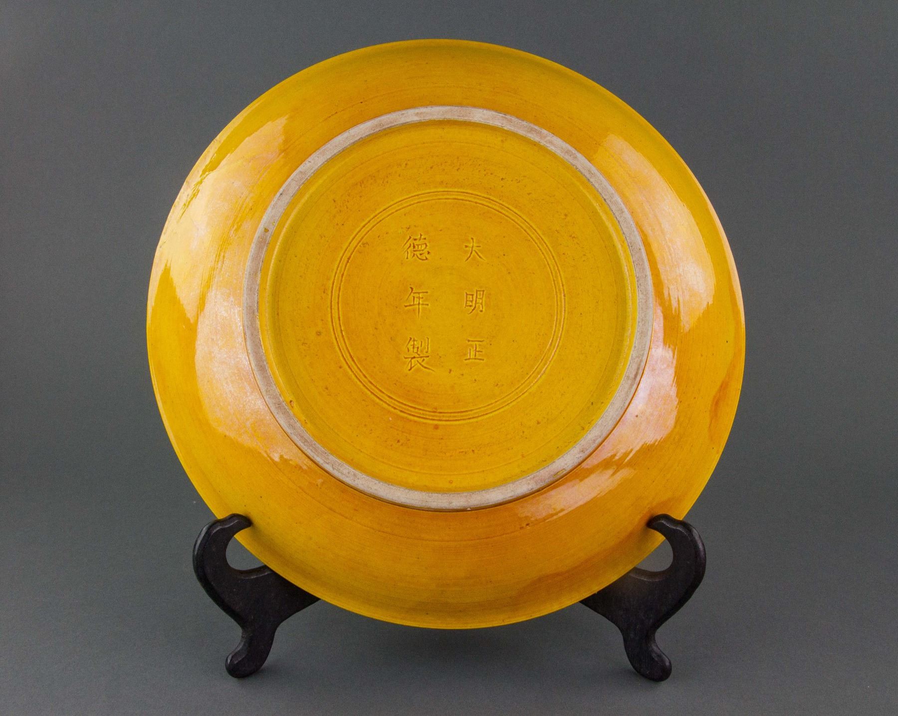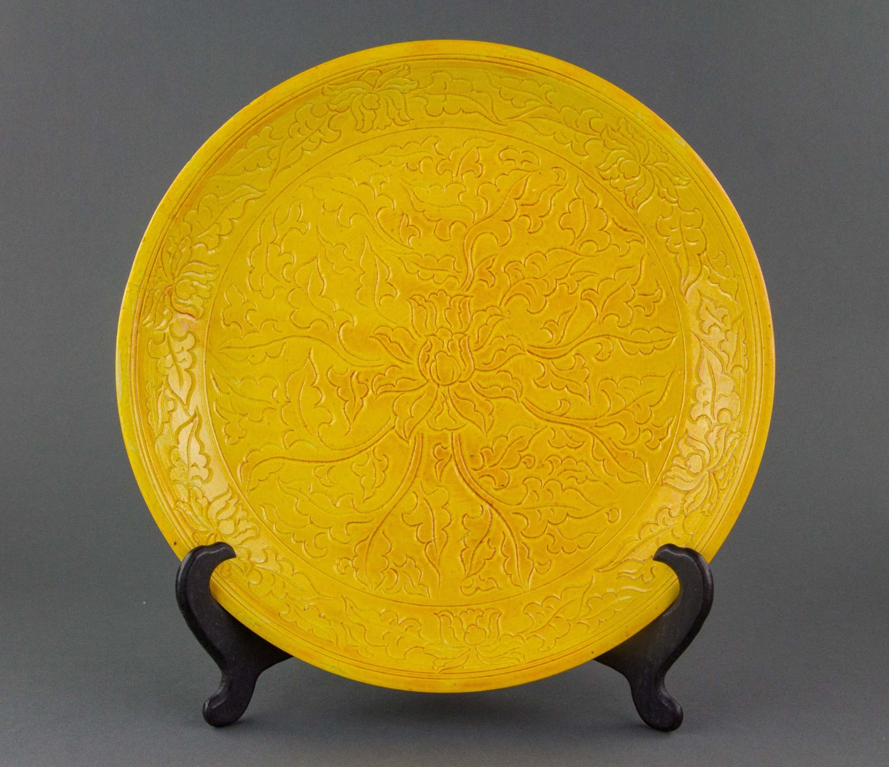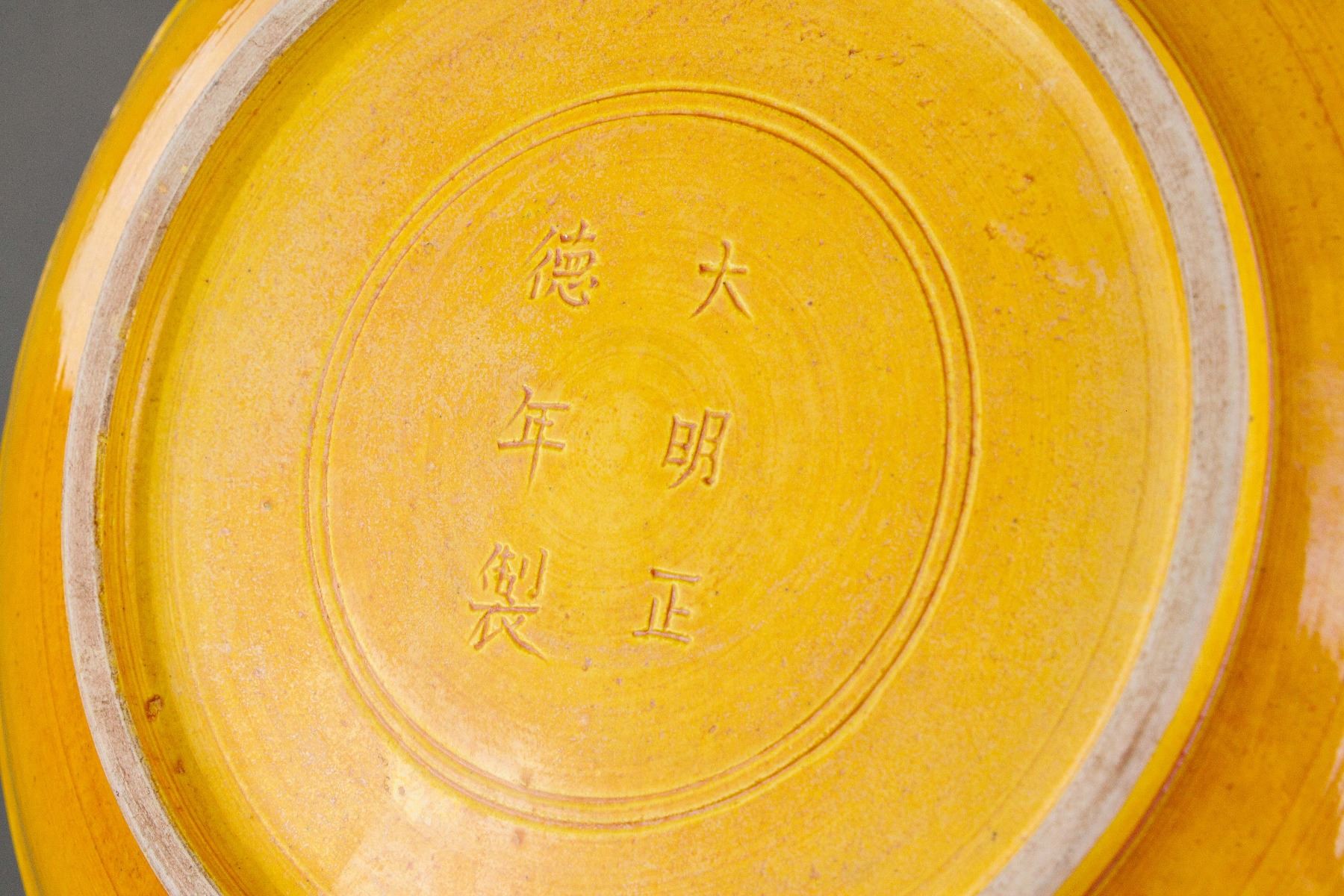 Chinese porcelain charger; of rounded edge; covered with yellow glaze; decorated with flower carving; six-character Zhengde mark on base; cracked and repaired; H: 5 cm, D: 30 cm, 1697 grams