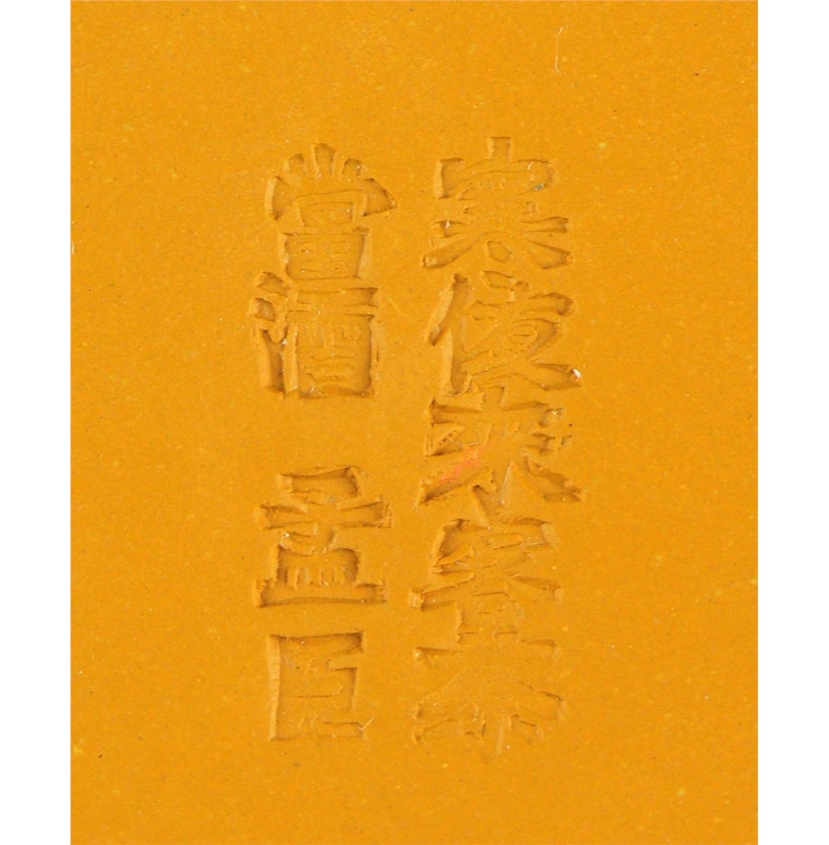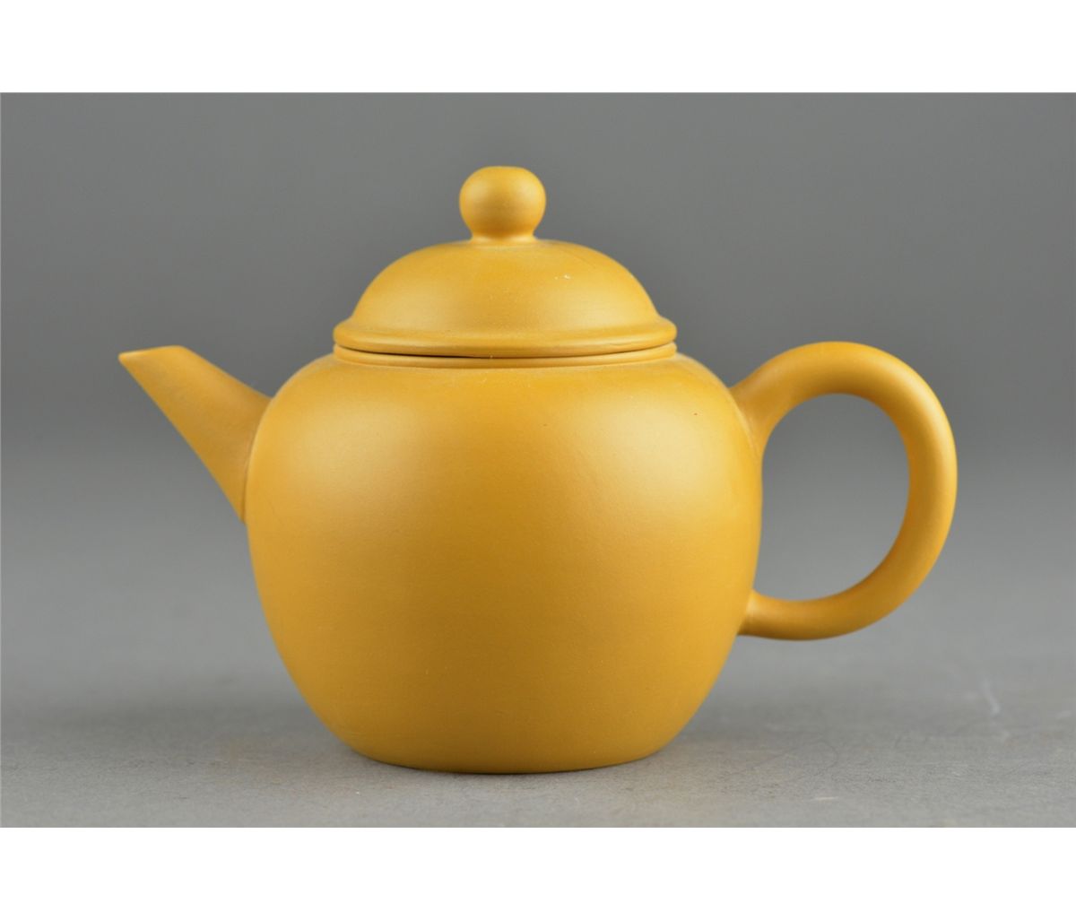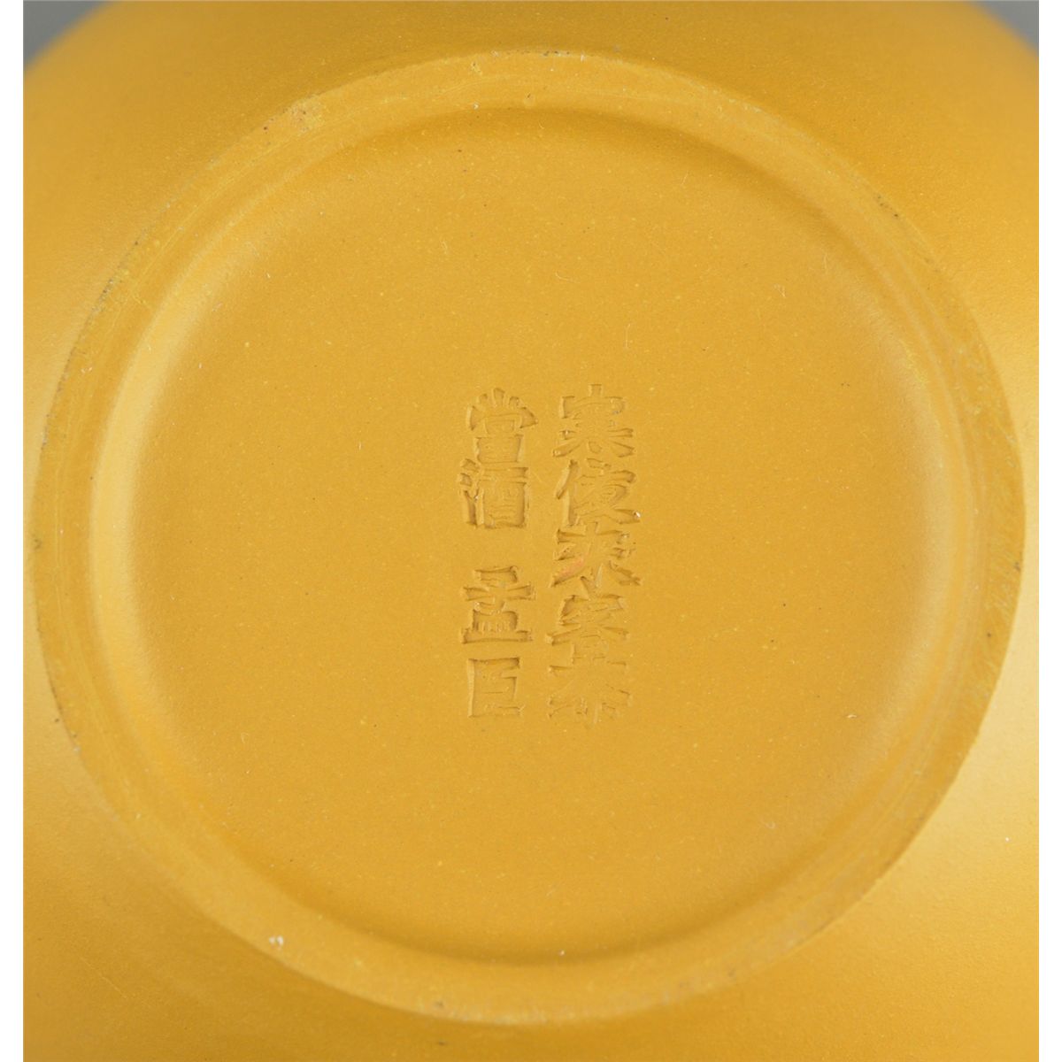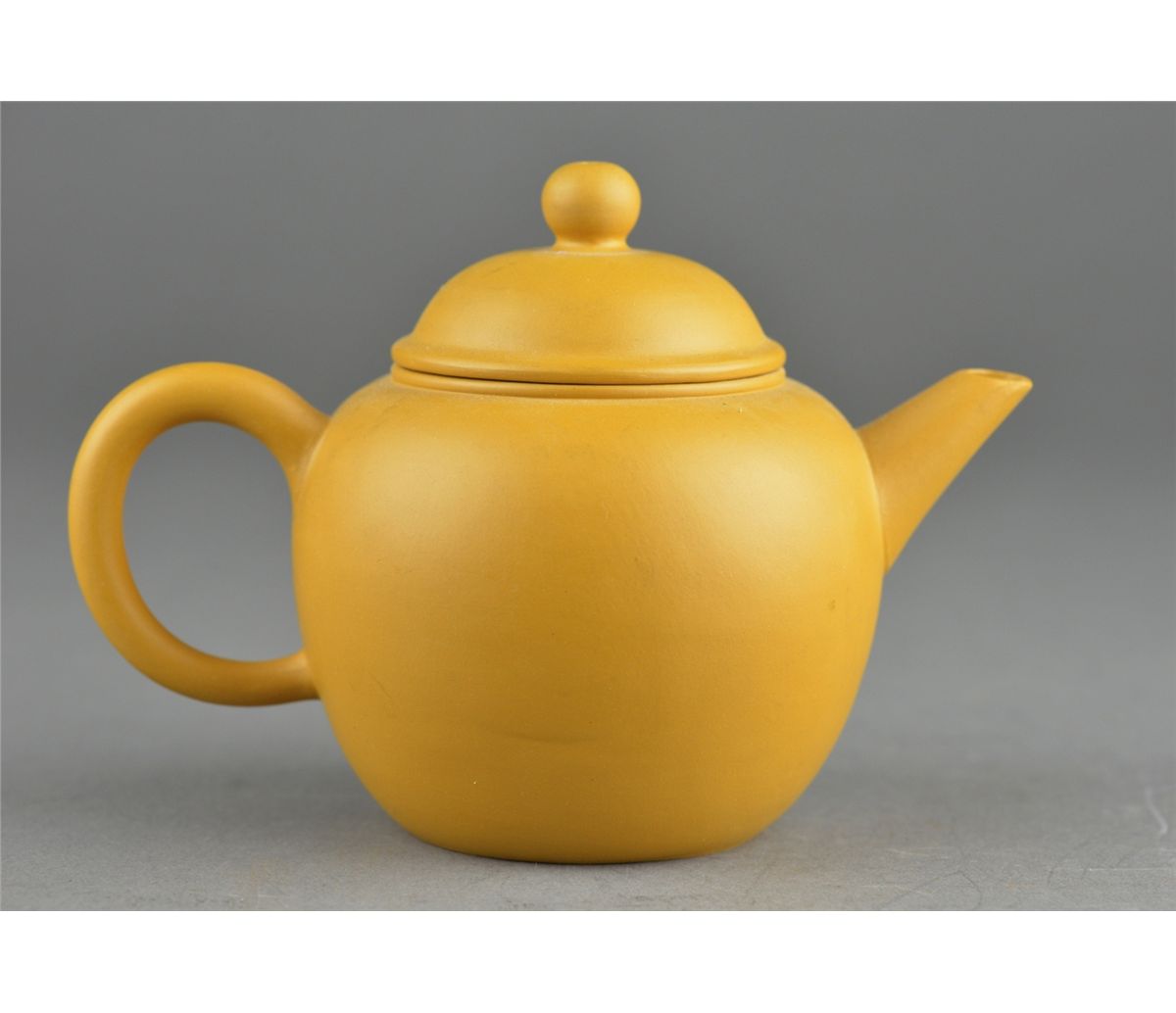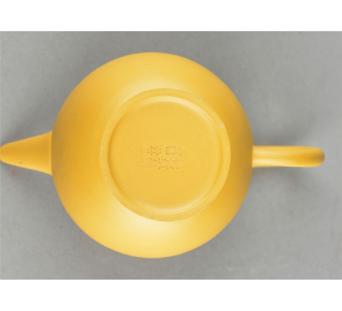 Chinese yellow Yixing pottery tea pot; ovoid body featuring handles and stout, with domed cover; nine-character mark on base; L: 13.5 cm, H: 9 cm, D: 8 cm; Provenance: Eastern Shen Collection, Toronto