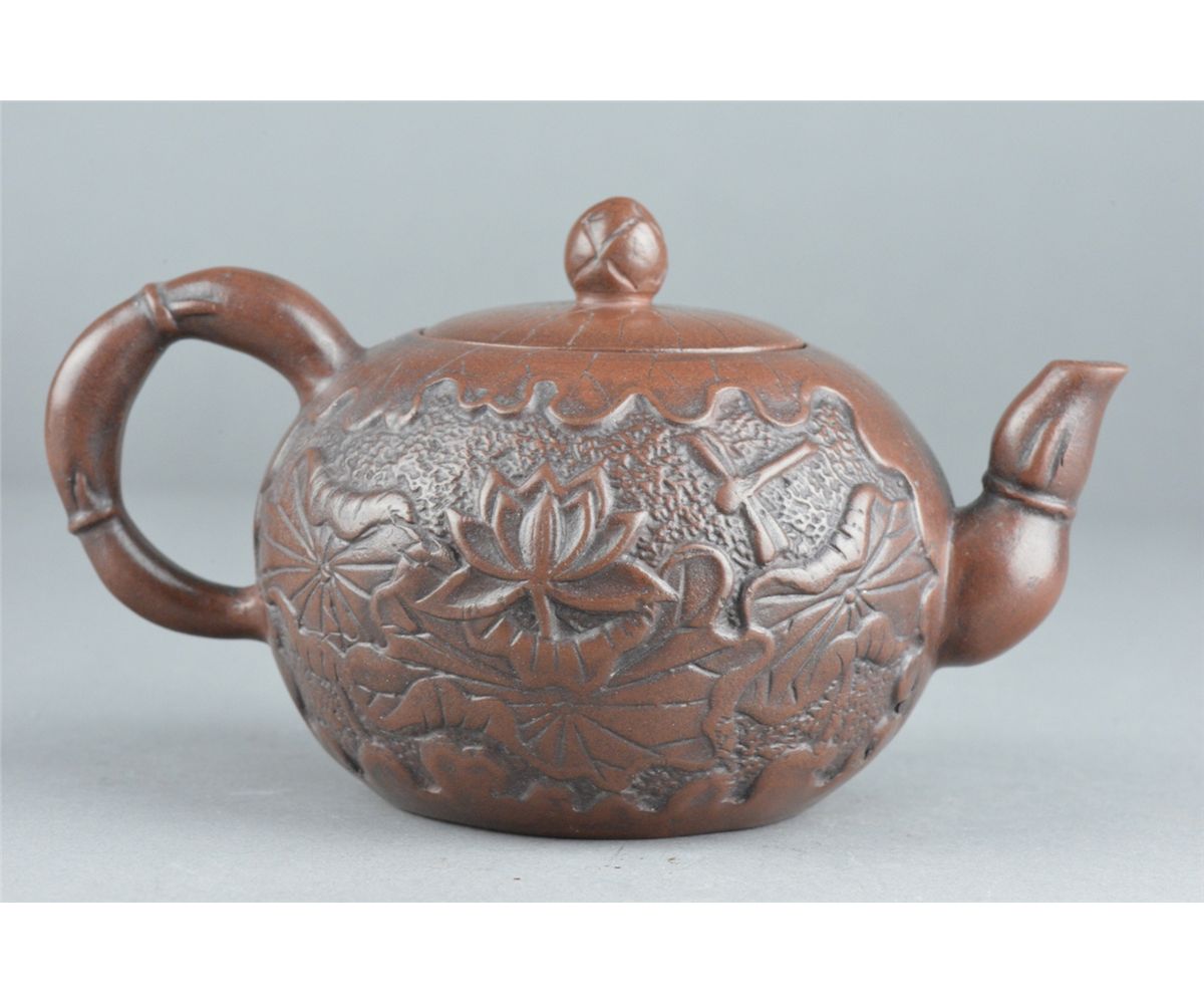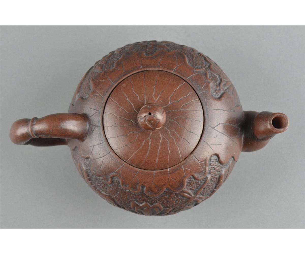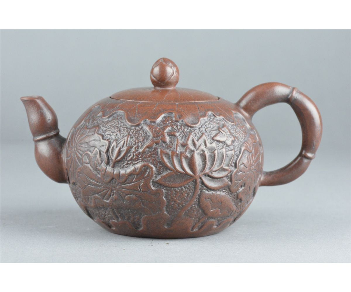 Chinese Yixing pottery tea pot; ovoid body featuring lotus motif in relief; marked on base; L: 18 cm, D: 10 cm, H: 9.25 cm
