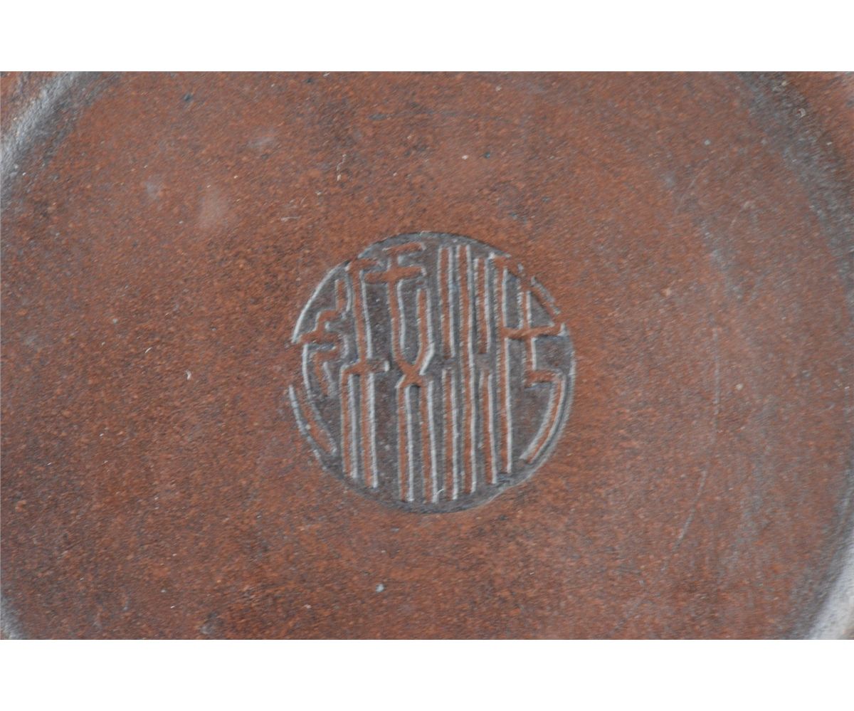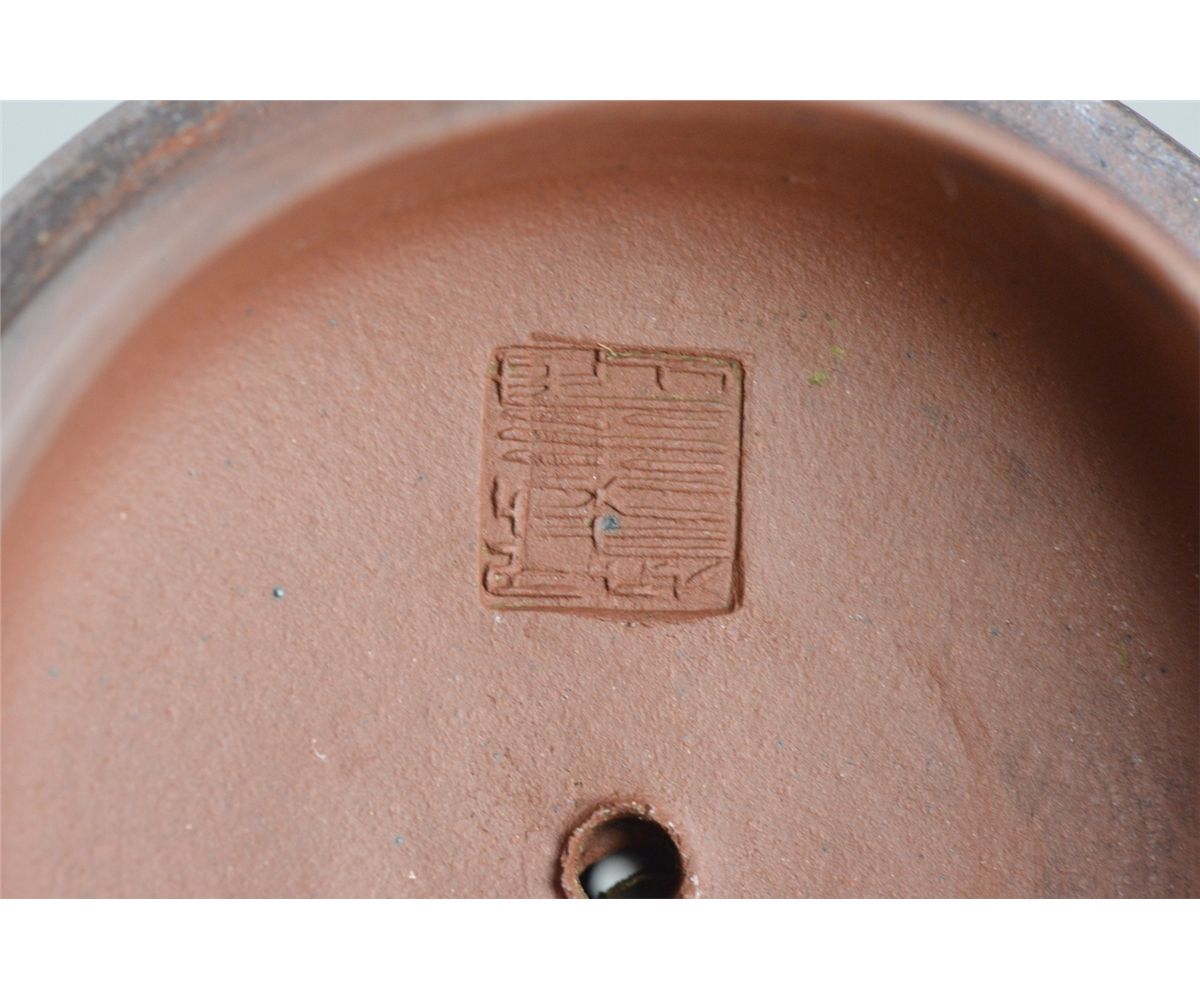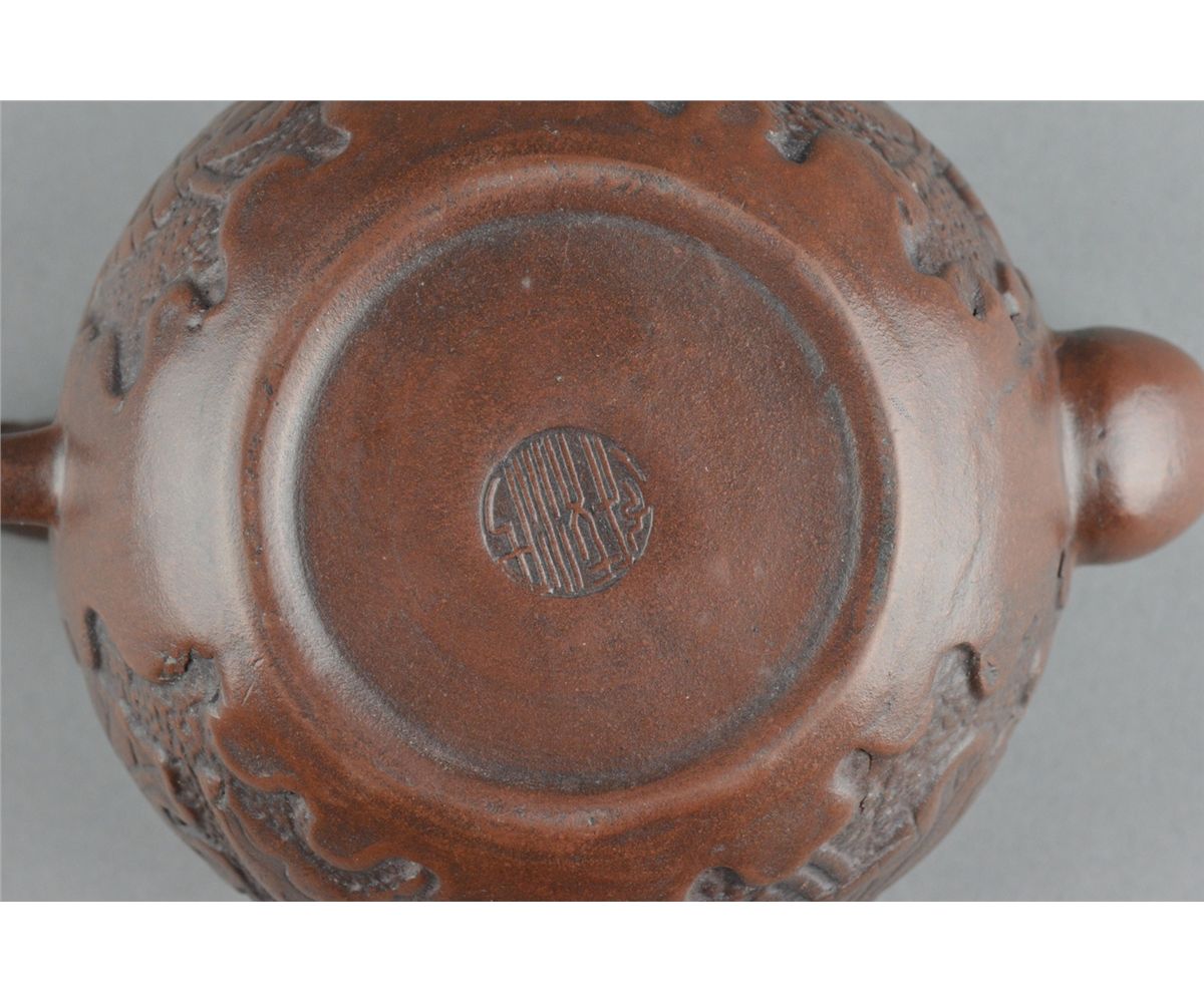 Chinese Yixing pottery tea pot; ovoid body featuring lotus motif in relief; marked on base; L: 18 cm, D: 10 cm, H: 9.25 cm
