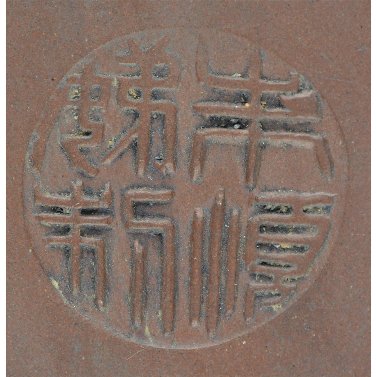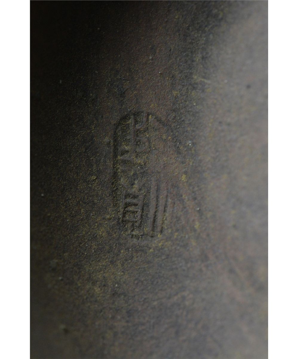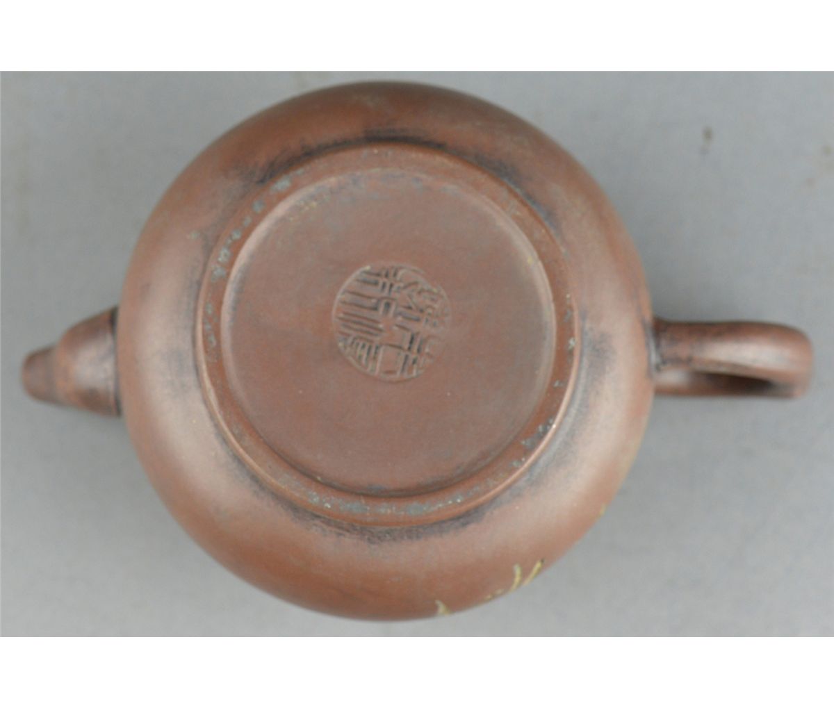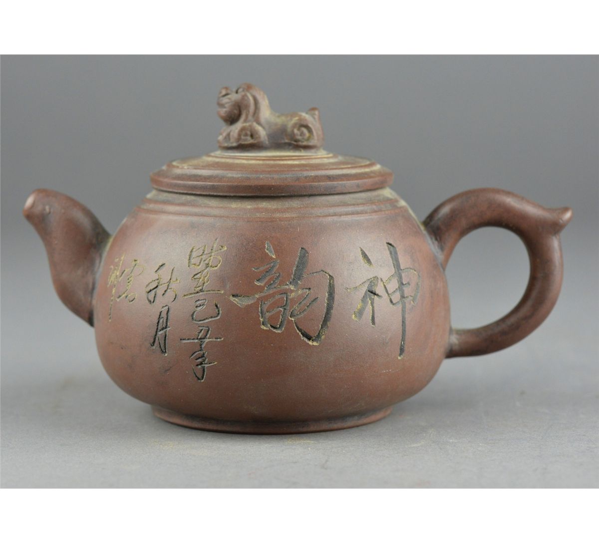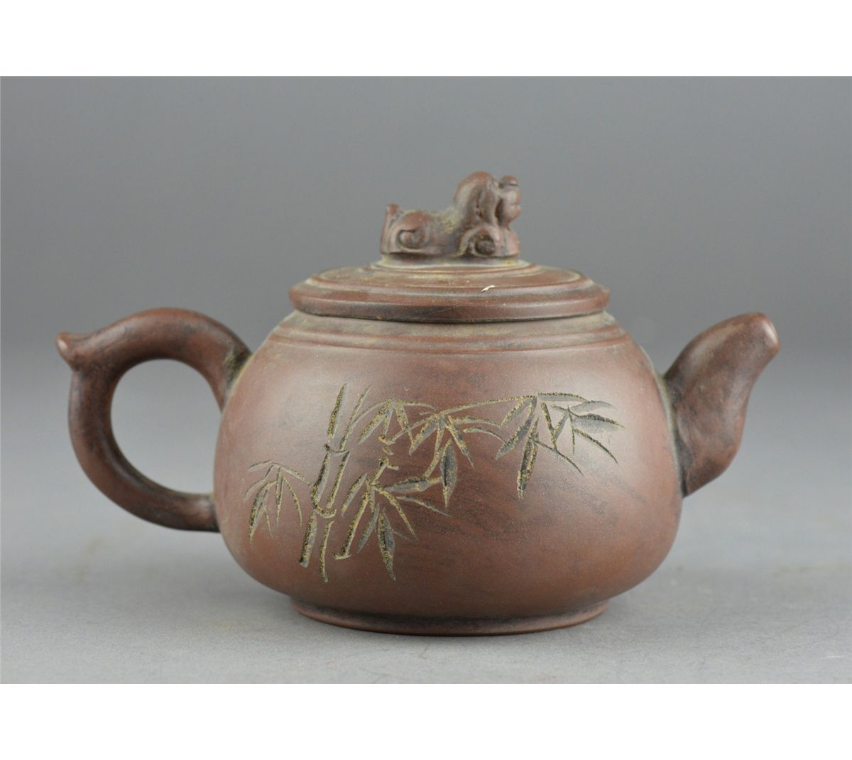 Chinese Yixing pottery tea pot; ovoid body featuring incised script and bamboo motif; four-character mark on base; L: 16 cm, D: 11 cm, H: 10.5 cm
