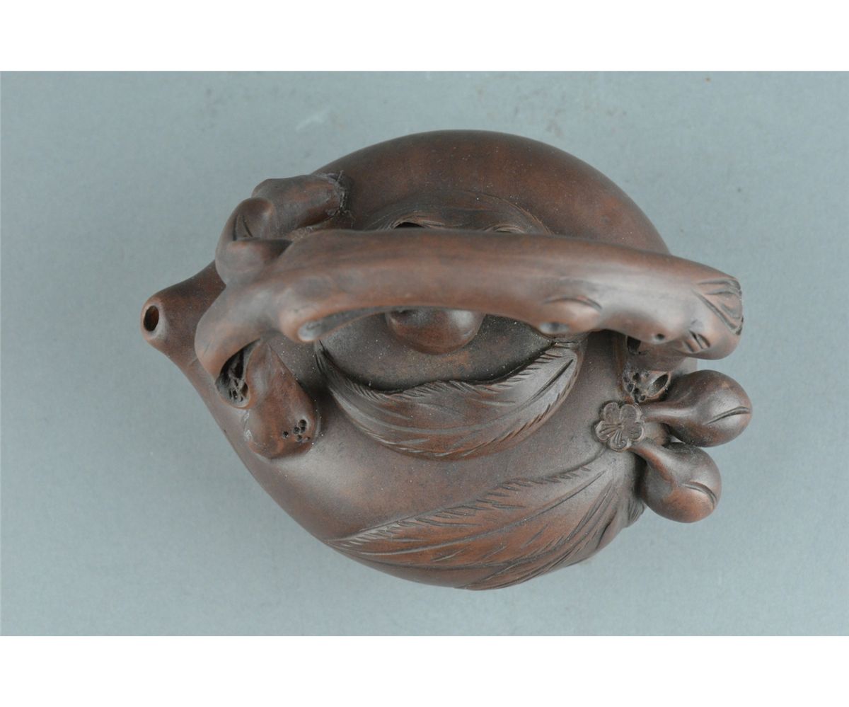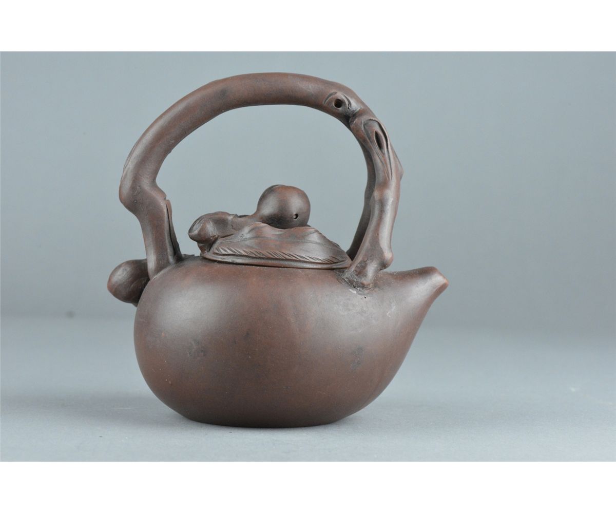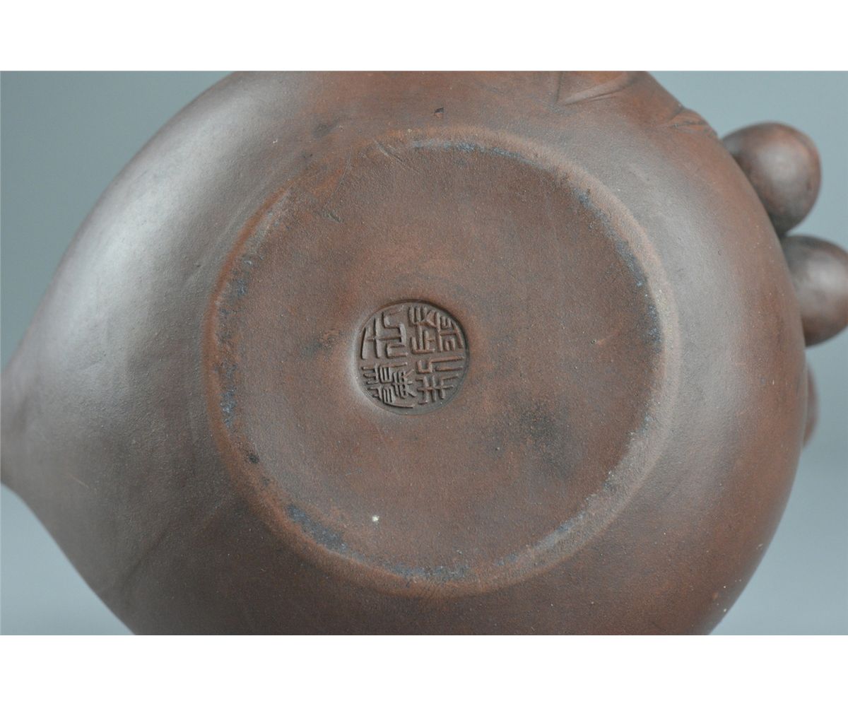Chinese Yixing pottery tea pot; naturalistic peach form with upright handle; four-character mark on base; L: 14 cm, D: 10 cm, H: 15.25 cm