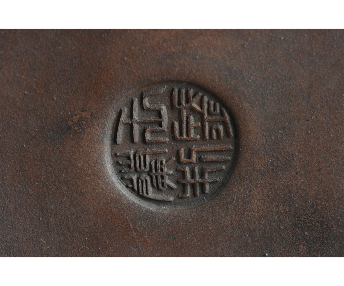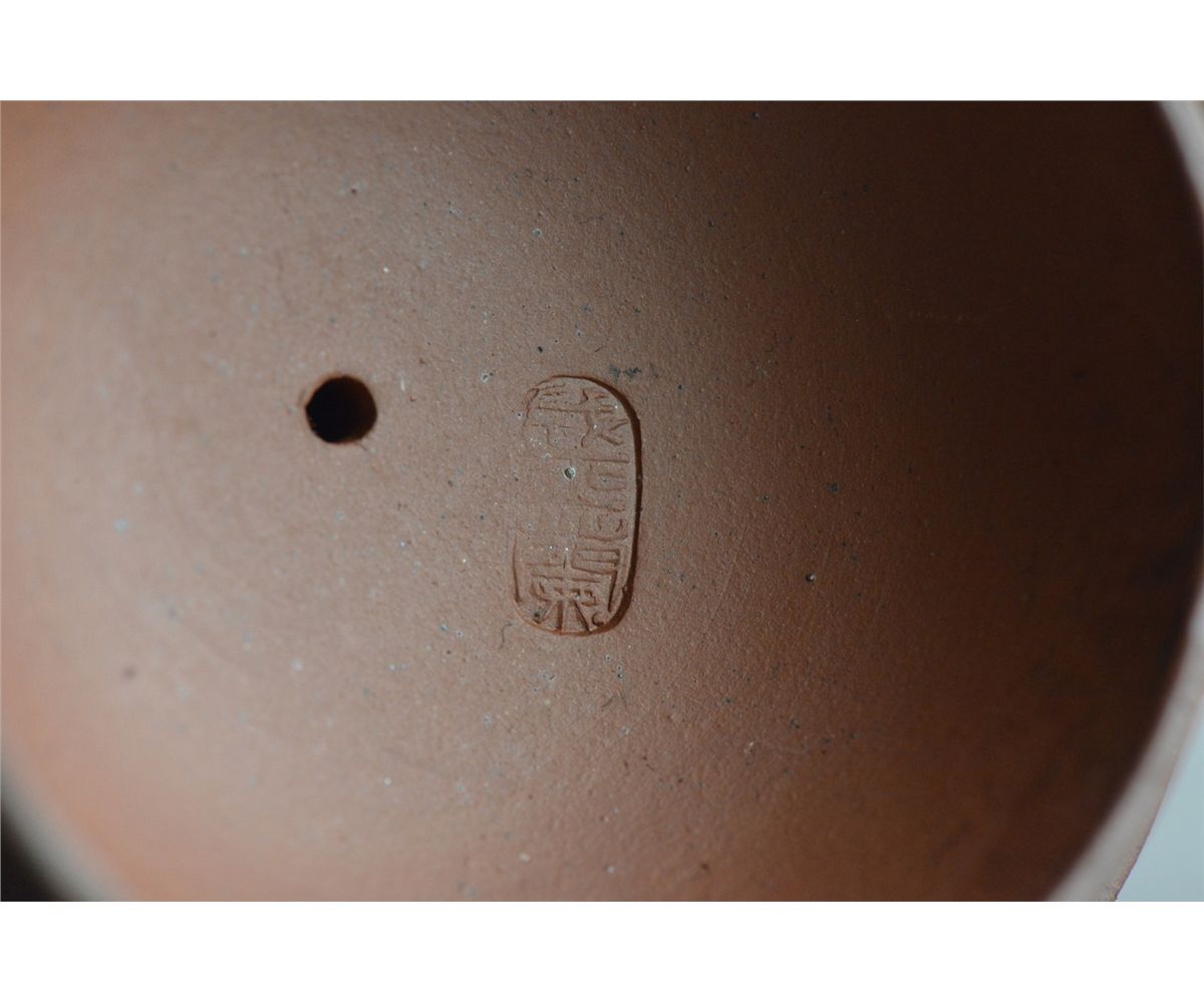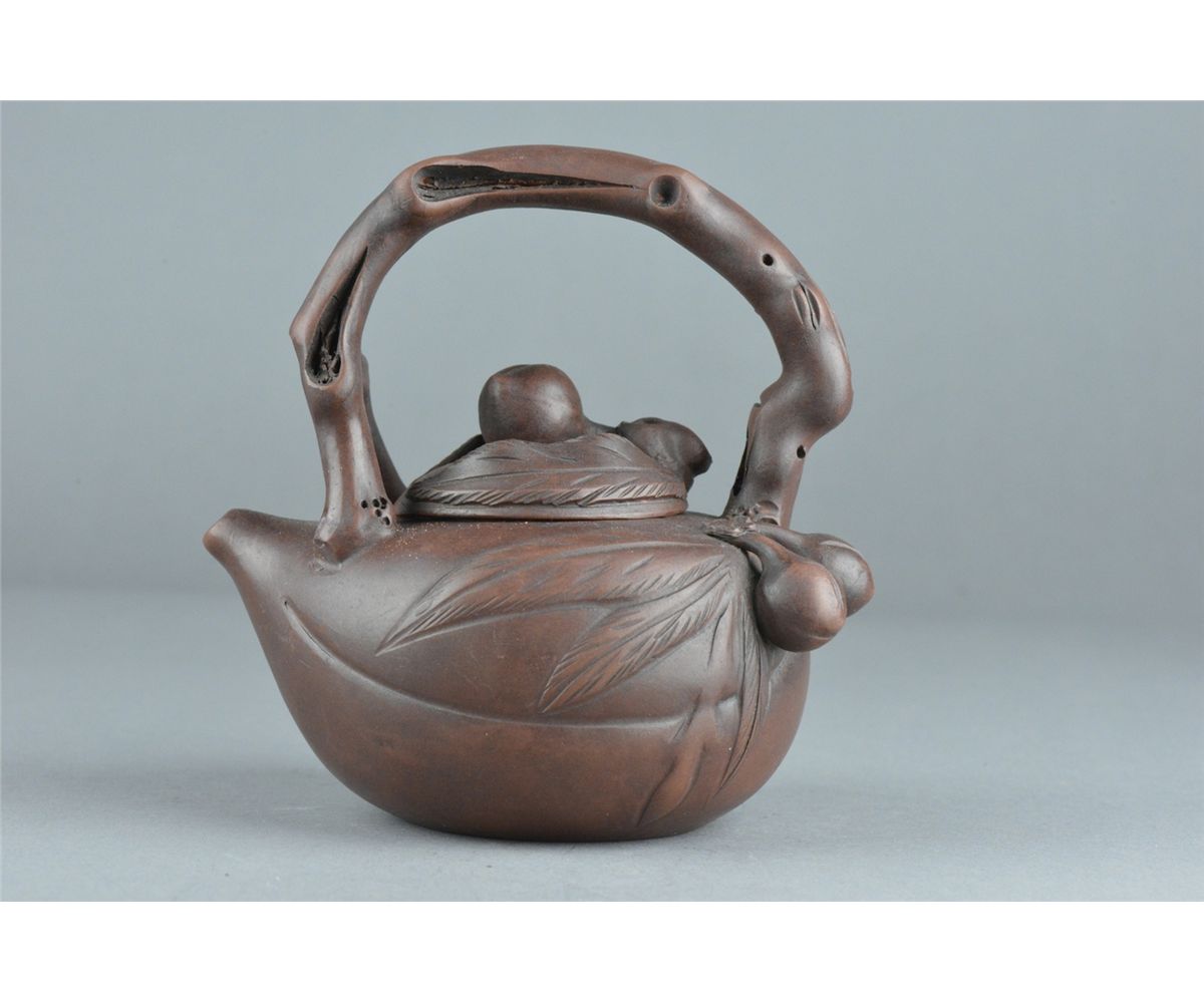 Chinese Yixing pottery tea pot; naturalistic peach form with upright handle; four-character mark on base; L: 14 cm, D: 10 cm, H: 15.25 cm