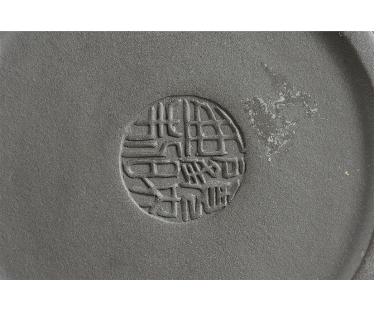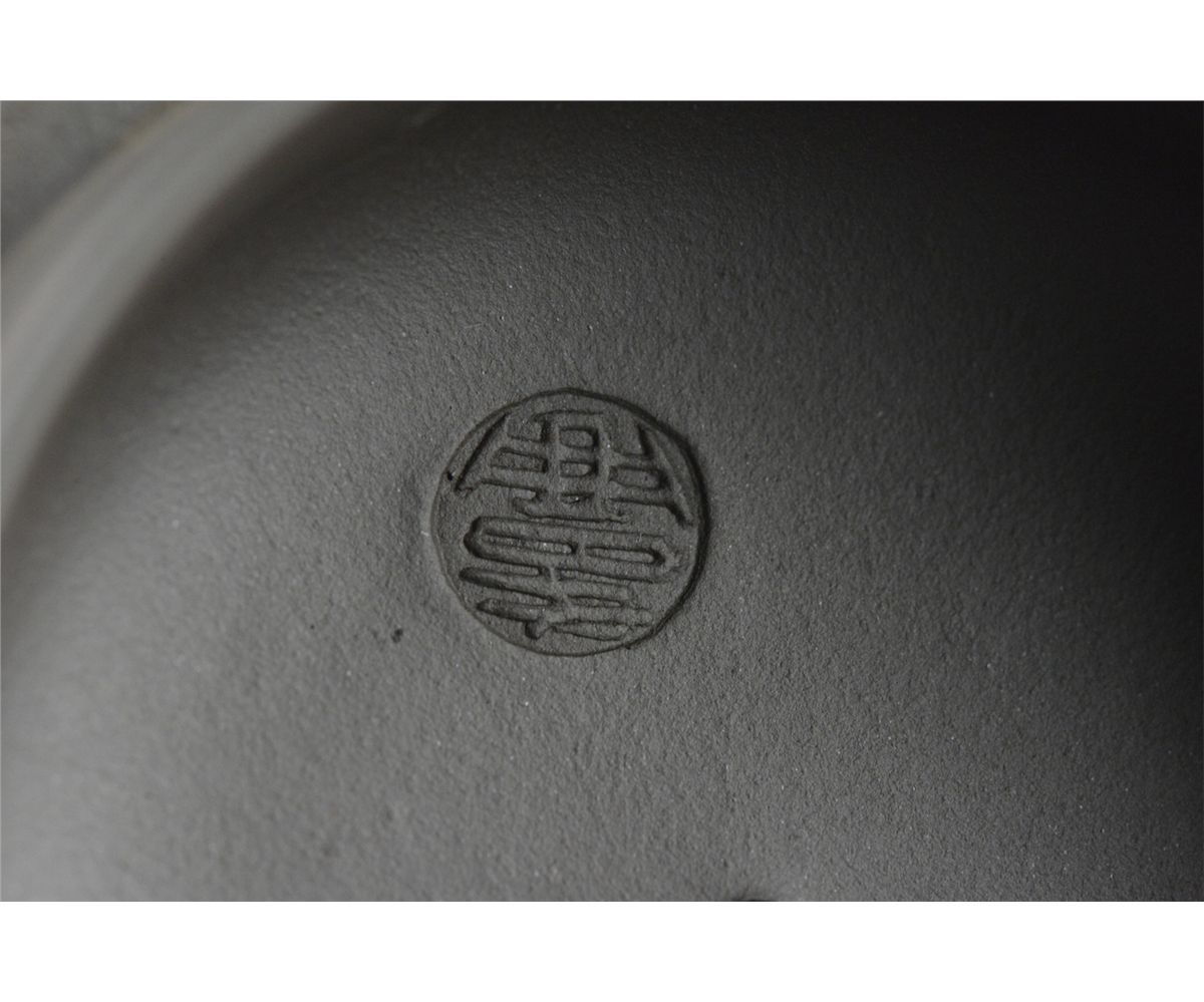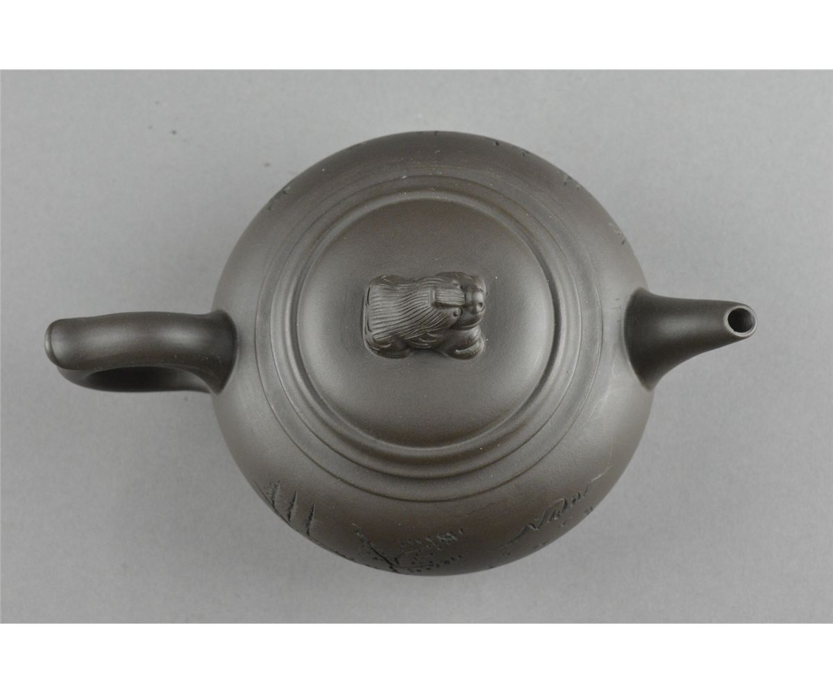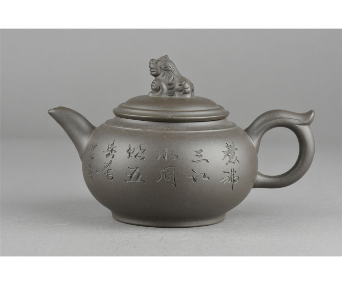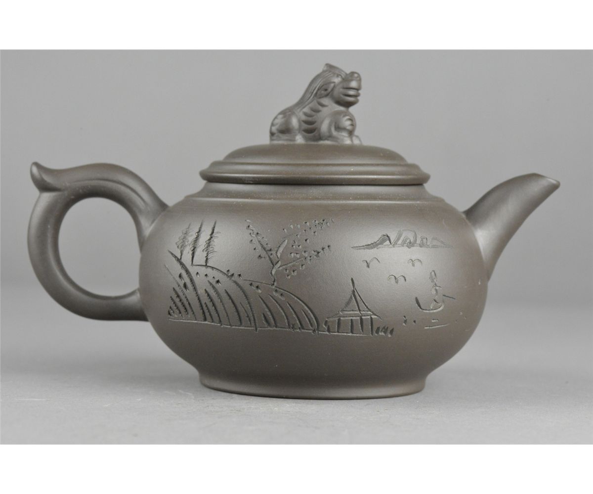 Chinese Yixing pottery tea pot; ovoid body with domed cover surmounted by fu lion; L: 16 cm, D: 11 cm, H: 10 cm