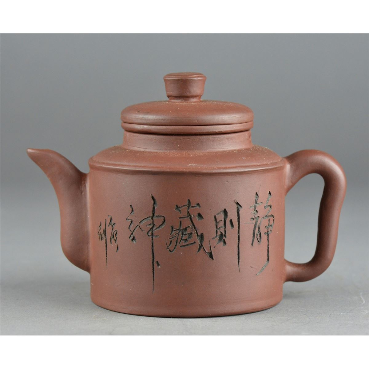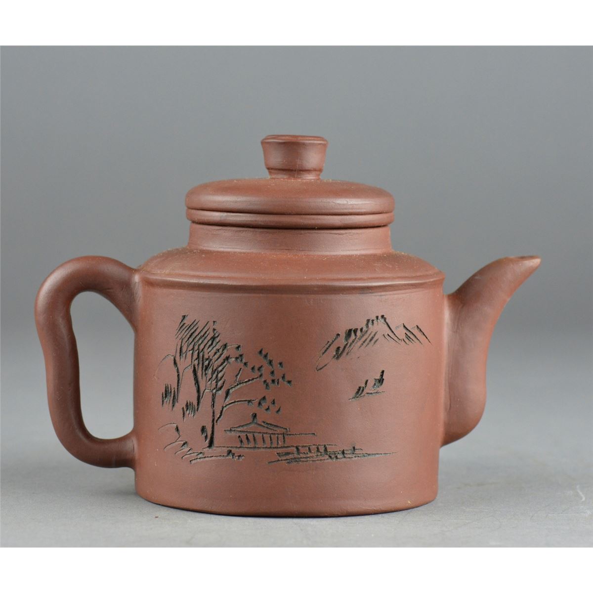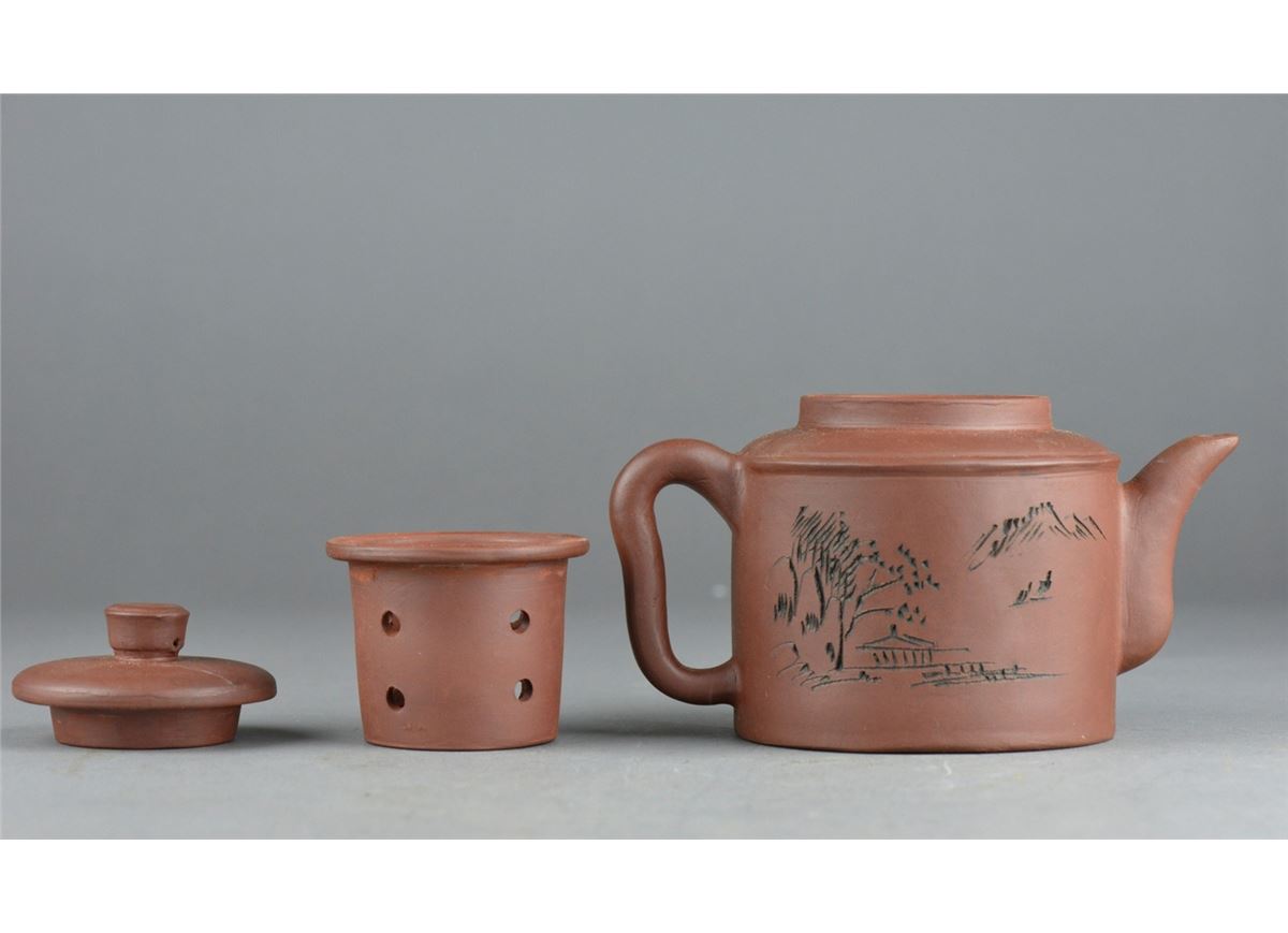 Chinese Yixing pottery tea pot; cylindrical body featuring script on sides along with landscape scene; tea pot also comes with strainer; four-character mark on base; D: 9.5 cm, H: 11 cm