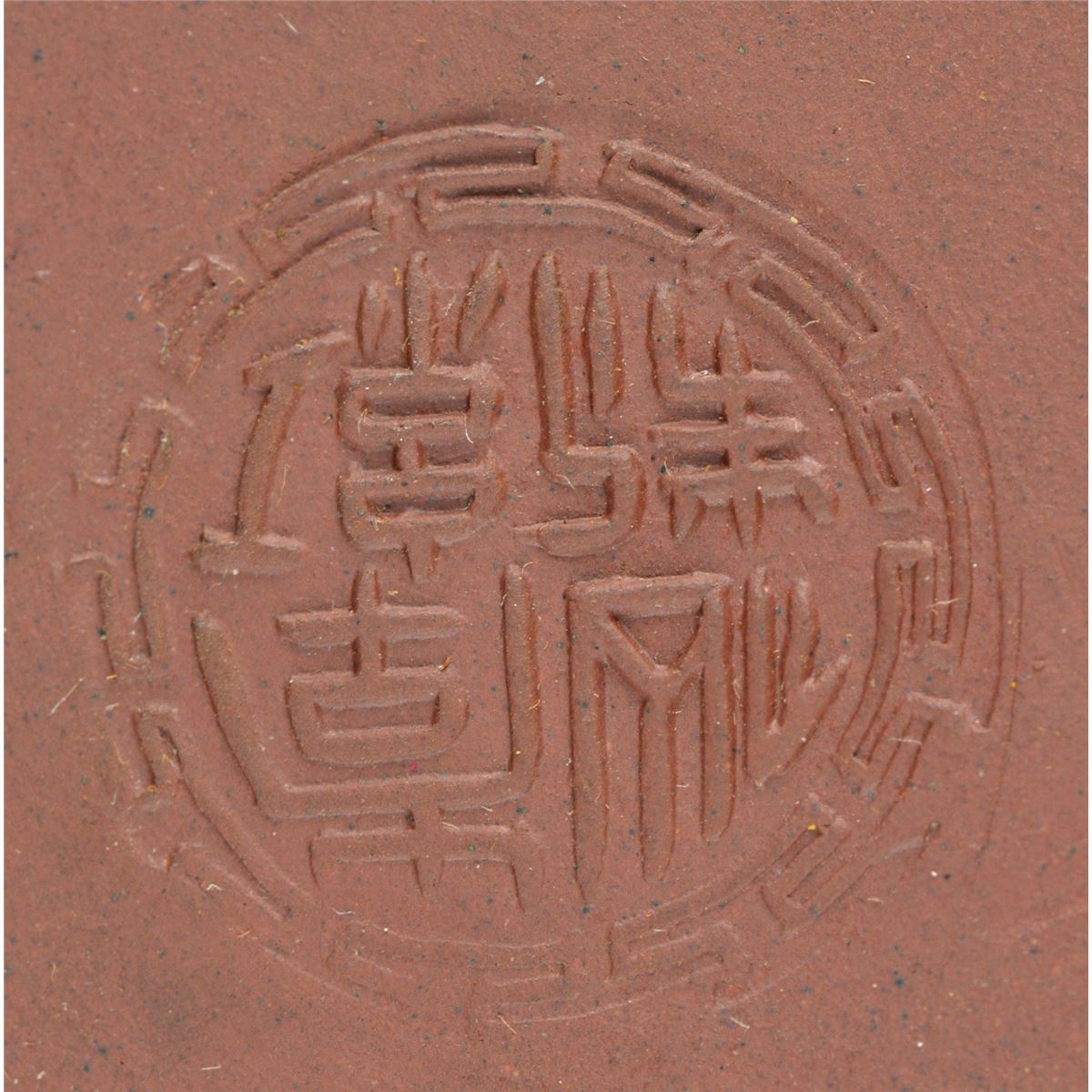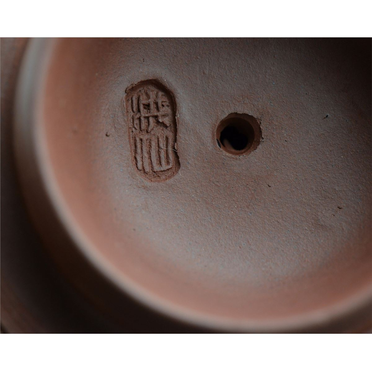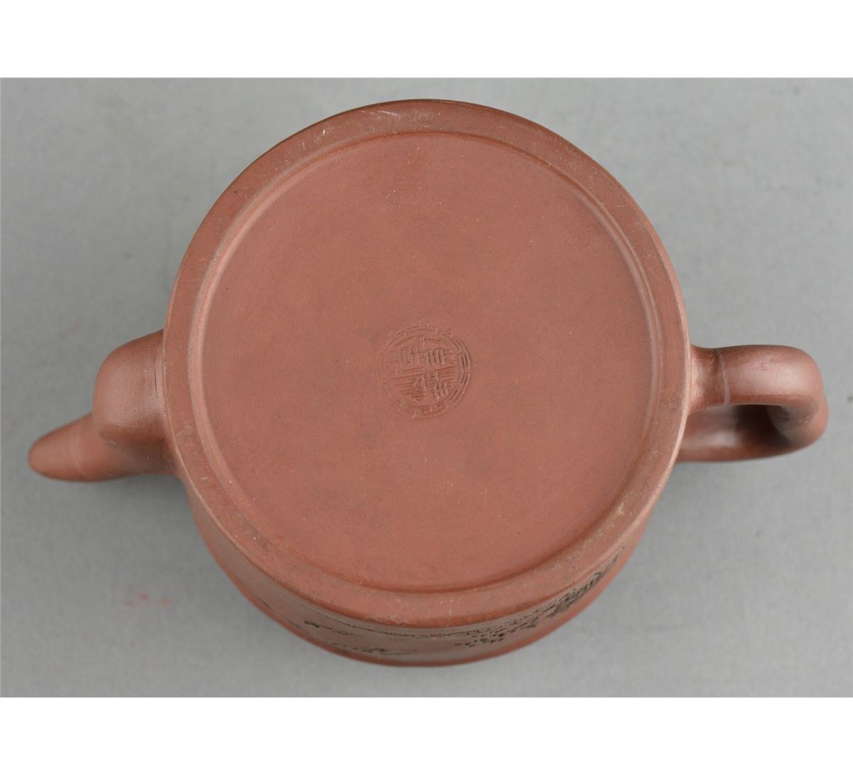 Chinese Yixing pottery tea pot; cylindrical body featuring script on sides along with landscape scene; tea pot also comes with strainer; four-character mark on base; D: 9.5 cm, H: 11 cm