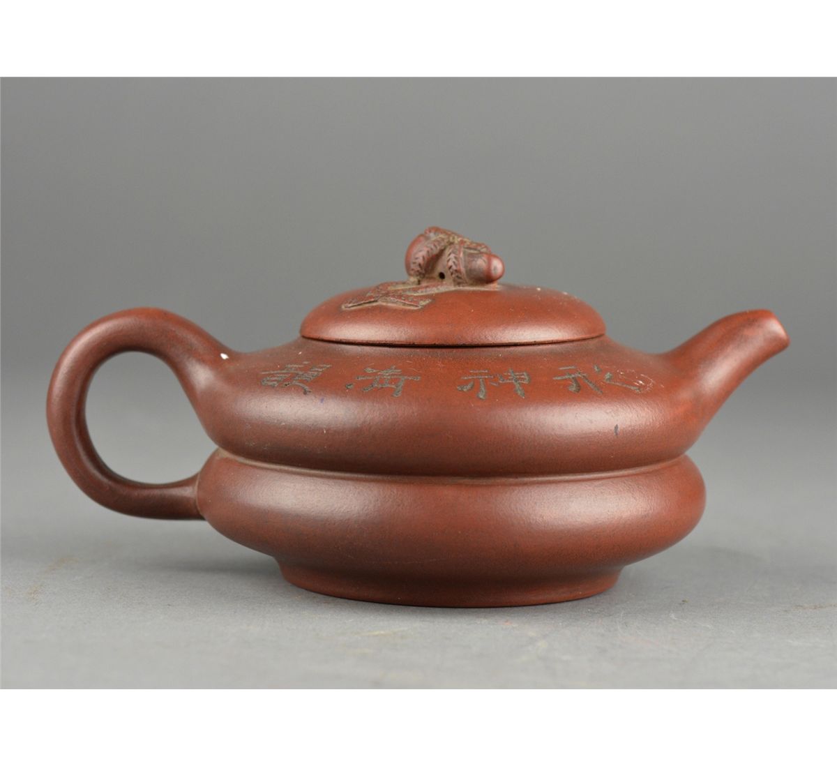 Chinese Yixing pottery tea pot; inscribed on shoulders of tea pot; six-character Qianlong Mark on base; L: 17 cm, D: 10 cm, H: 8.25 cm