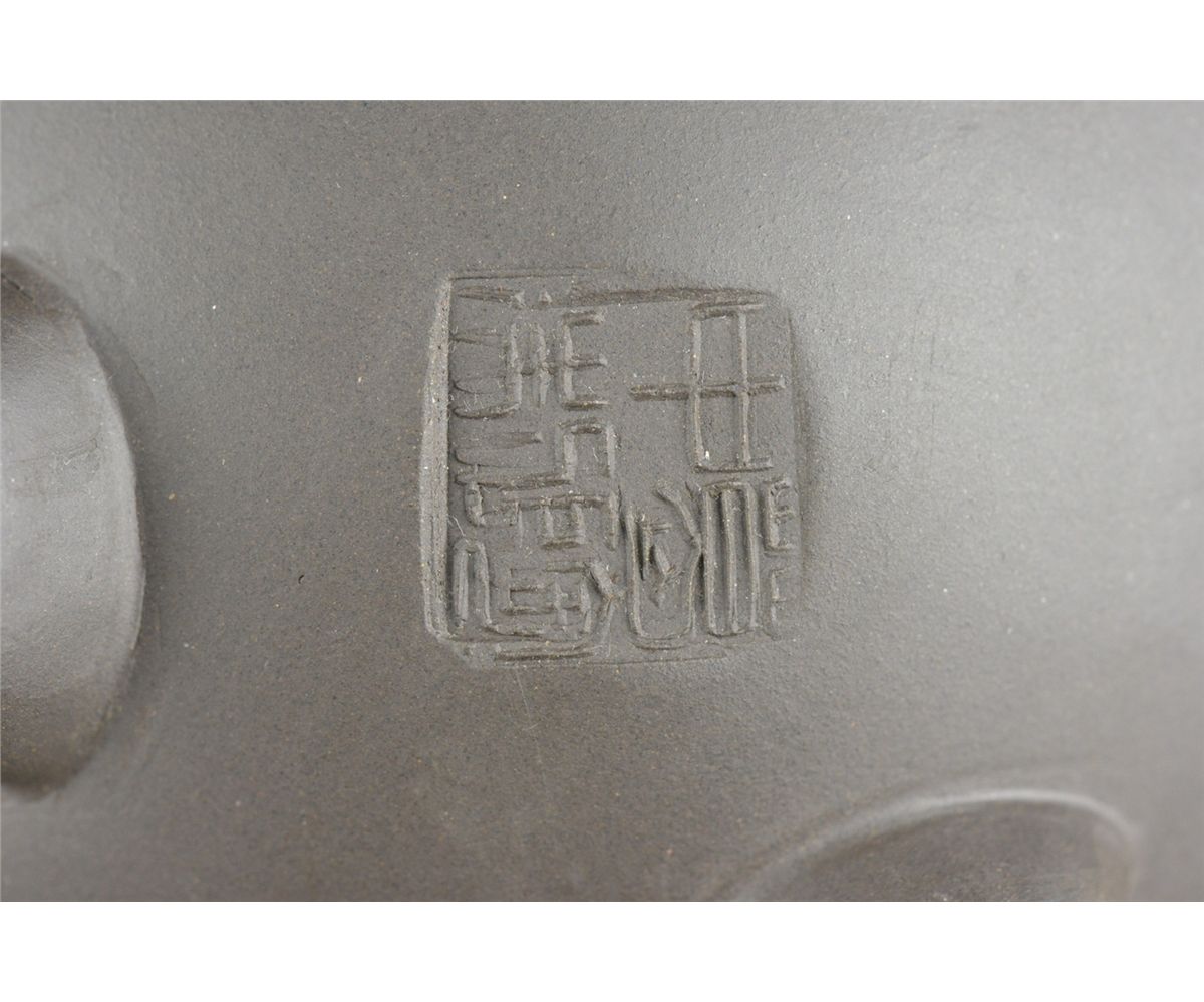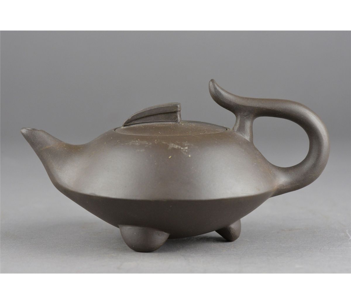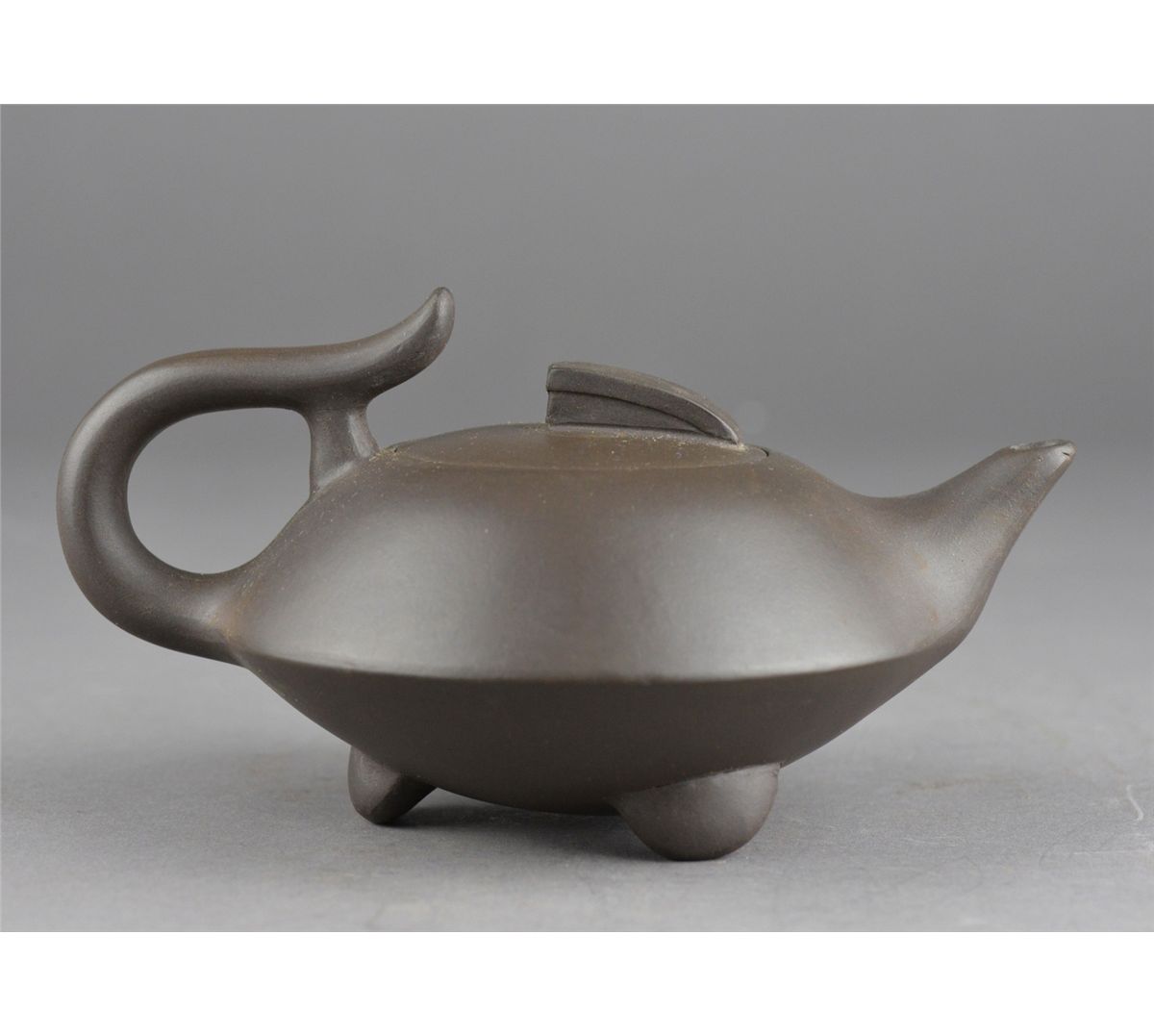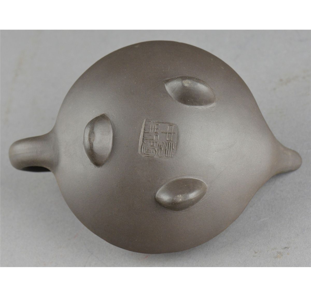 Chinese Yixing pottery tea pot; squat ovoid body with upright loop handle; four-character mark on base; L: 16 cm, D: 11 cm, H: 9 cm