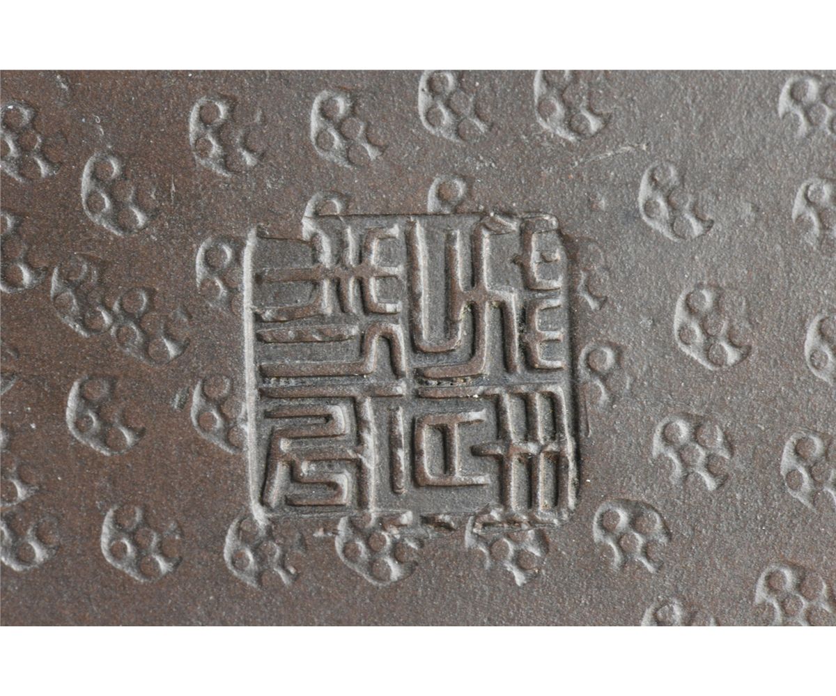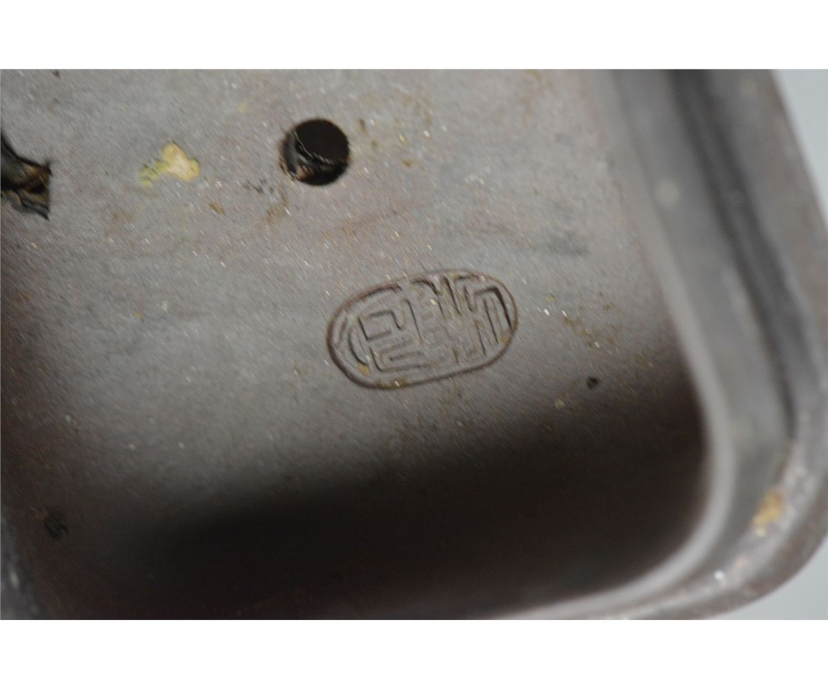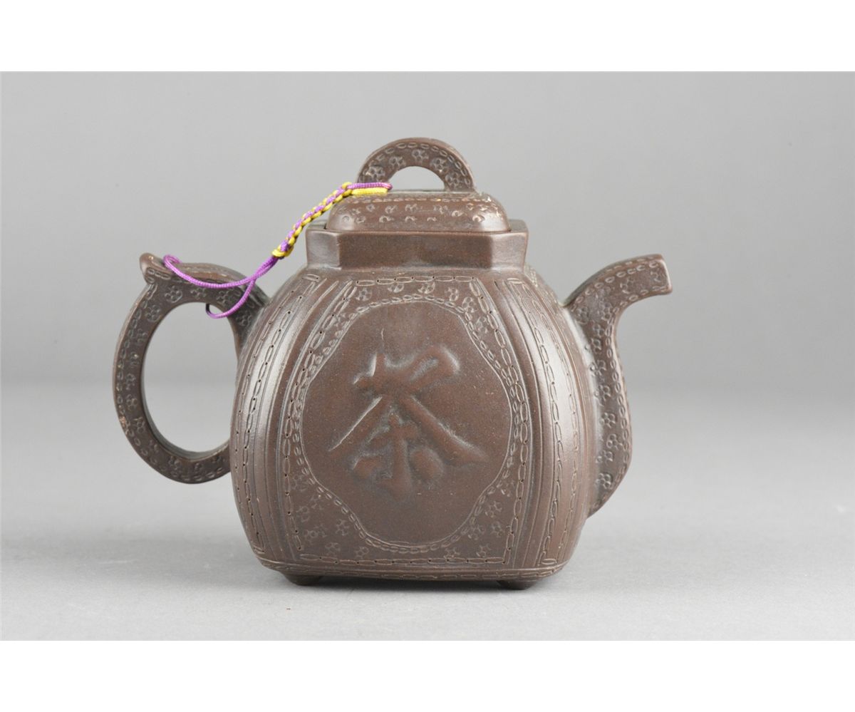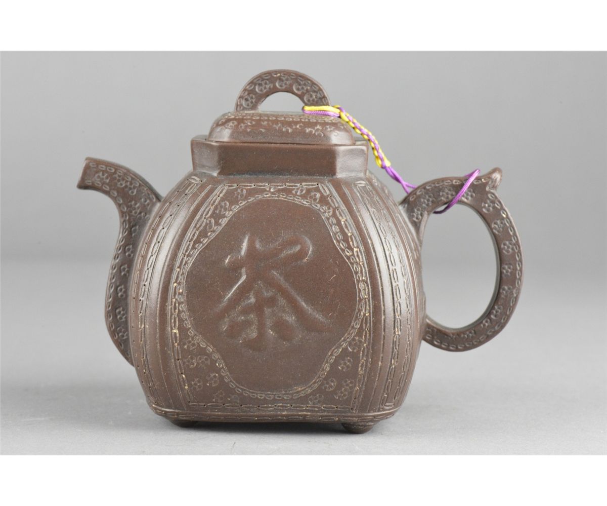 Chinese Yixing pottery tea pot; four-character mark on base; L: 14 cm, W: 7.75 cm, H: 10.25 cm