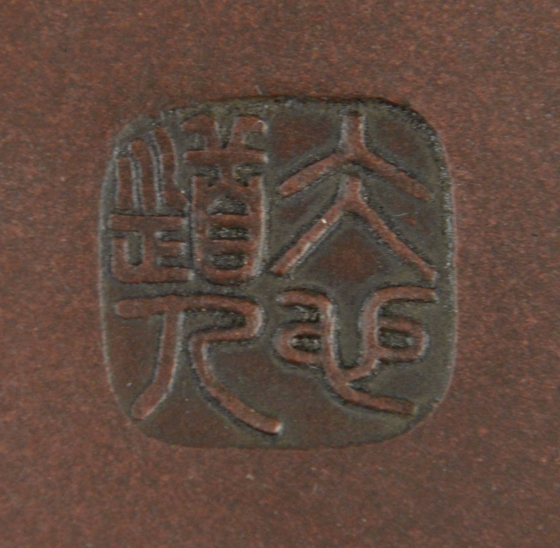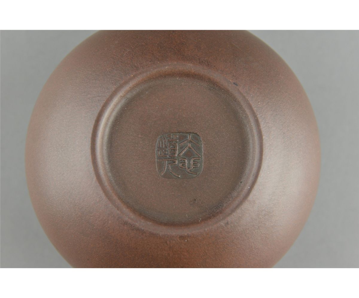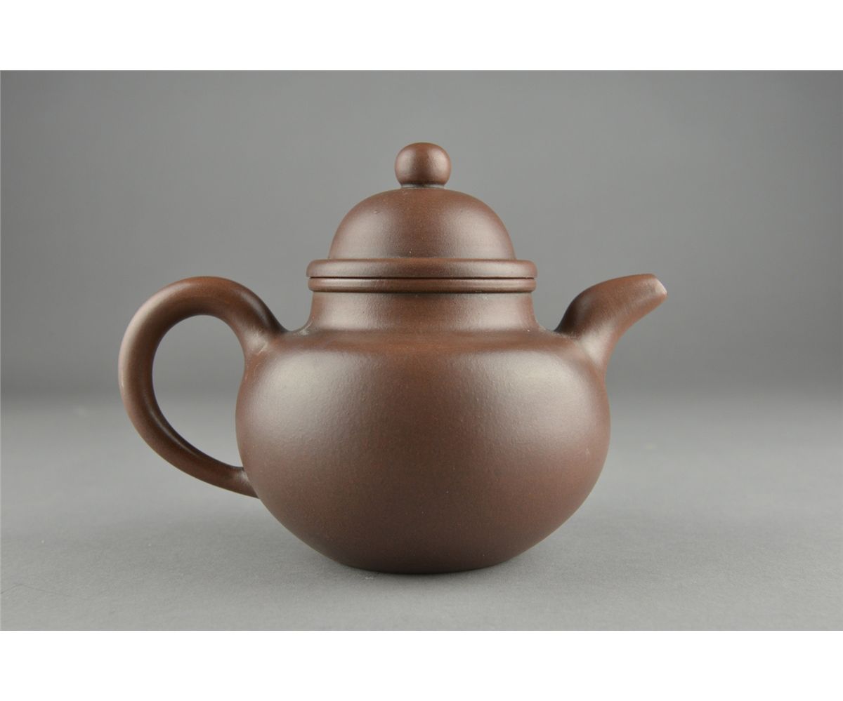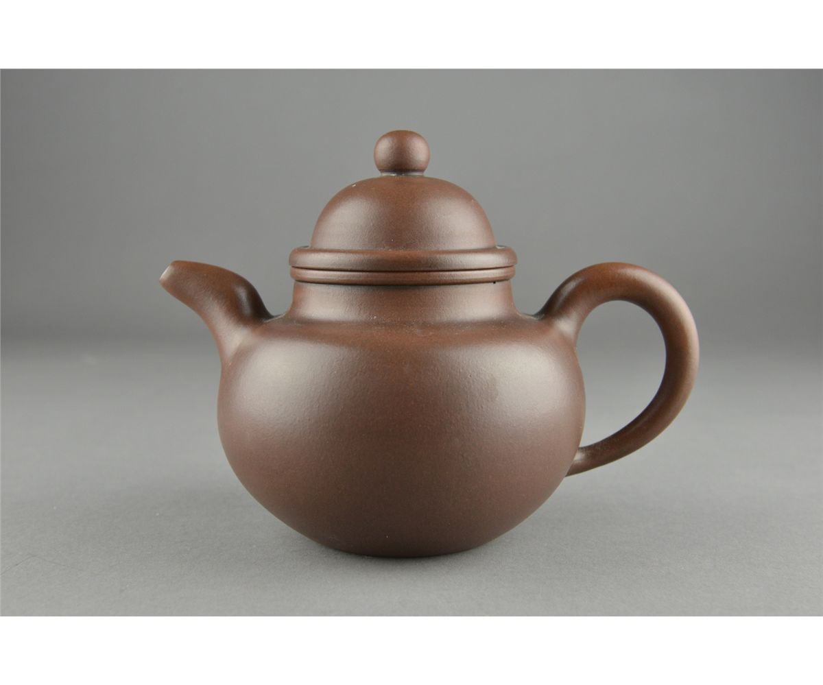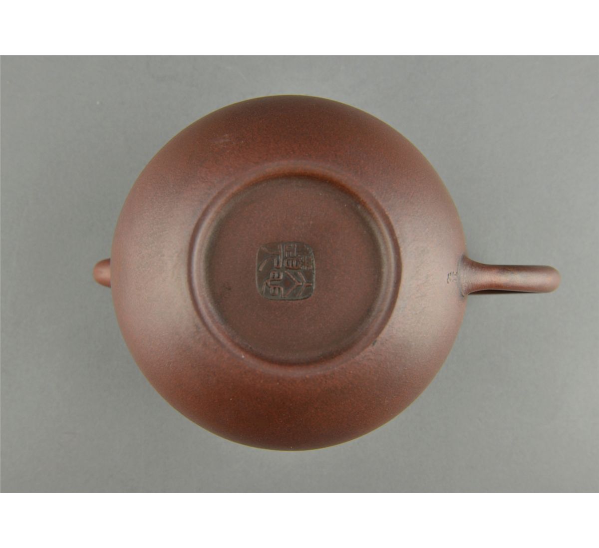 Chinese Yixing pottery tea pot; ovoid body with short stout and loop handle and domed cover; four-character mark on base; Provenance: Eastern Shen Collection, Toronto