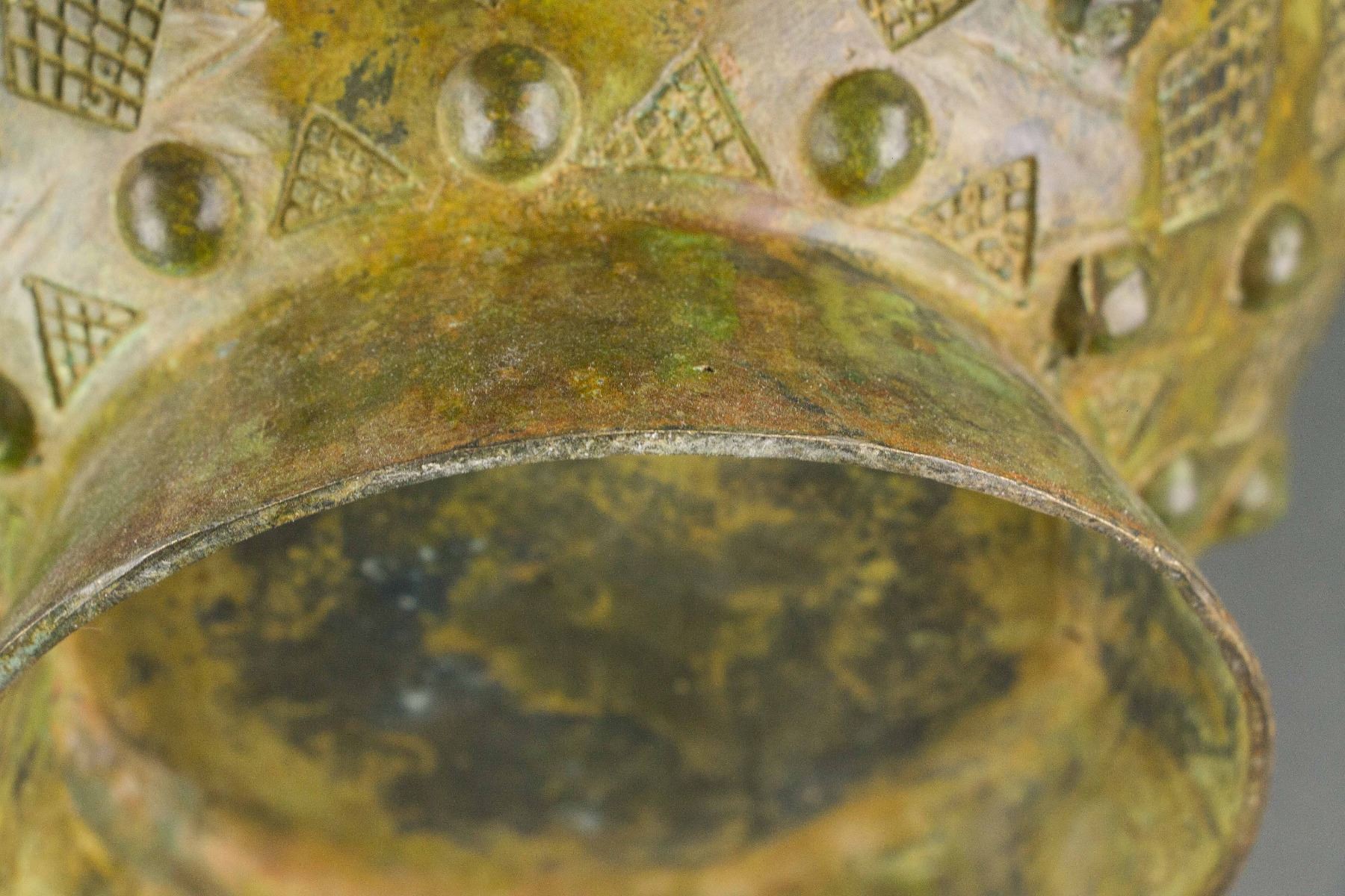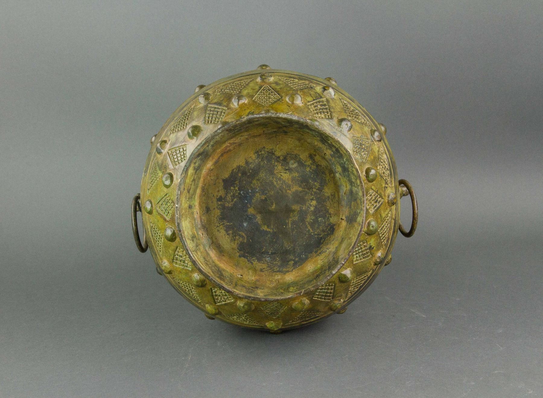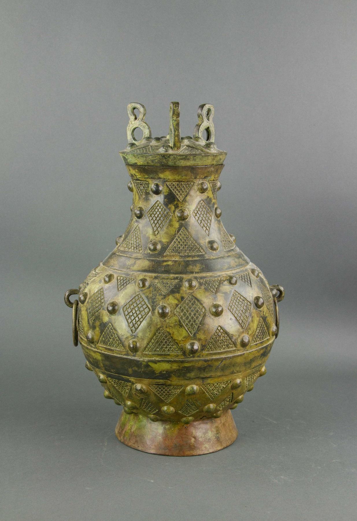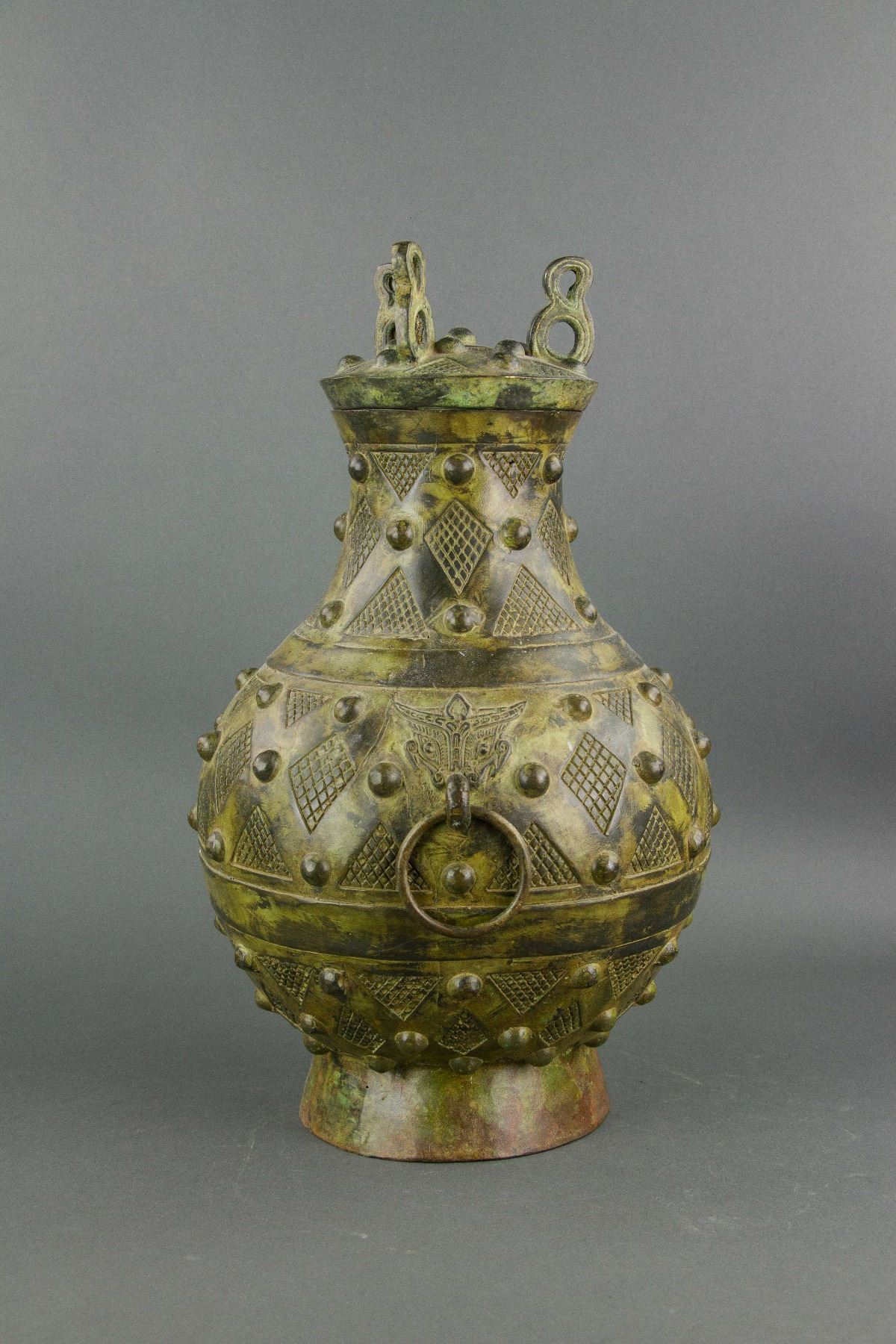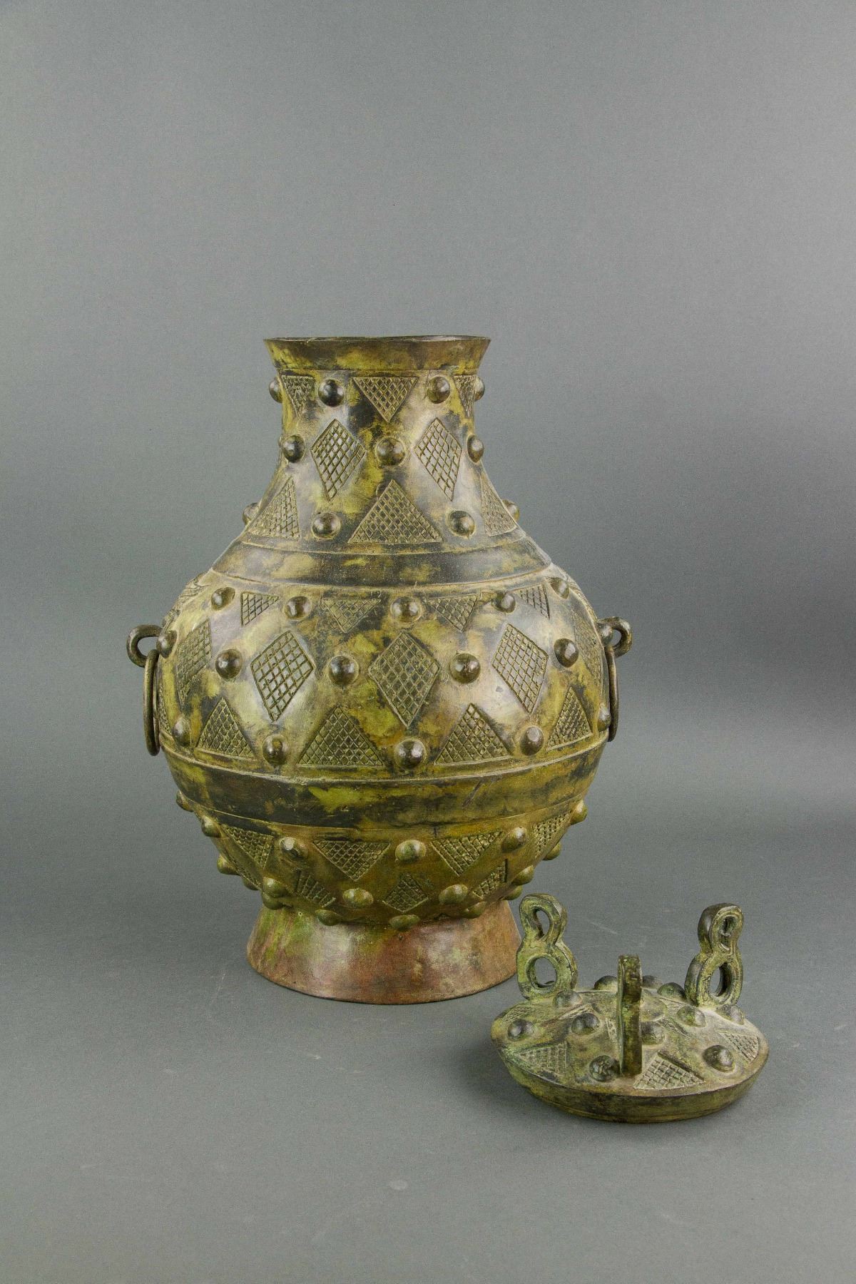 Chinese bronze vase; of globular body with cover; supported on splayed foot rim; flanked with two ring handles with rings; decorated with dots and geometric pattern; cover has three knobs; Yuan/ Ming period; H: 42 cm, D: 26 cm, 4 kilograms. PROVENANCE: Private collection (Nagoya, Japan)