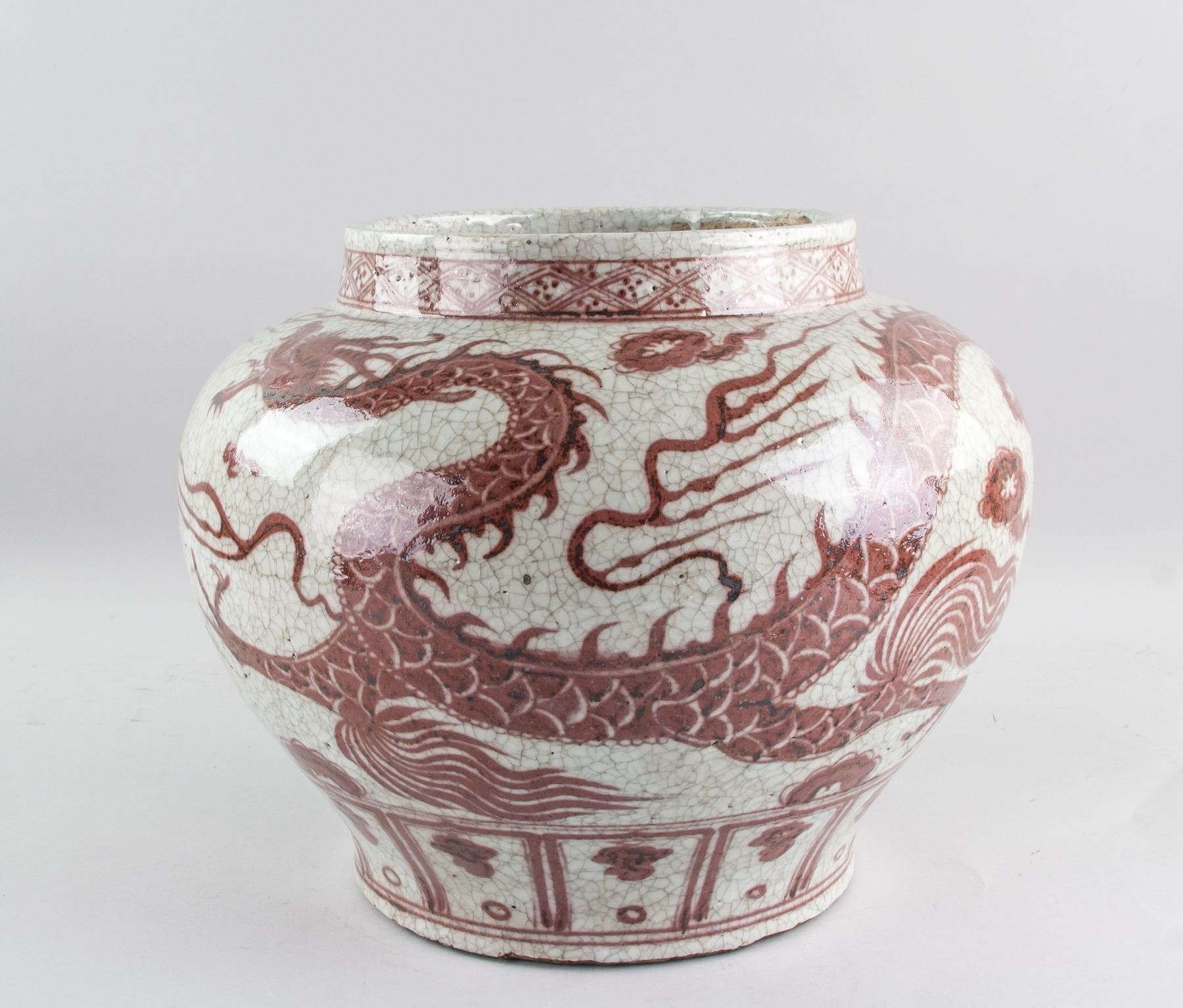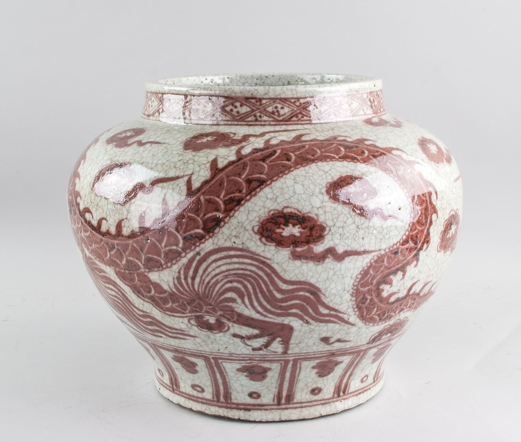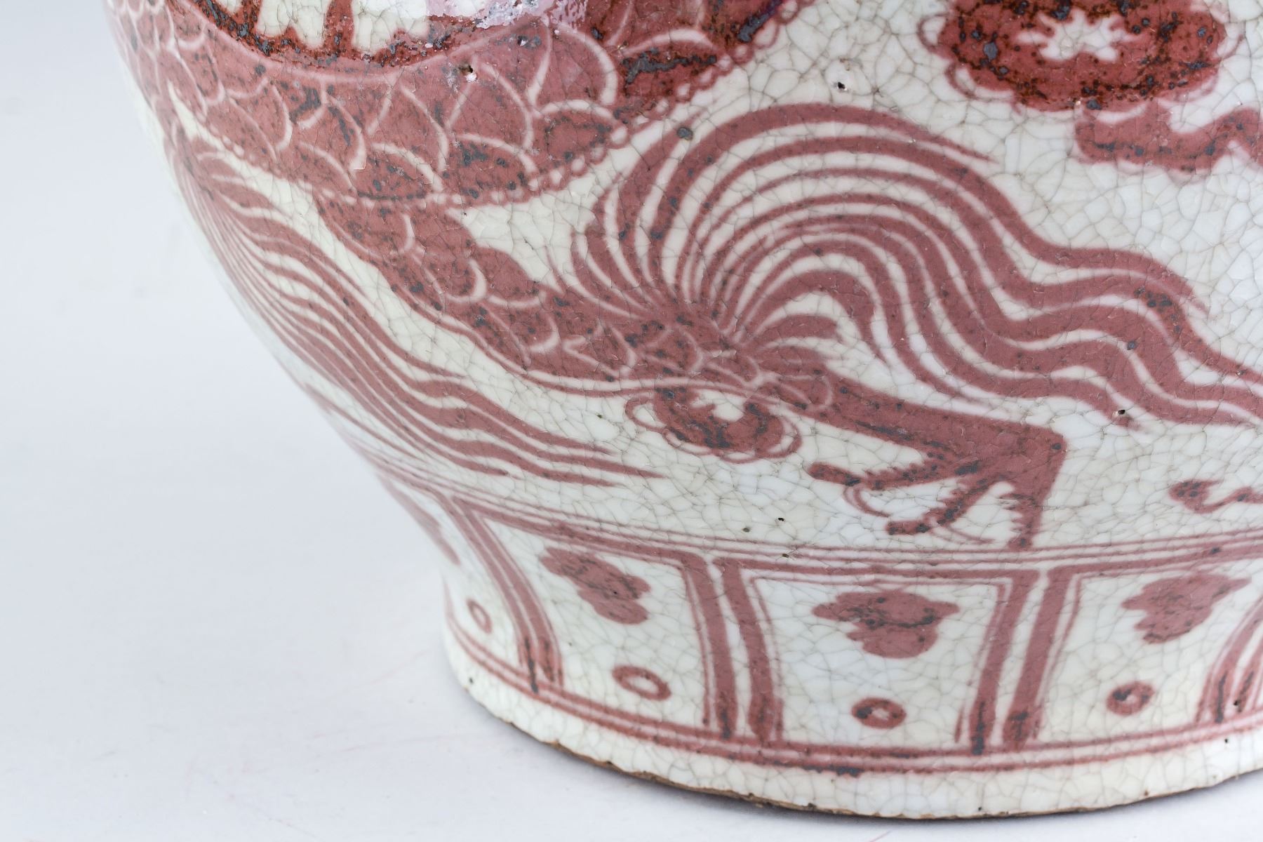 Chinese Yuan/Ming style copper red porcelain jar; of globular body, tapering to bottom; painted with dragon and fireballs; decorated with geometric patter; covered by crackle glaze; 29 x 32 cm, 5 kilograms